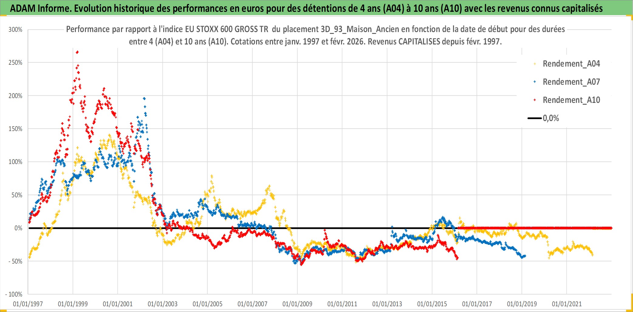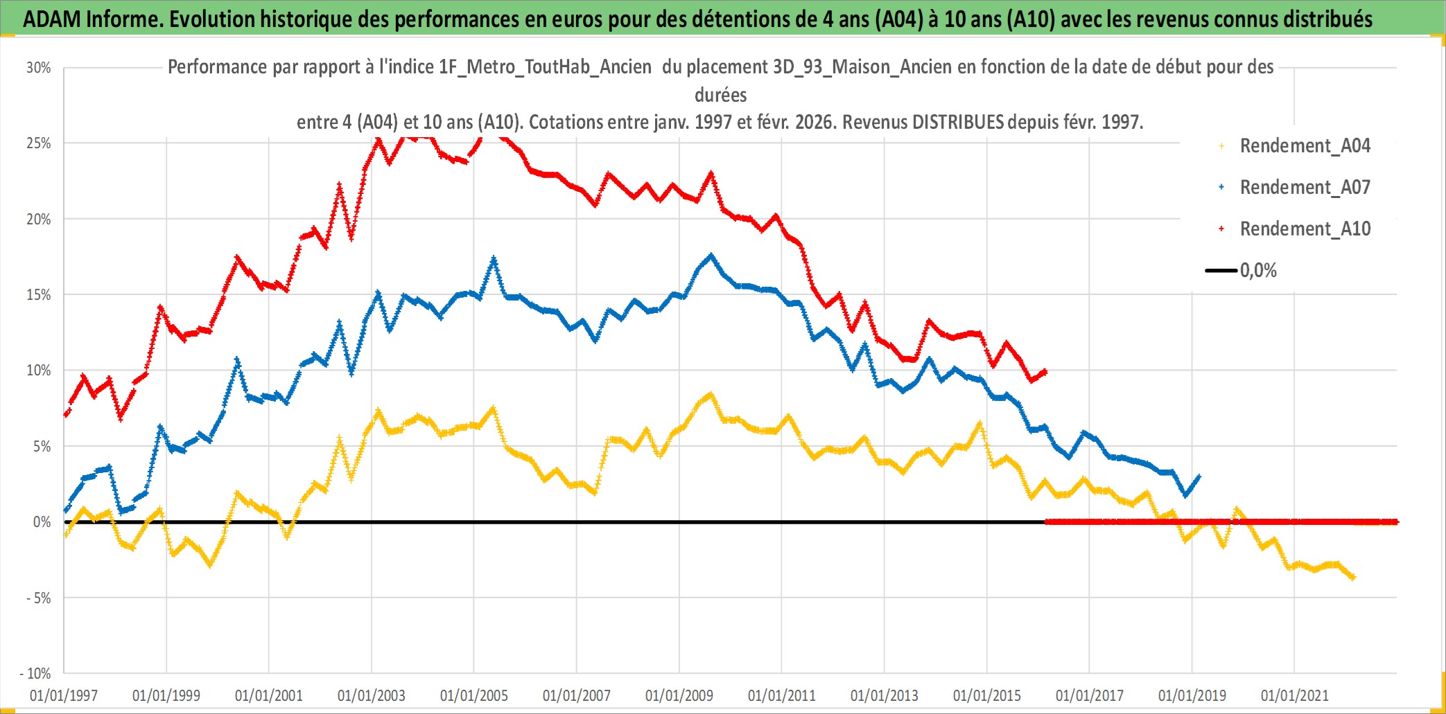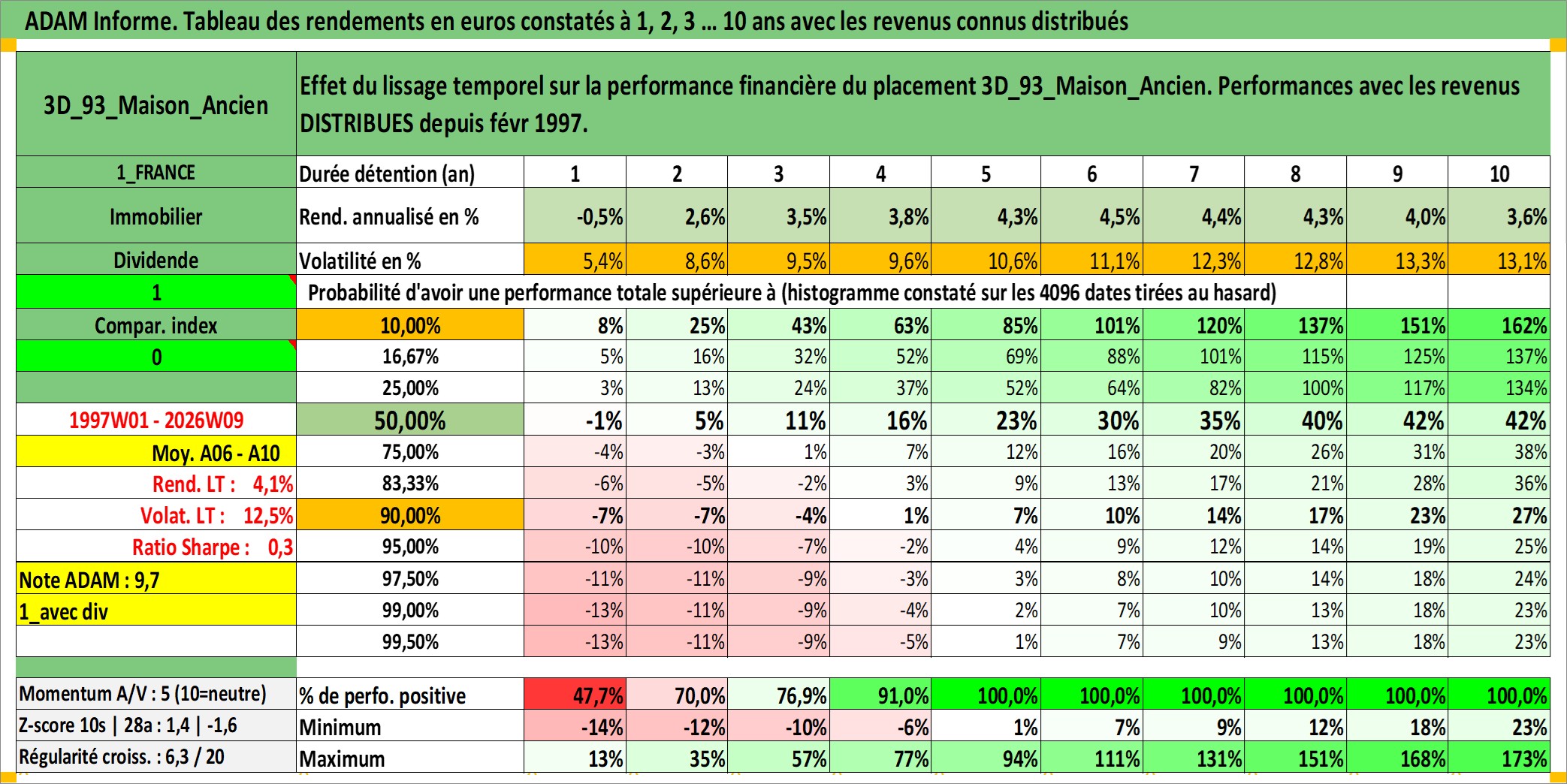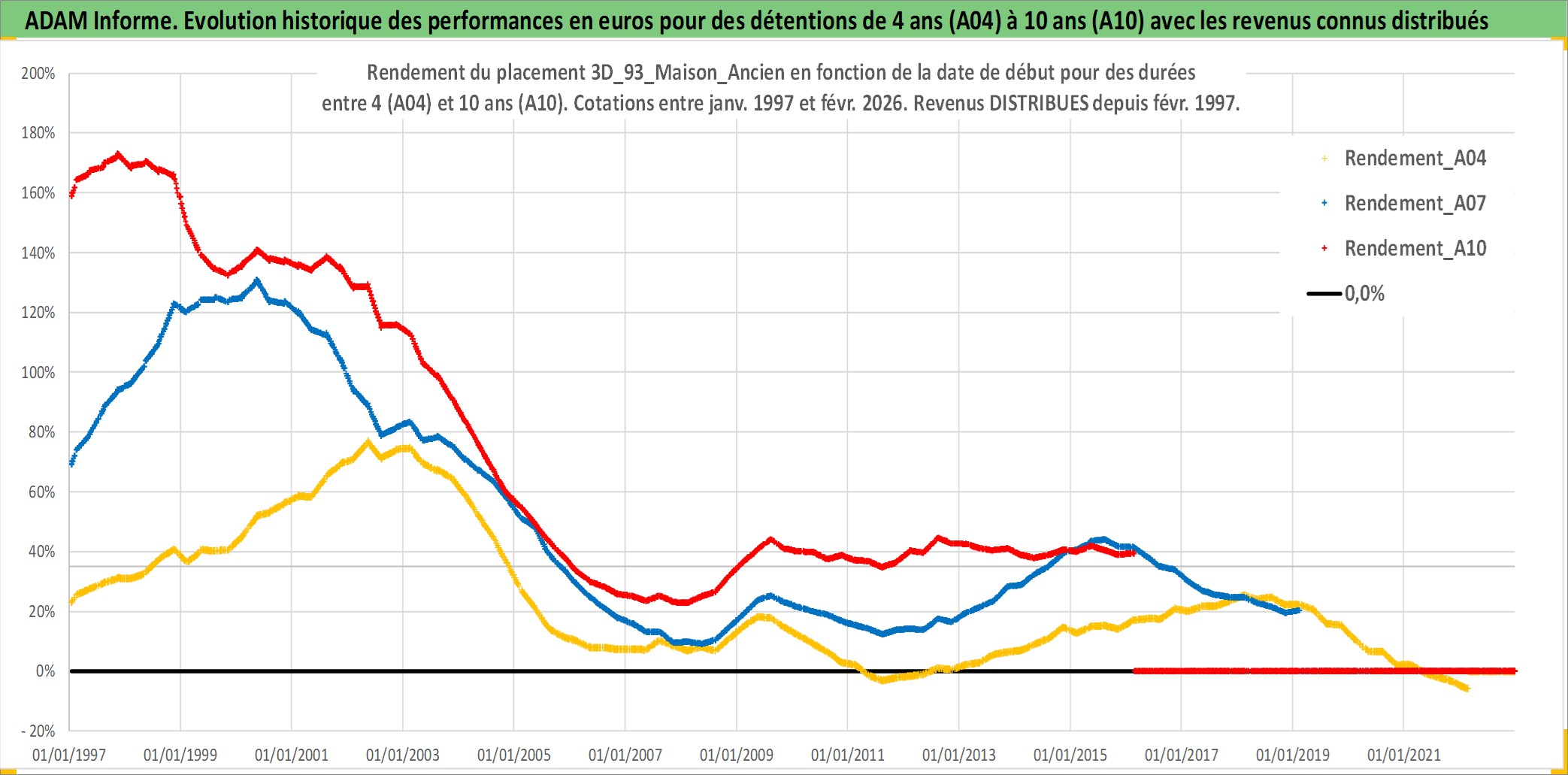 Site dédié aux investisseursPage dédiée sur site financeAnalyse des valorisations hebdomadaires de l'actif 3D_93_Maison_Ancien. Cet actif est cote en EUR. Les valorisations couvrent les semaines 1997W01 a 2026W09. Les loyers de cet actif immobilier sont pris egaux a 3,33% annuels de la valeur venale du logement.