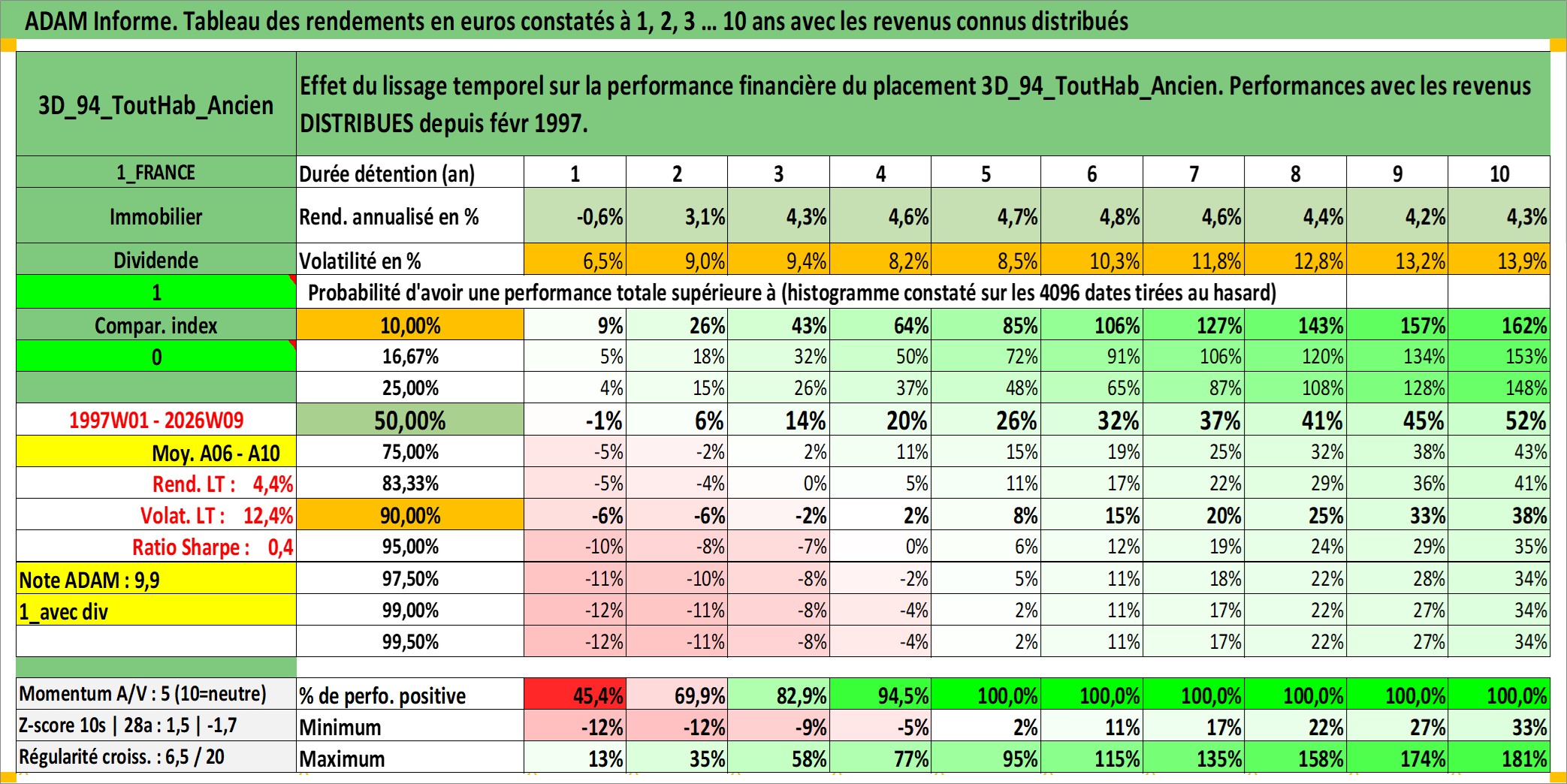 Site dédié aux investisseursPage dédiée sur site financeAnalyse des valorisations hebdomadaires de l'actif 3D_94_ToutHab_Ancien. Cet actif est cote en EUR. Les valorisations couvrent les semaines 1997W01 a 2026W09. Les loyers de cet actif immobilier sont pris egaux a 3,33% annuels de la valeur venale du logement.