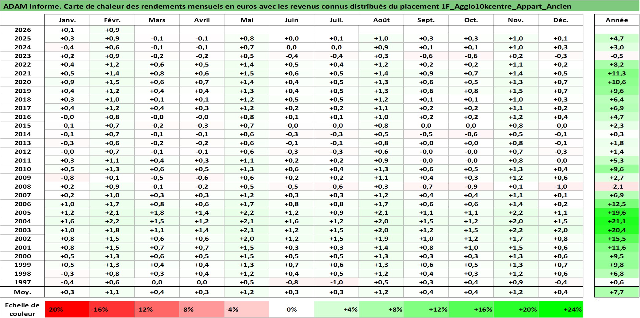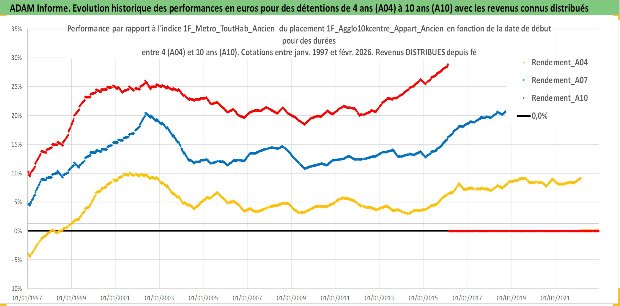 Site dédié aux investisseursPage dédiée sur site financeAnalyse des valorisations hebdomadaires de l'actif 1F_Agglo10kcentre_Appart_Ancien. Cet actif est cote en EUR. Les valorisations couvrent les semaines 1997W01 a 2026W09. Les loyers de cet actif immobilier sont pris egaux a 3,33% annuels de la valeur venale du logement.