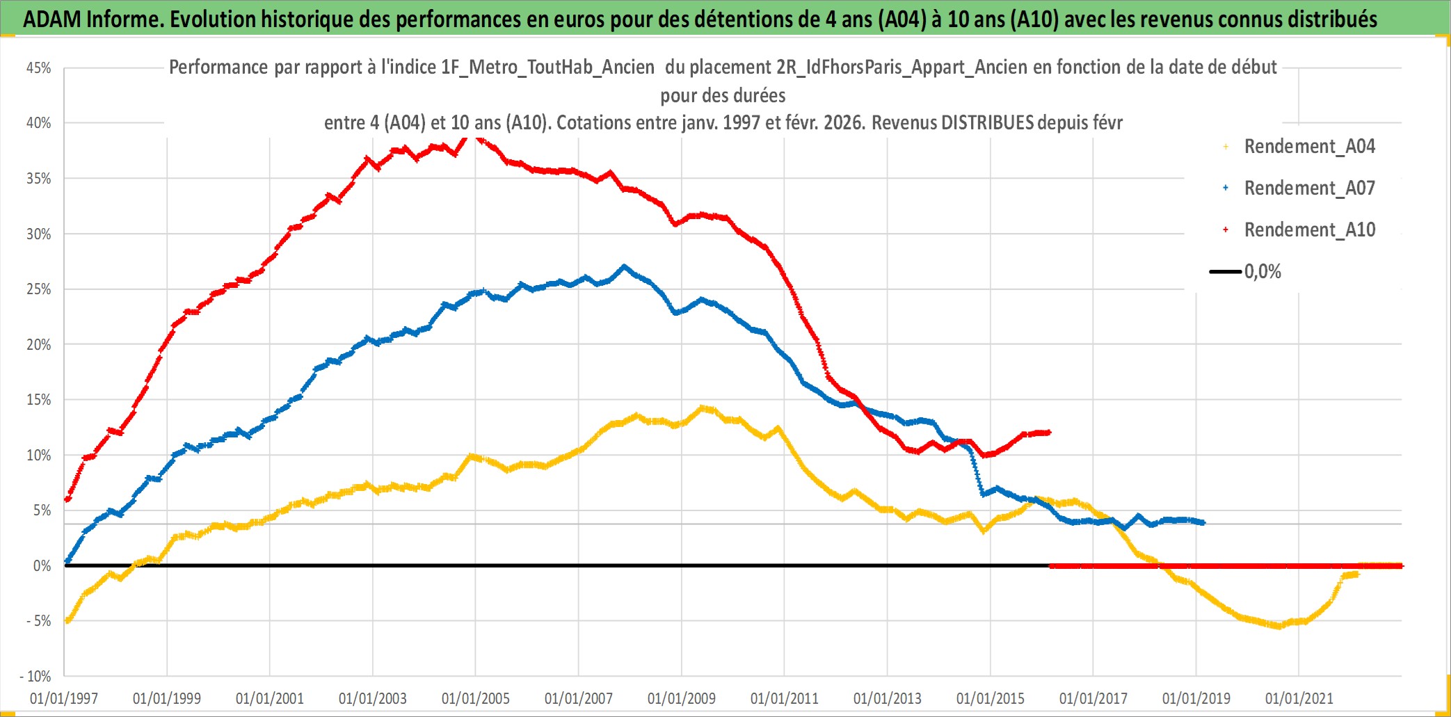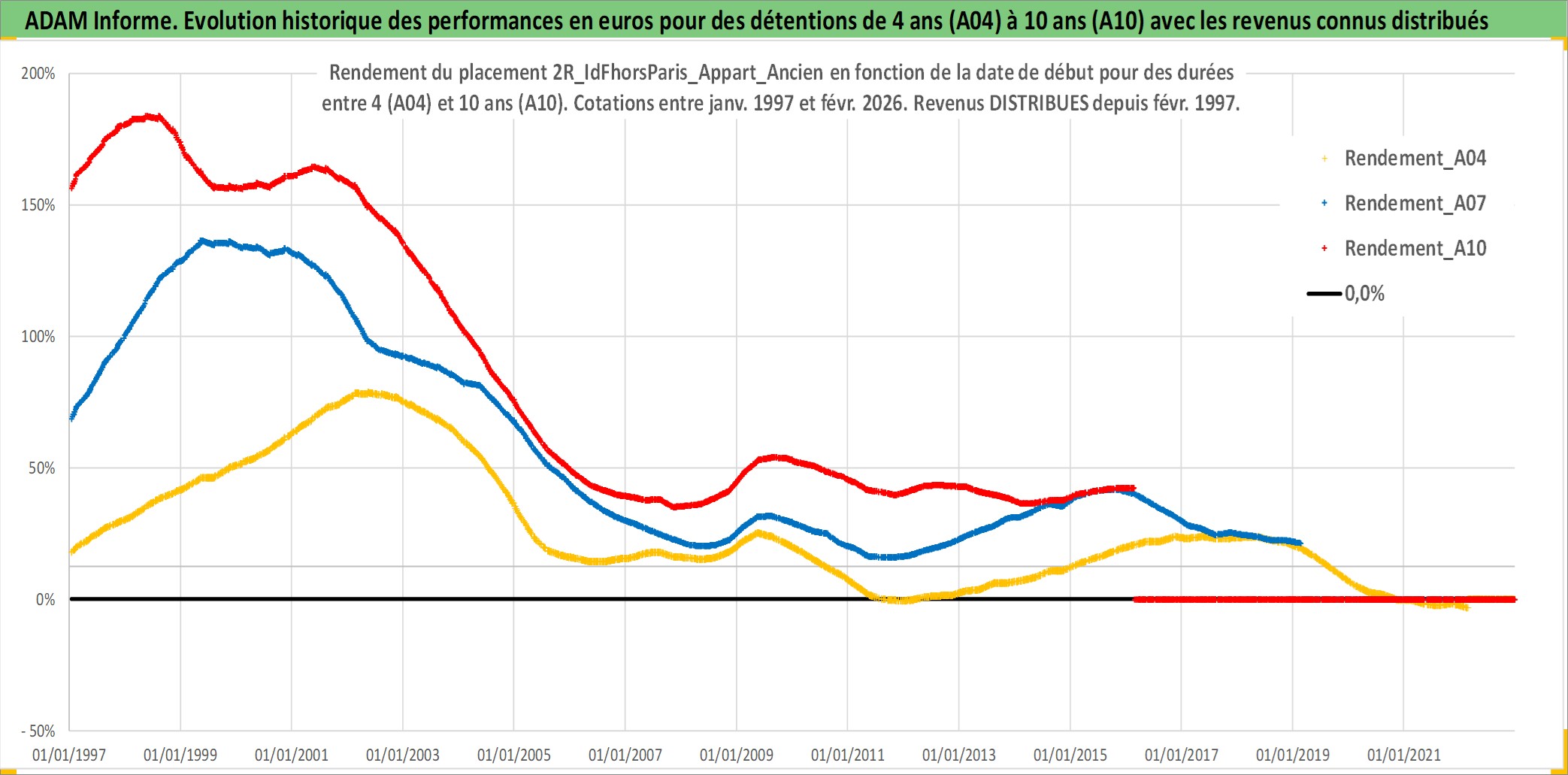Site dédié aux investisseursPage dédiée sur site financeAnalyse des valorisations hebdomadaires de l'actif 2R_IdFhorsParis_Appart_Ancien. Cet actif est cote en EUR. Les valorisations couvrent les semaines 1997W01 a 2026W09. Les loyers de cet actif immobilier sont pris egaux a 3,33% annuels de la valeur venale du logement.