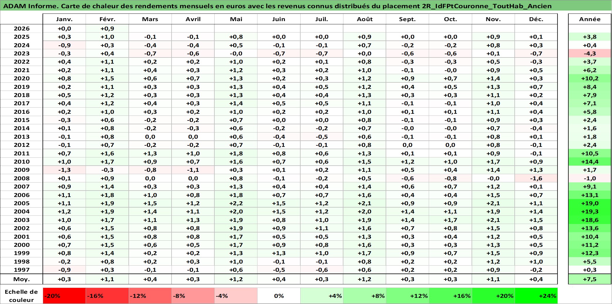 Site dédié aux investisseursPage dédiée sur site financeAnalyse des valorisations hebdomadaires de l'actif 2R_IdFPtCouronne_ToutHab_Ancien. Cet actif est cote en EUR. Les valorisations couvrent les semaines 1997W01 a 2026W09. Les loyers de cet actif immobilier sont pris egaux a 3,33% annuels de la valeur venale du logement.