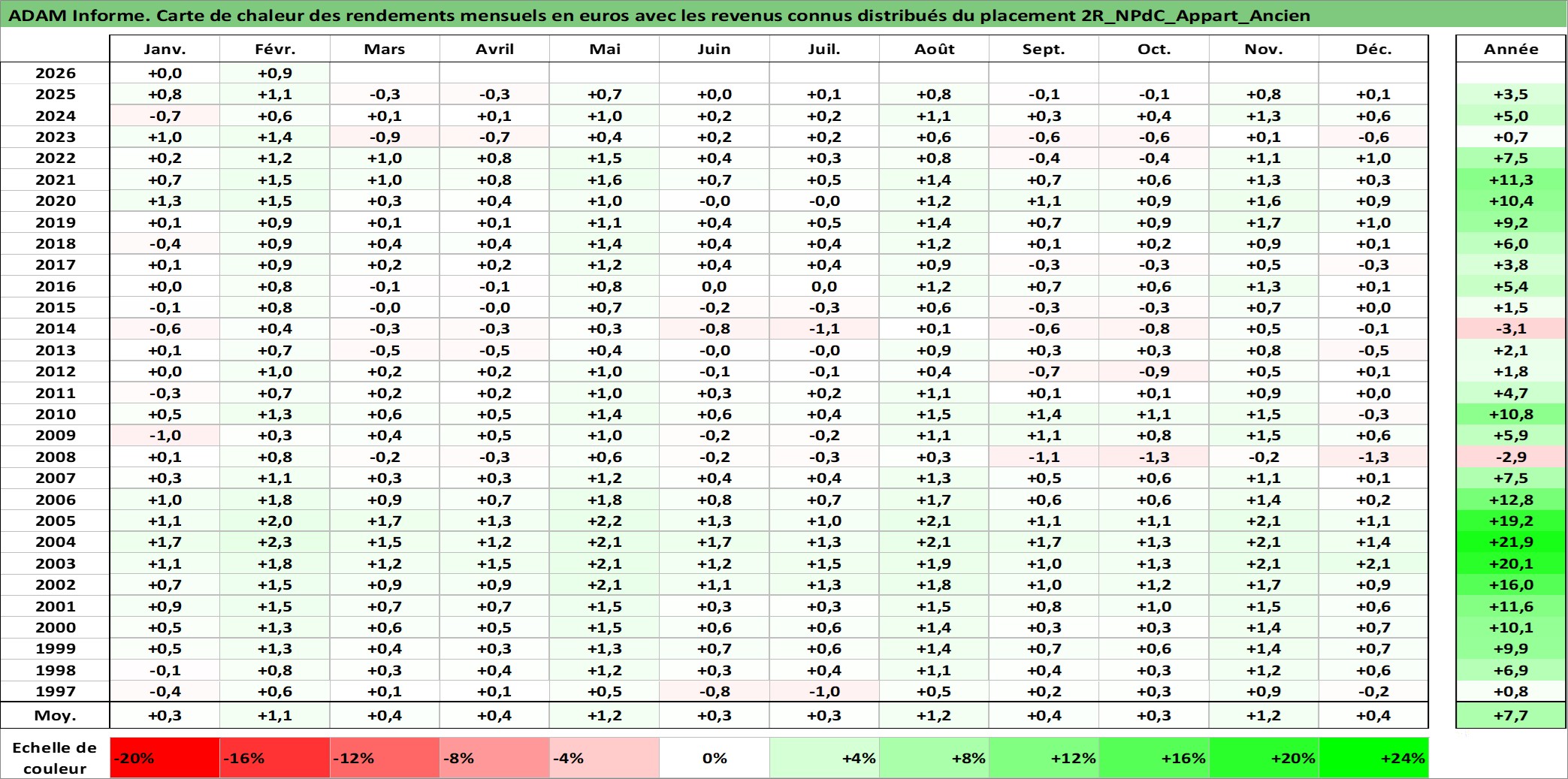 Site dédié aux investisseursPage dédiée sur site financeAnalyse des valorisations hebdomadaires de l'actif 2R_NPdC_Appart_Ancien. Cet actif est cote en EUR. Les valorisations couvrent les semaines 1997W01 a 2026W09. Les loyers de cet actif immobilier sont pris egaux a 3,33% annuels de la valeur venale du logement.
