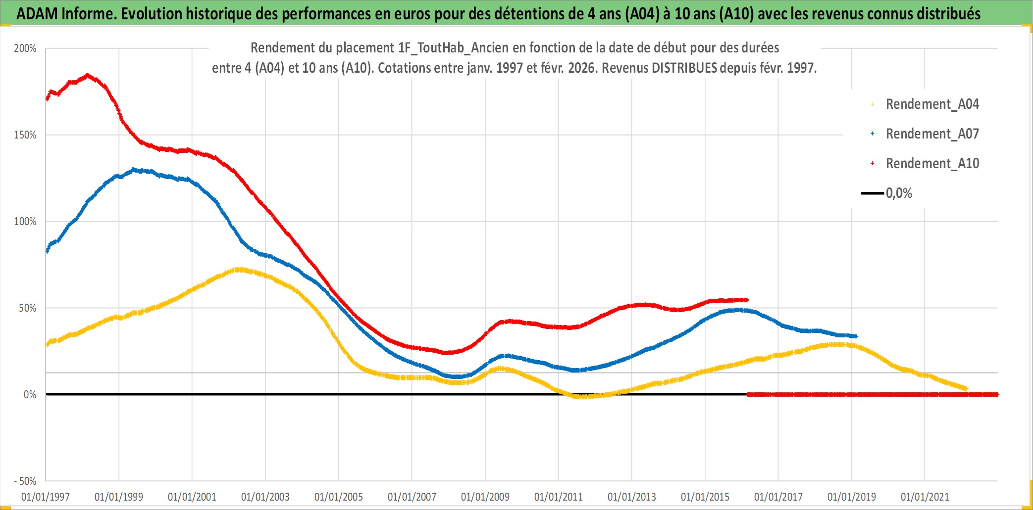 Site dédié aux investisseursPage dédiée sur site financeAnalyse des valorisations hebdomadaires de l'actif 1F_ToutHab_Ancien. Cet actif est cote en EUR. Les valorisations couvrent les semaines 1997W01 a 2026W09. Les loyers de cet actif immobilier sont pris egaux a 3,33% annuels de la valeur venale du logement.