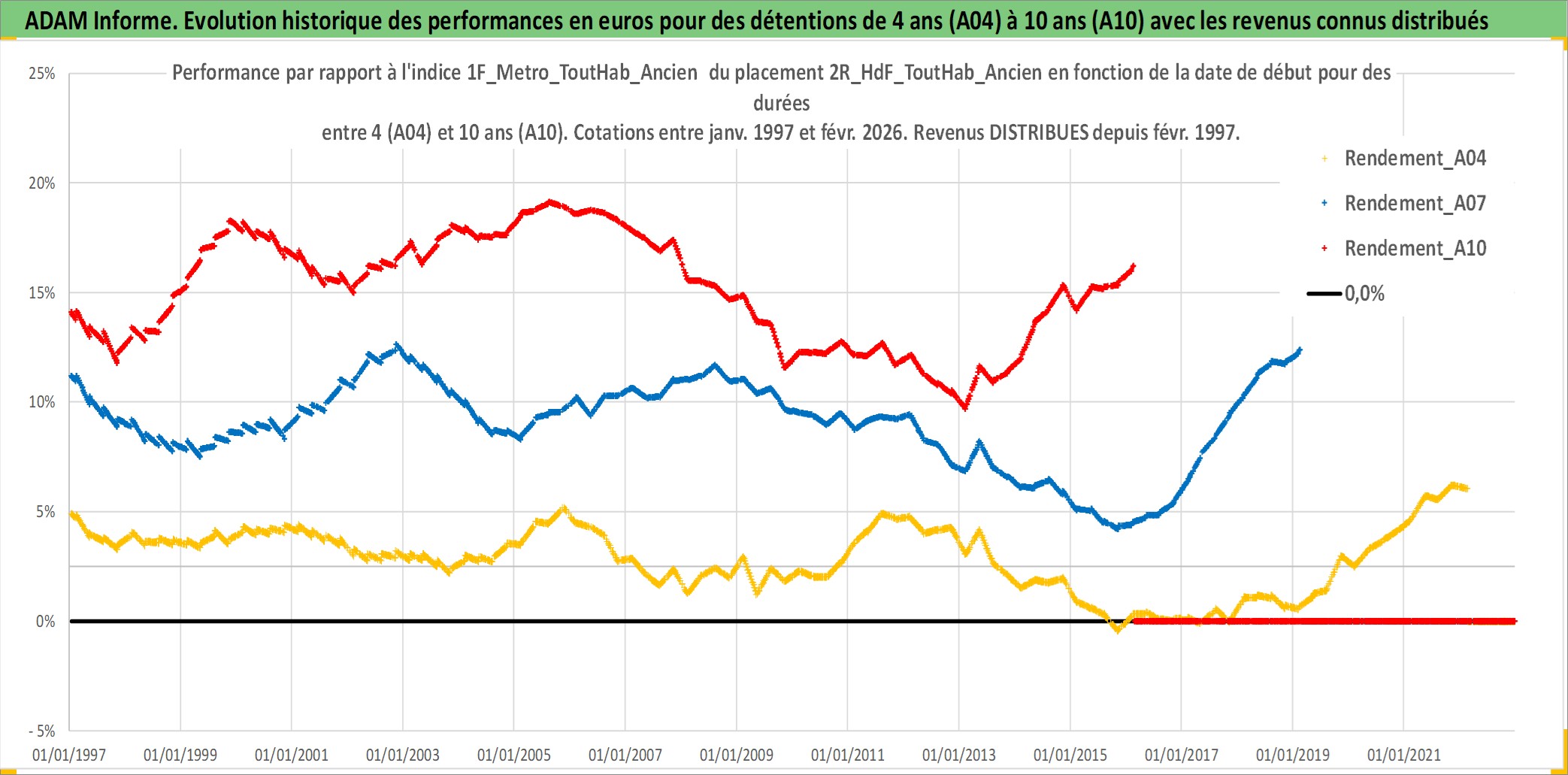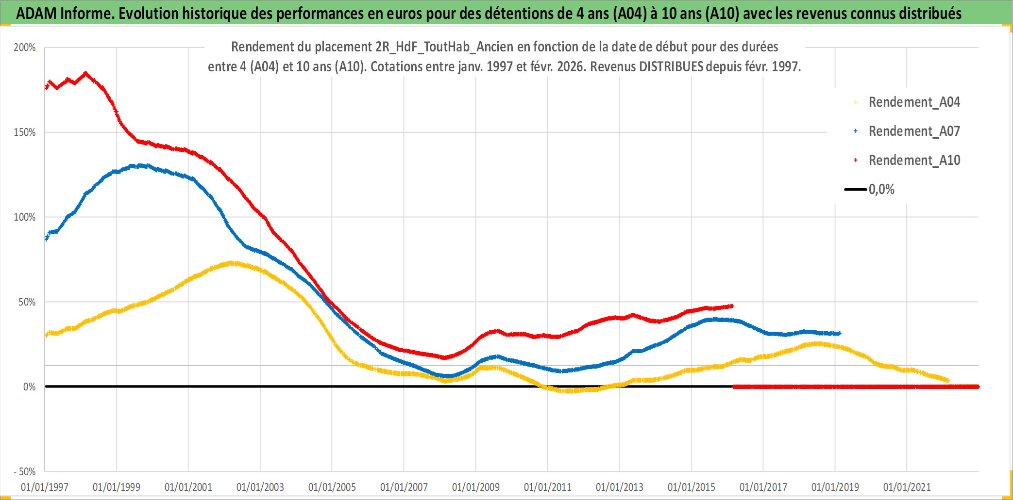 Site dédié aux investisseursPage dédiée sur site financeAnalyse des valorisations hebdomadaires de l'actif 2R_HdF_ToutHab_Ancien. Cet actif est cote en EUR. Les valorisations couvrent les semaines 1997W01 a 2026W09. Les loyers de cet actif immobilier sont pris egaux a 3,33% annuels de la valeur venale du logement.