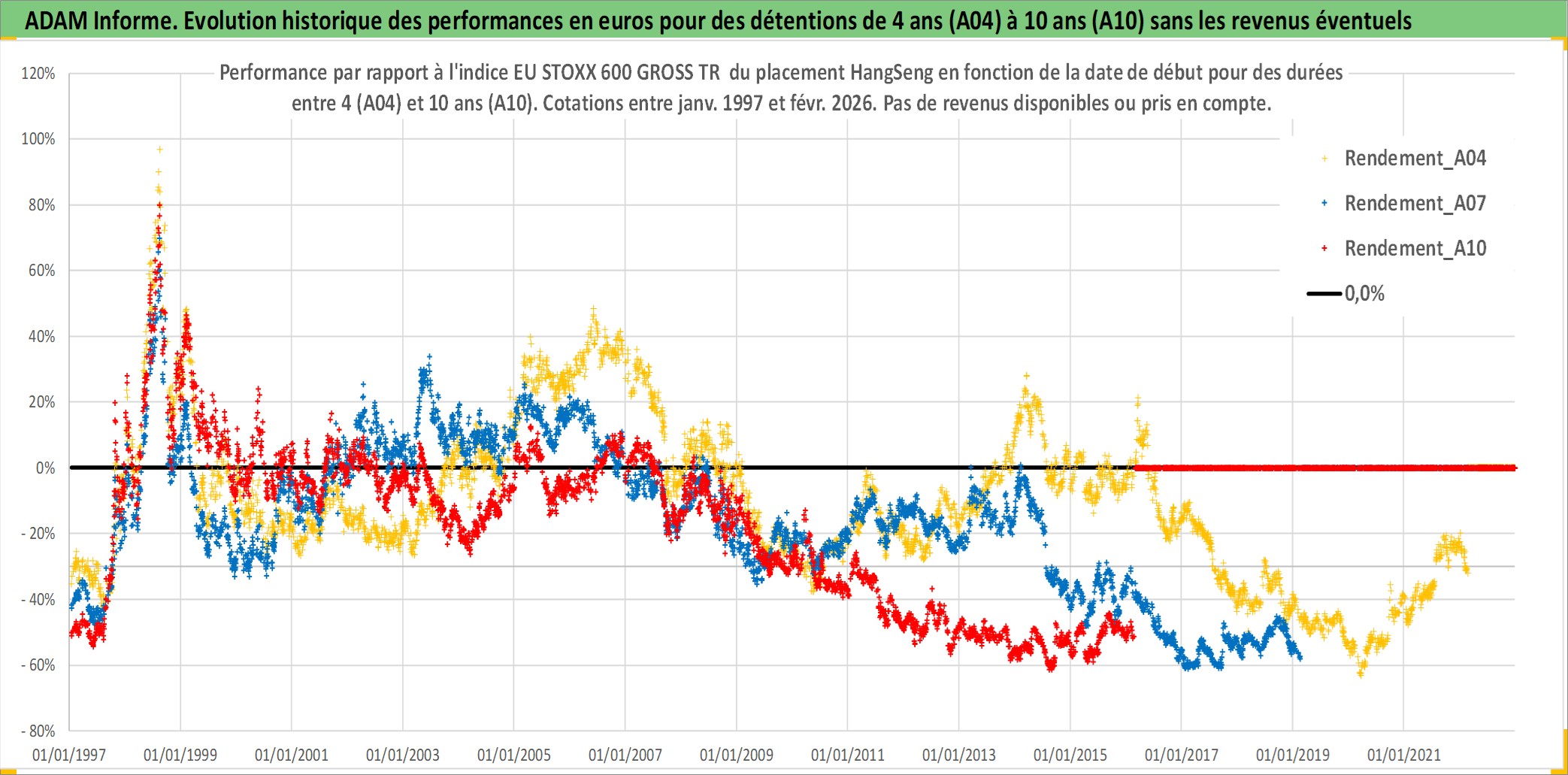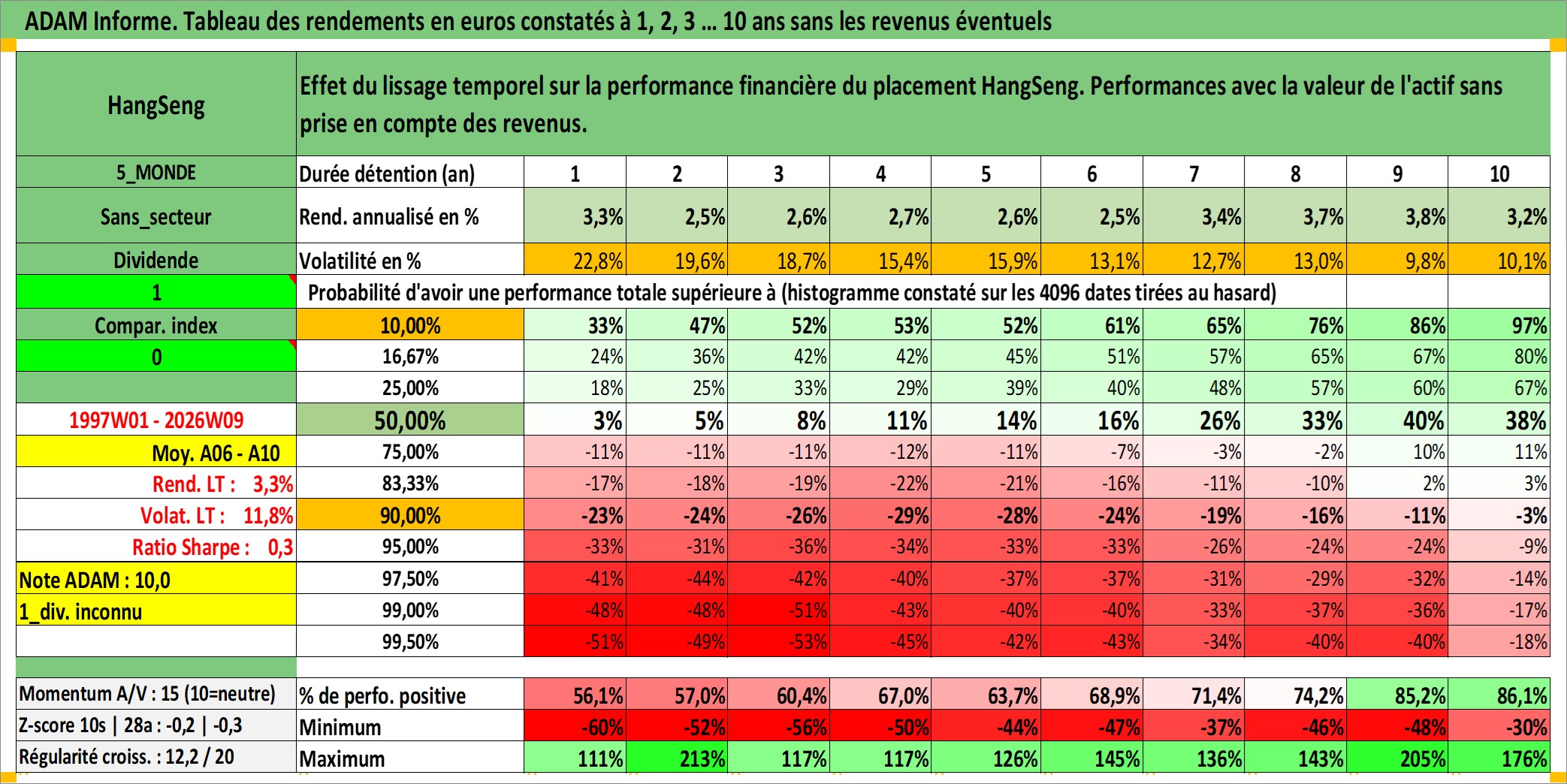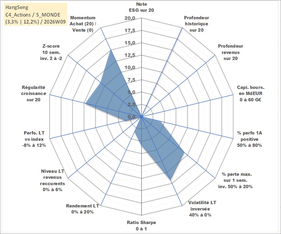Site dédié aux investisseursPage dédiée sur site financeAnalyse des valorisations hebdomadaires de l'actif HangSeng. Cet actif est cote en HKD. Les valorisations sont en contrevaleur EURO et couvrent les semaines 1997W01 a 2026W09. Les revenus de cet actif financier ne sont pas connus car non existants ou non disponibles sur le site Yahoo Finance. La note ESG de cet actif n'est pas connue.