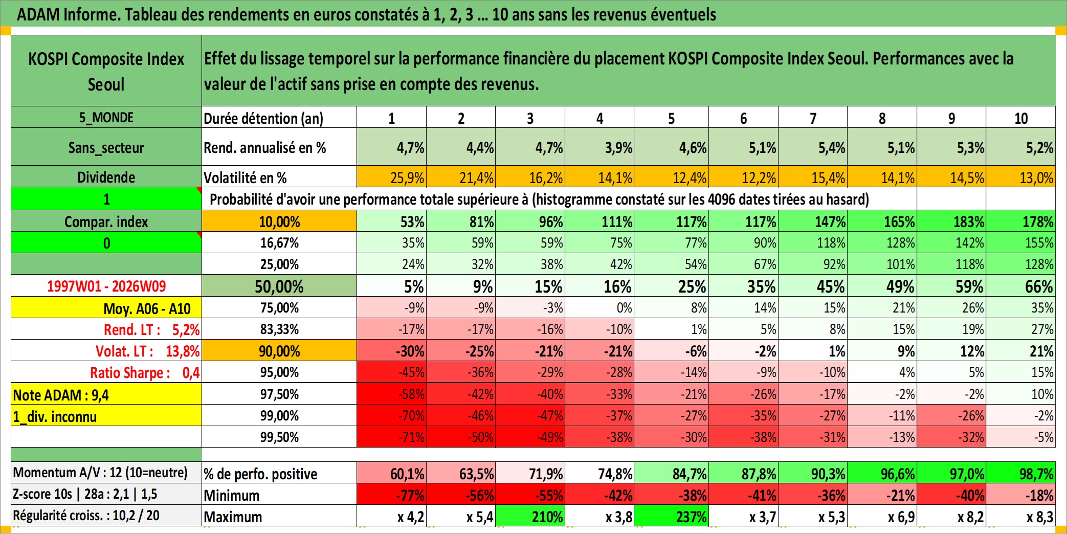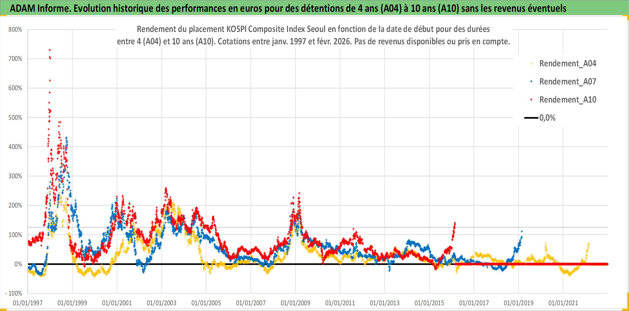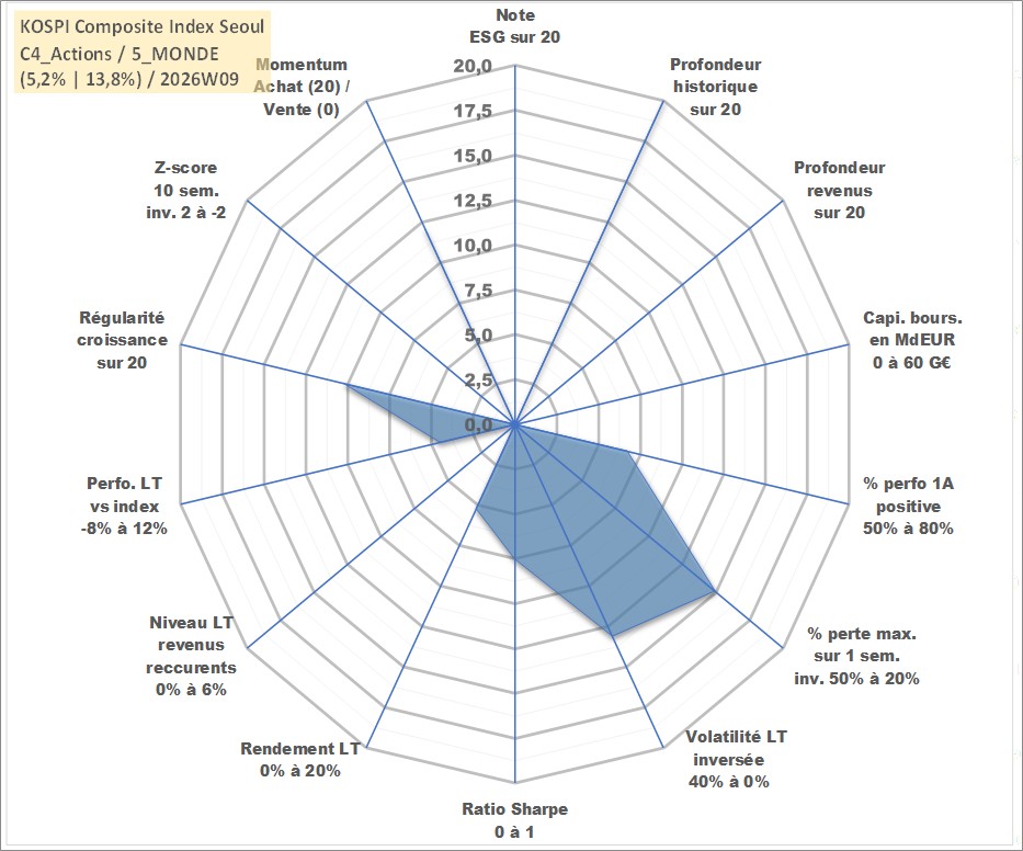 Site dédié aux investisseursPage dédiée sur site financeAnalyse des valorisations hebdomadaires de l'actif KOSPI Composite Index Seoul. Cet actif est cote en KRW. Les valorisations sont en contrevaleur EURO et couvrent les semaines 1997W01 a 2026W09. Les revenus de cet actif financier ne sont pas connus car non existants ou non disponibles sur le site Yahoo Finance. La note ESG de cet actif n'est pas connue.