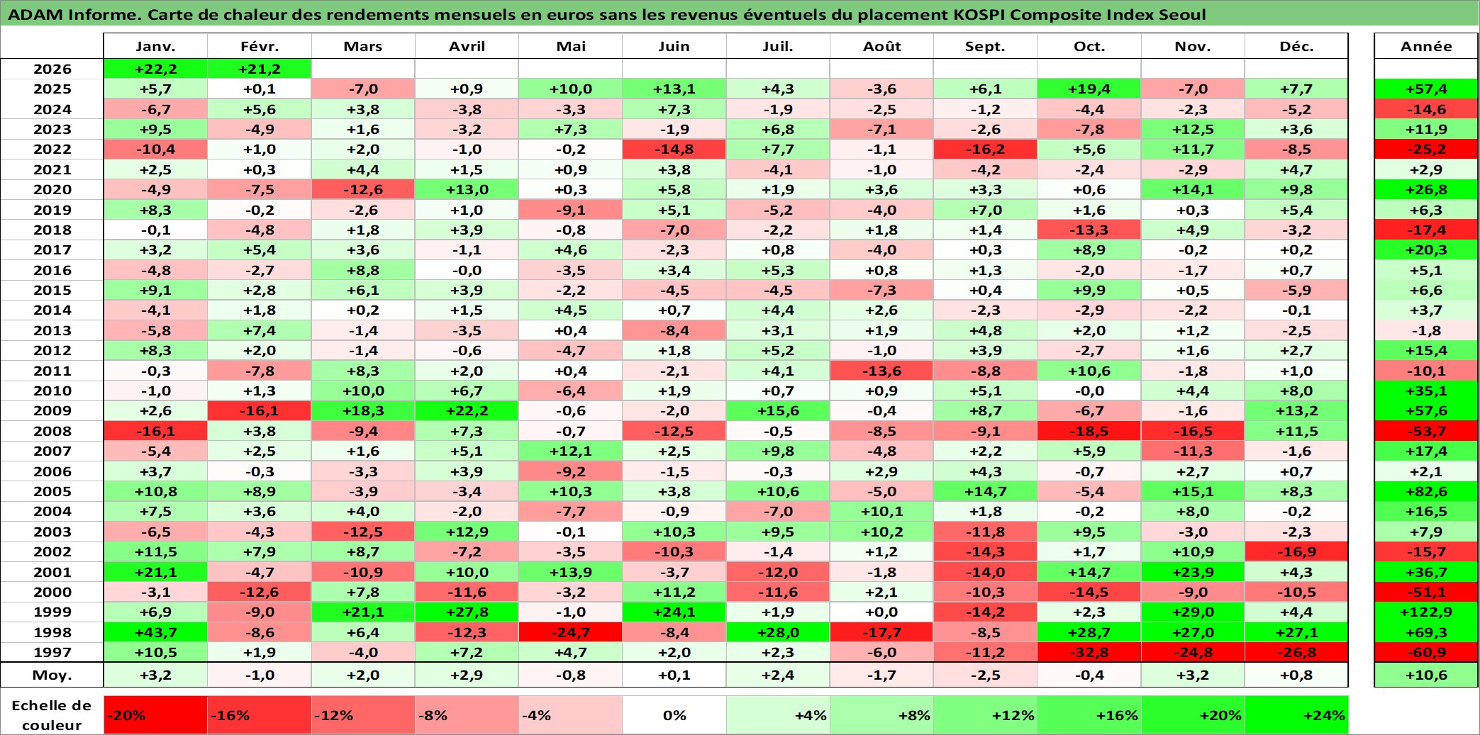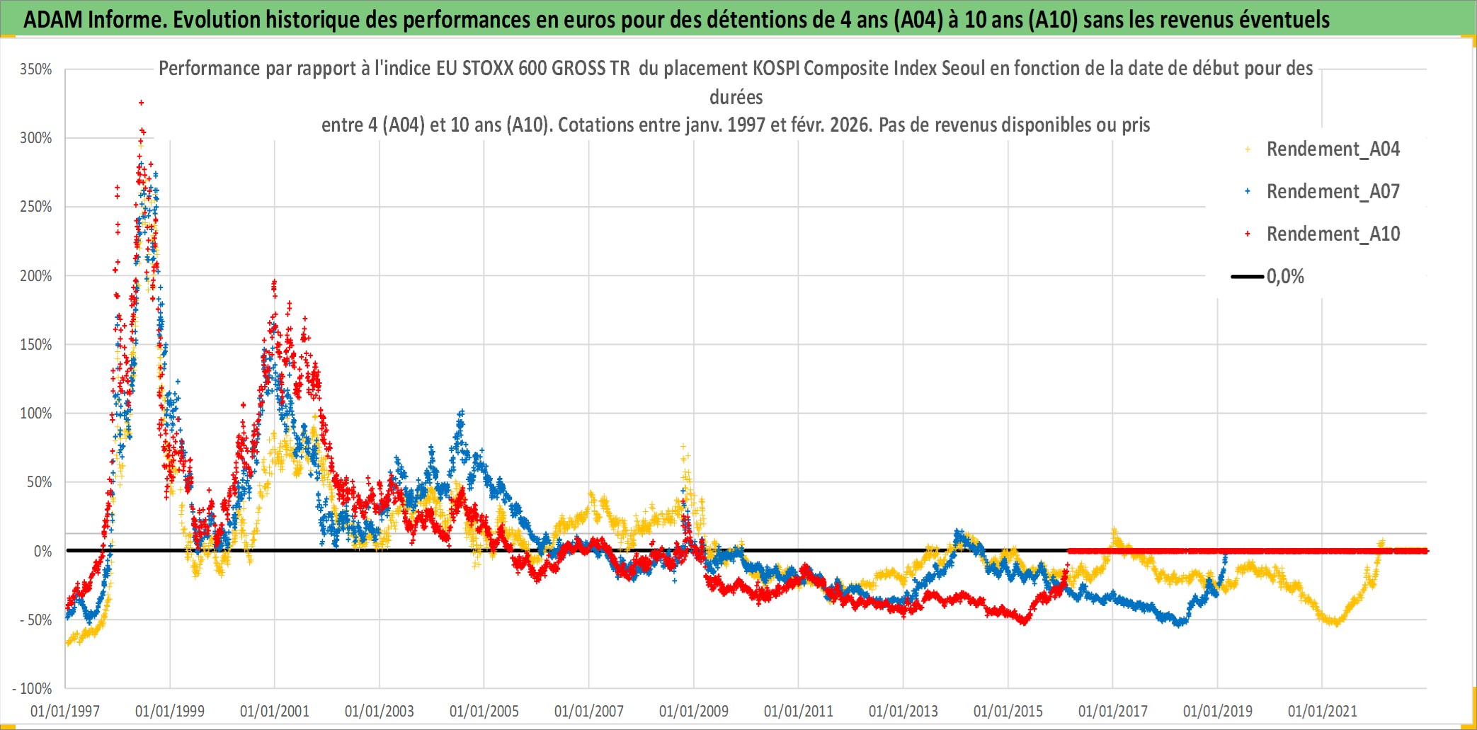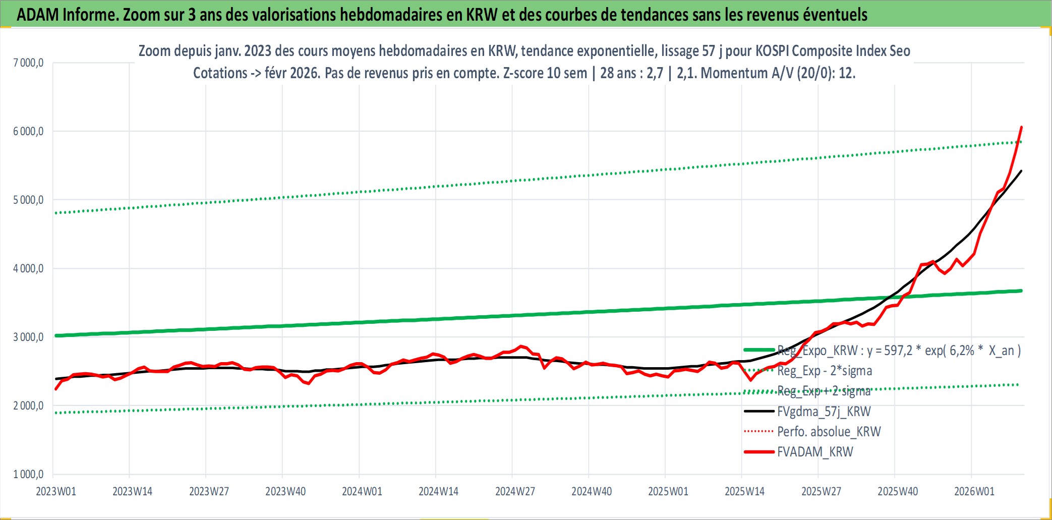 Site dédié aux investisseursPage dédiée sur site financeAnalyse des valorisations hebdomadaires de l'actif KOSPI Composite Index Seoul. Cet actif est cote en KRW. Les valorisations sont en contrevaleur EURO et couvrent les semaines 1997W01 a 2026W09. Les revenus de cet actif financier ne sont pas connus car non existants ou non disponibles sur le site Yahoo Finance. La note ESG de cet actif n'est pas connue.