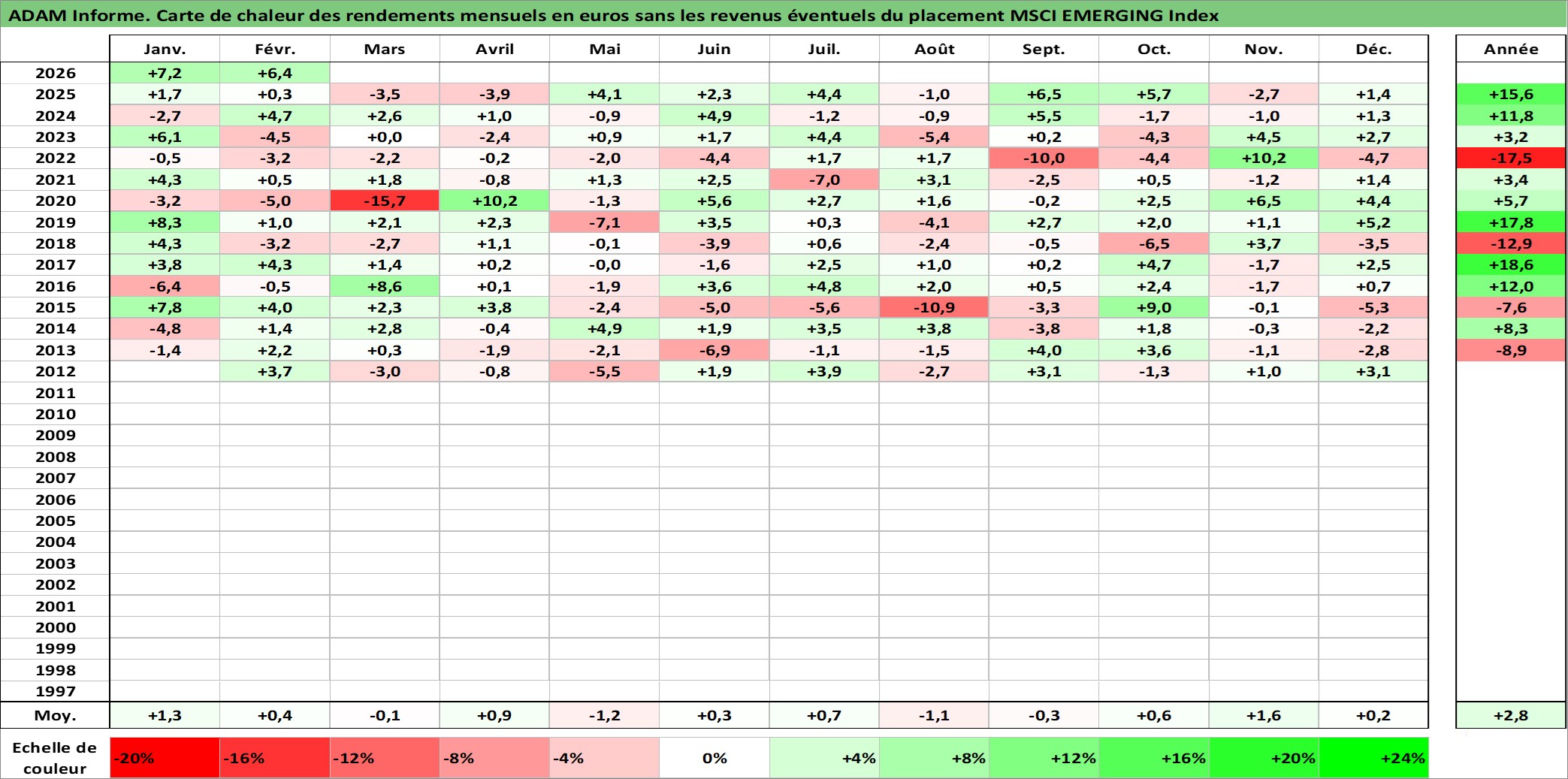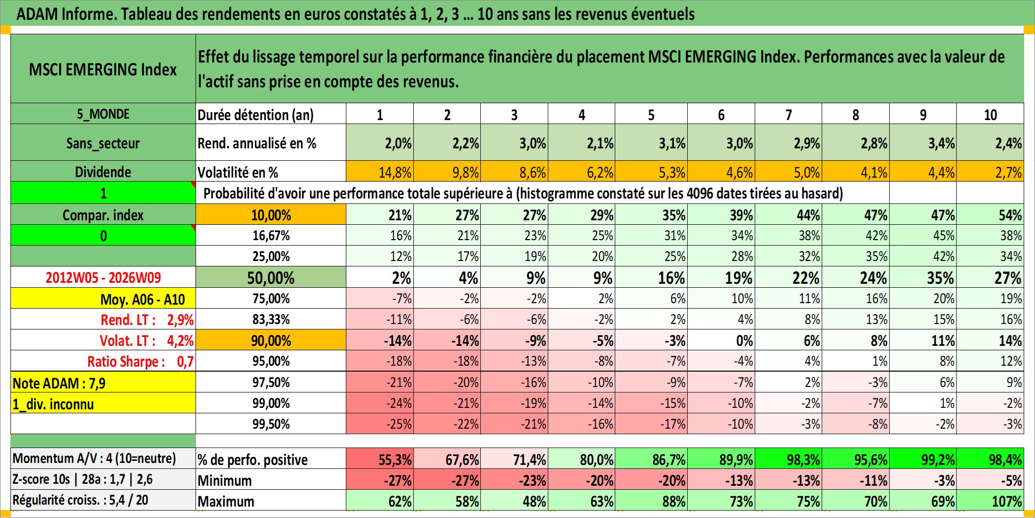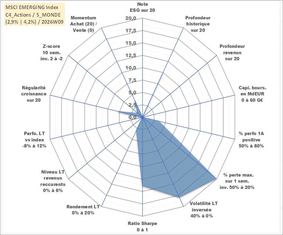 Site dédié aux investisseursPage dédiée sur site financeAnalyse des valorisations hebdomadaires de l'actif MSCI EMERGING Index. Cet actif est cote en USD. Les valorisations sont en contrevaleur EURO et couvrent les semaines 2012W05 a 2025W14. Les revenus de cet actif financier ne sont pas connus car non existants ou non disponibles sur le site Yahoo Finance. La note ESG de cet actif n'est pas connue.