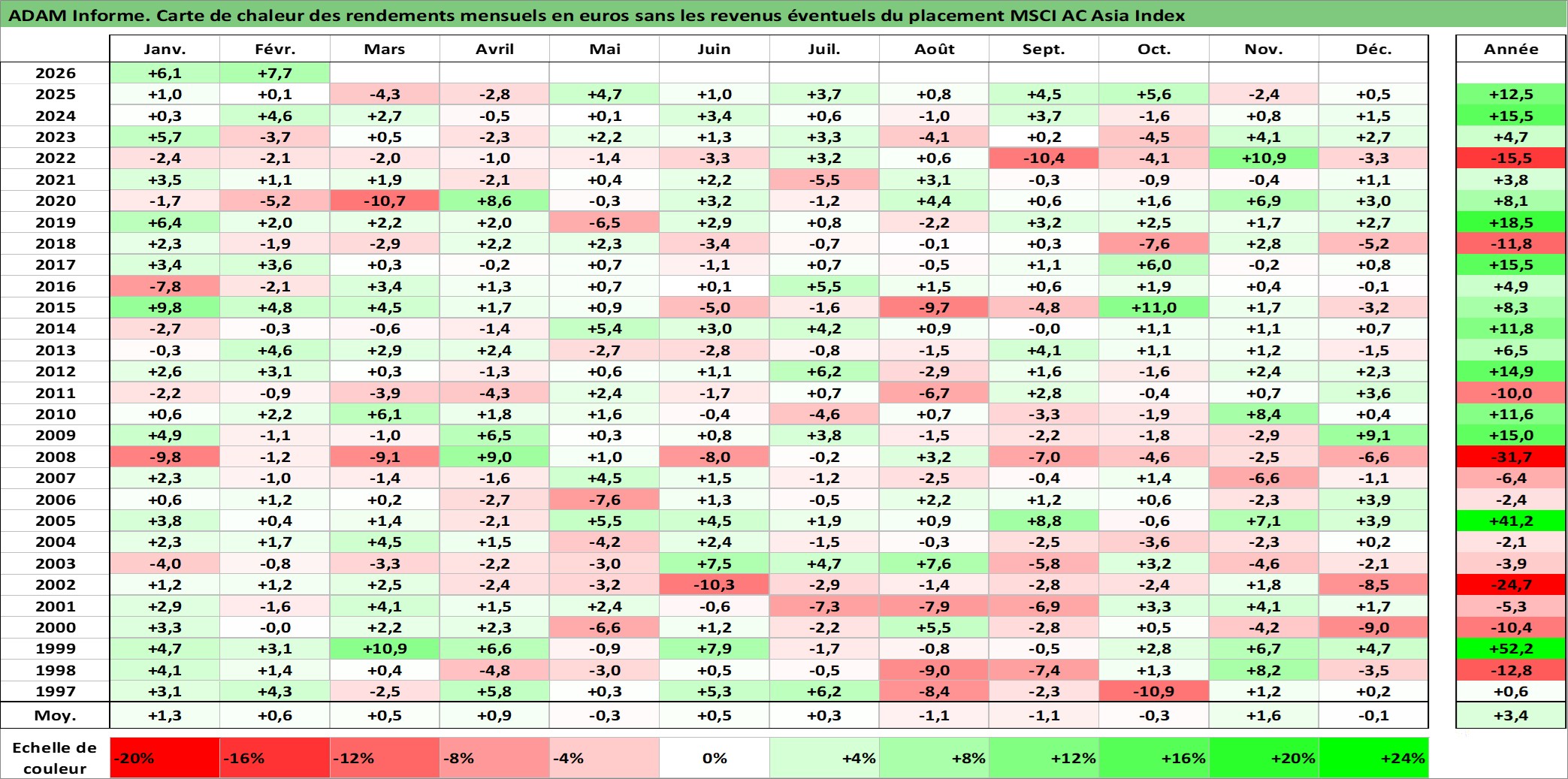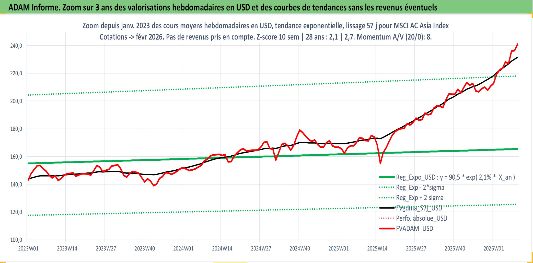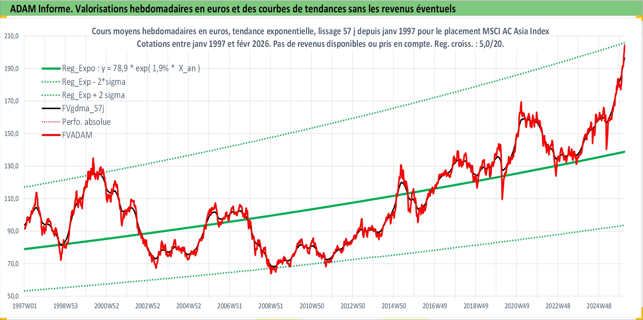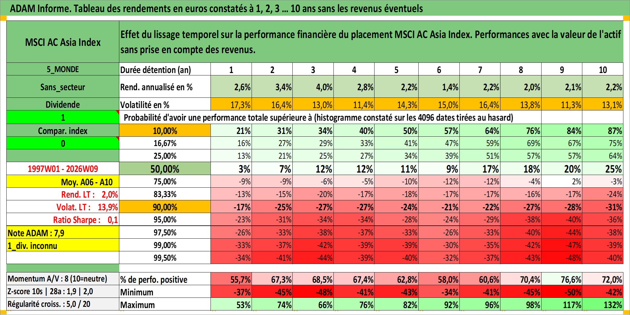 Site dédié aux investisseursPage dédiée sur site financeAnalyse des valorisations hebdomadaires de l'actif MSCI AC Asia Index. Cet actif est cote en USD. Les valorisations sont en contrevaleur EURO et couvrent les semaines 1997W01 a 2026W09. Les revenus de cet actif financier ne sont pas connus car non existants ou non disponibles sur le site Yahoo Finance. La note ESG de cet actif n'est pas connue.