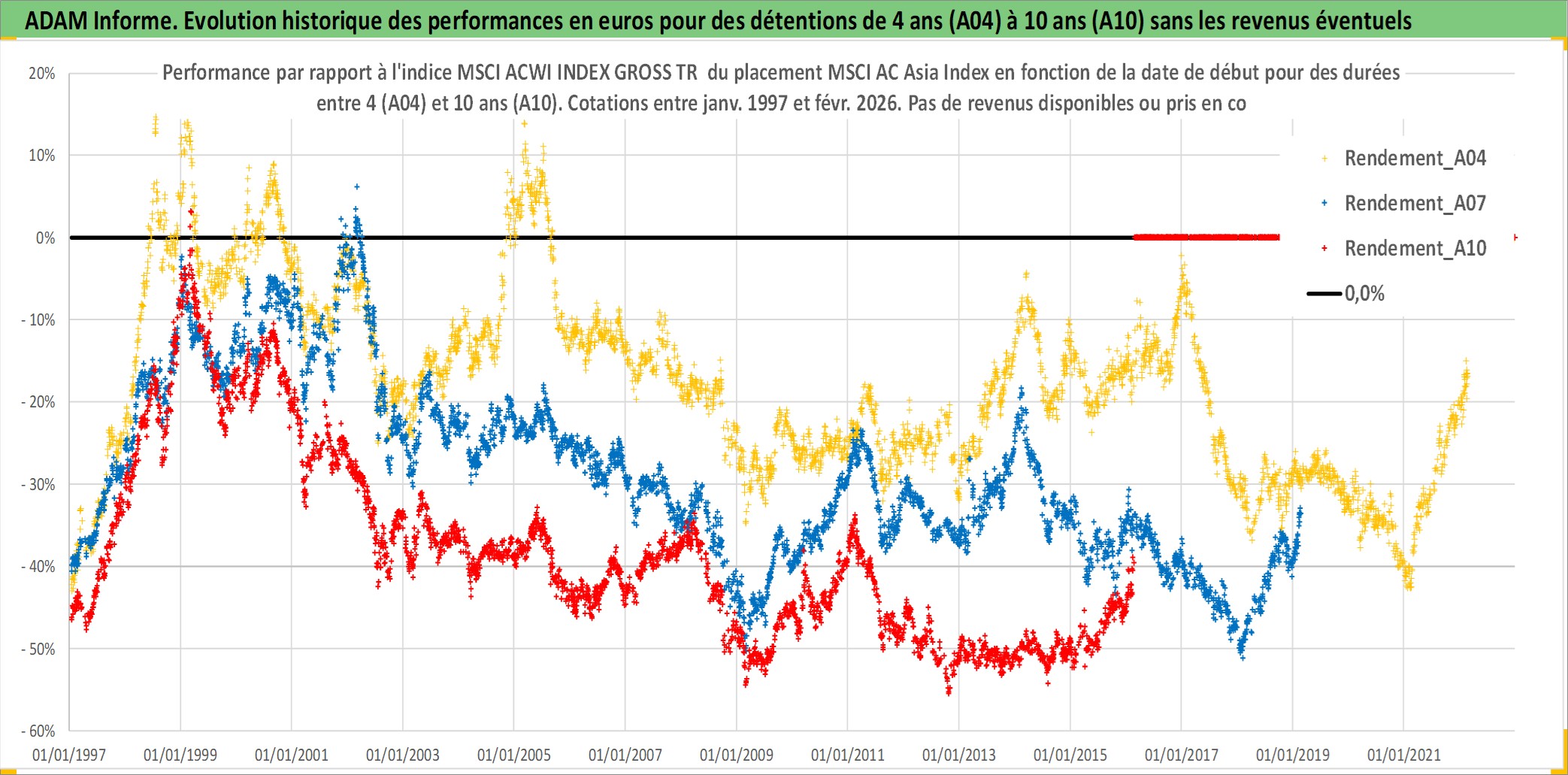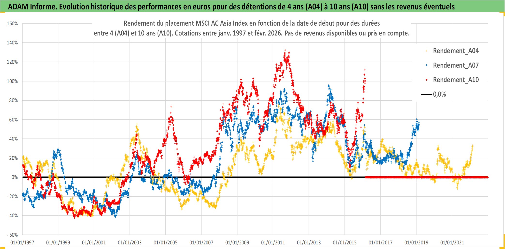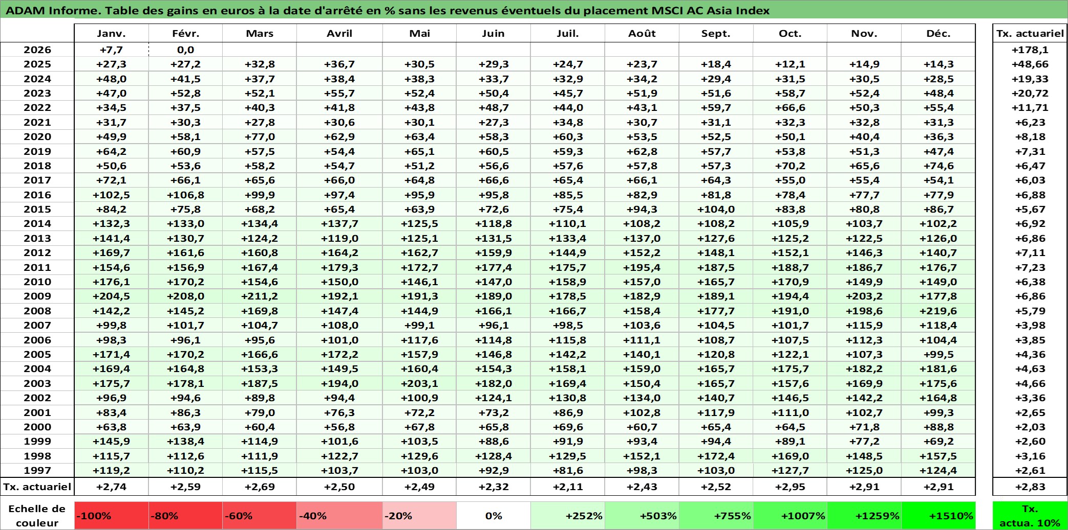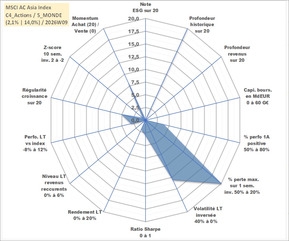 Site dédié aux investisseursPage dédiée sur site financeAnalyse des valorisations hebdomadaires de l'actif MSCI AC Asia Index. Cet actif est cote en USD. Les valorisations sont en contrevaleur EURO et couvrent les semaines 1997W01 a 2026W09. Les revenus de cet actif financier ne sont pas connus car non existants ou non disponibles sur le site Yahoo Finance. La note ESG de cet actif n'est pas connue.