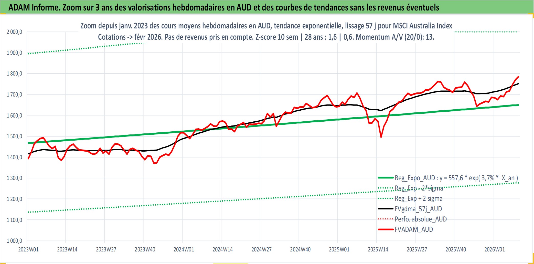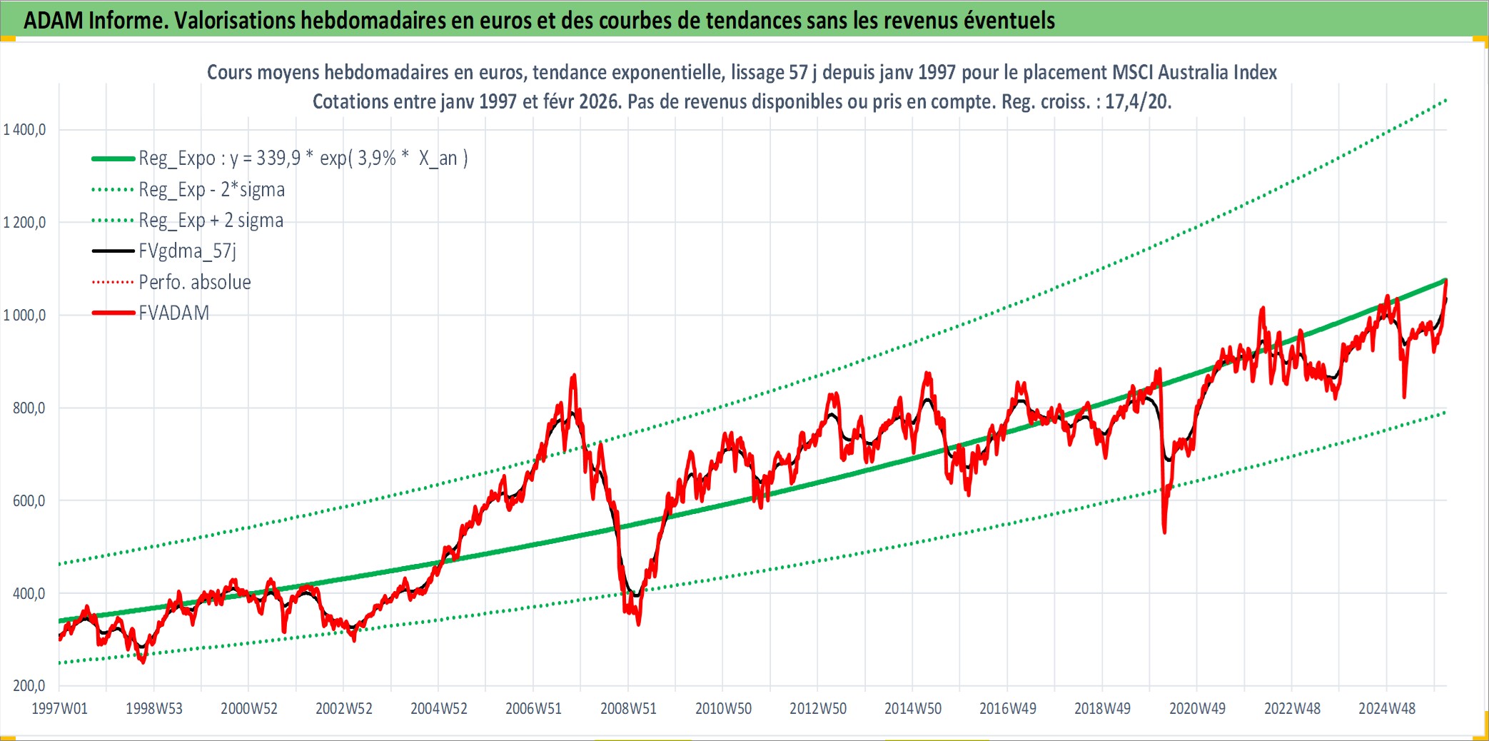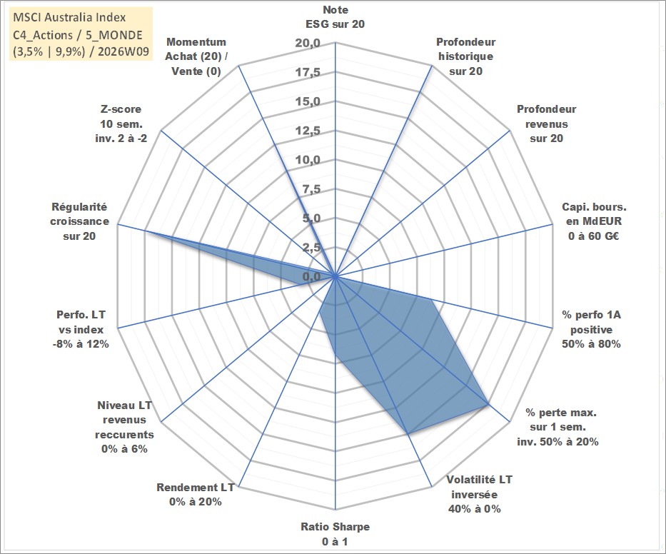 Site dédié aux investisseursPage dédiée sur site financeAnalyse des valorisations hebdomadaires de l'actif MSCI Australia Index. Cet actif est cote en AUD. Les valorisations sont en contrevaleur EURO et couvrent les semaines 1997W01 a 2026W09. Les revenus de cet actif financier ne sont pas connus car non existants ou non disponibles sur le site Yahoo Finance. La note ESG de cet actif n'est pas connue.