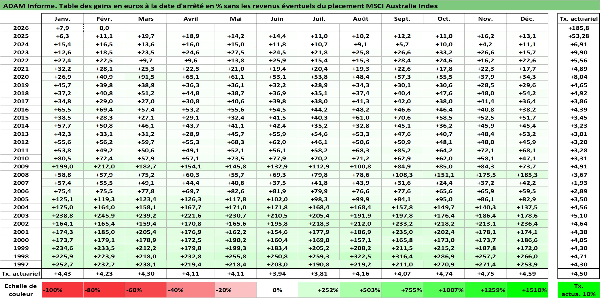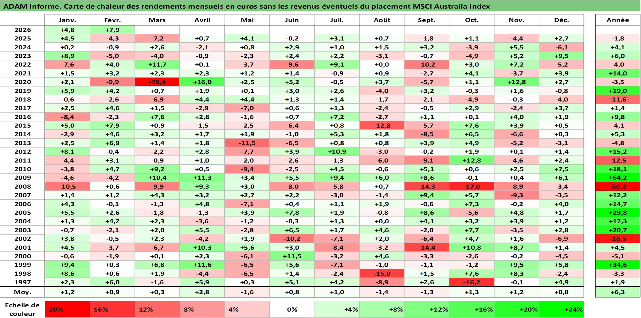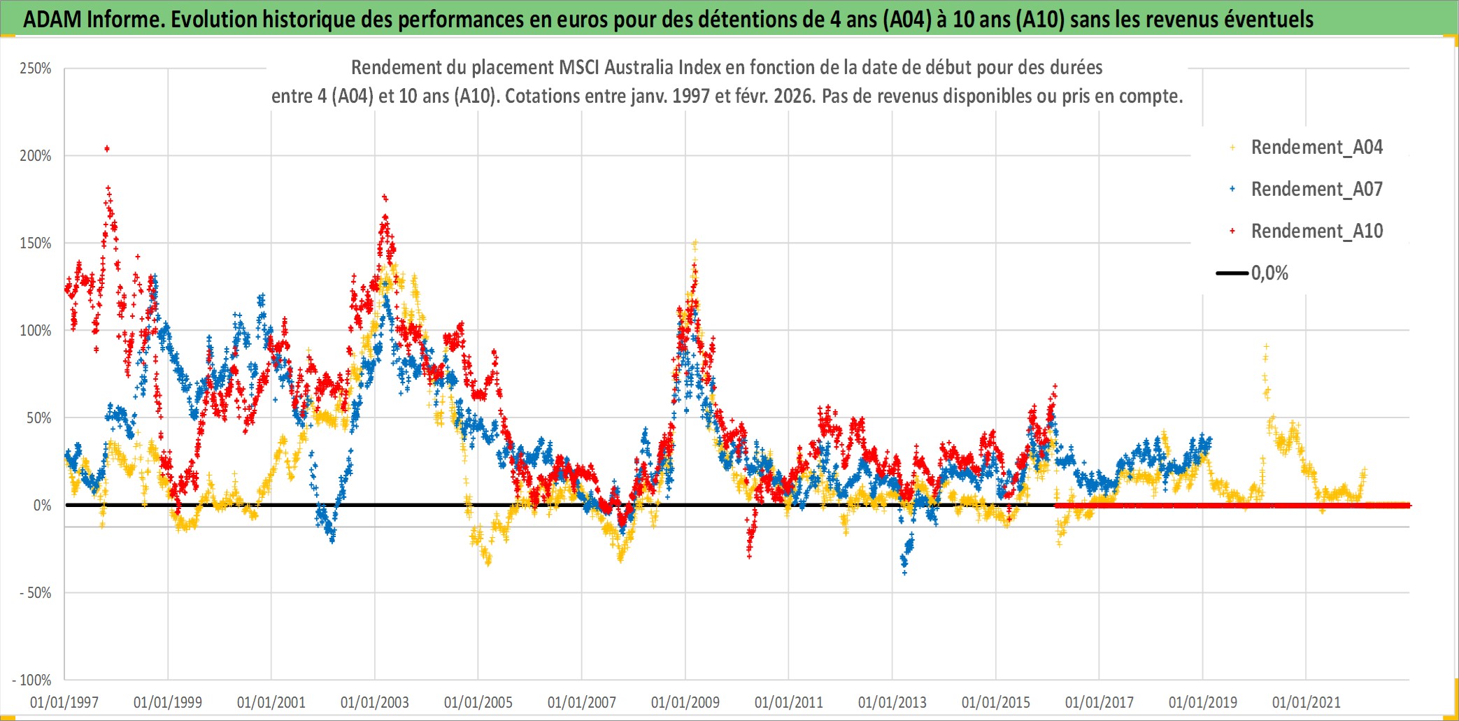 Site dédié aux investisseursPage dédiée sur site financeAnalyse des valorisations hebdomadaires de l'actif MSCI Australia Index. Cet actif est cote en AUD. Les valorisations sont en contrevaleur EURO et couvrent les semaines 1997W01 a 2026W09. Les revenus de cet actif financier ne sont pas connus car non existants ou non disponibles sur le site Yahoo Finance. La note ESG de cet actif n'est pas connue.