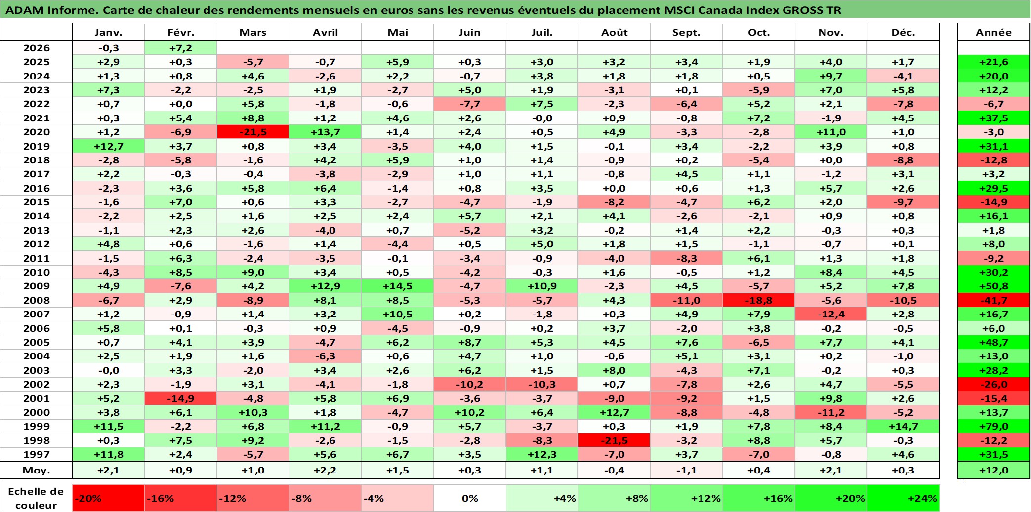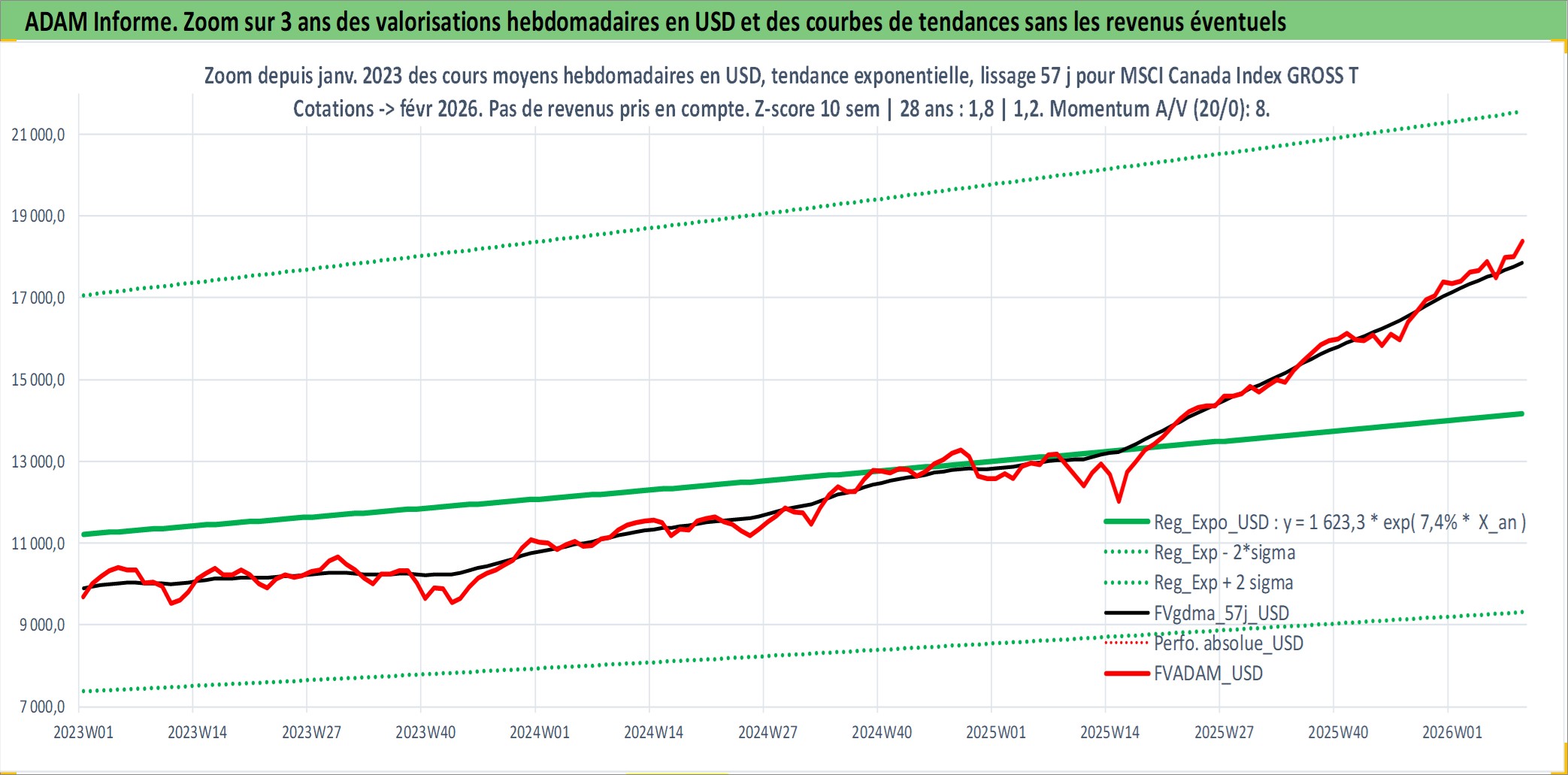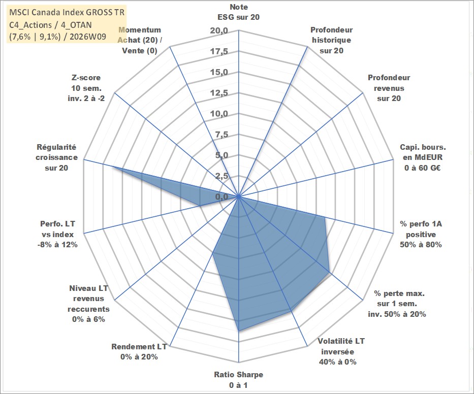 Site dédié aux investisseursPage dédiée sur site financeAnalyse des valorisations hebdomadaires de l'actif MSCI Canada Index GROSS TR. Cet actif est cote en USD. Les valorisations sont en contrevaleur EURO et couvrent les semaines 1997W01 a 2026W09. Les revenus de cet actif financier ne sont pas connus car non existants ou non disponibles sur le site Yahoo Finance. La note ESG de cet actif n'est pas connue.