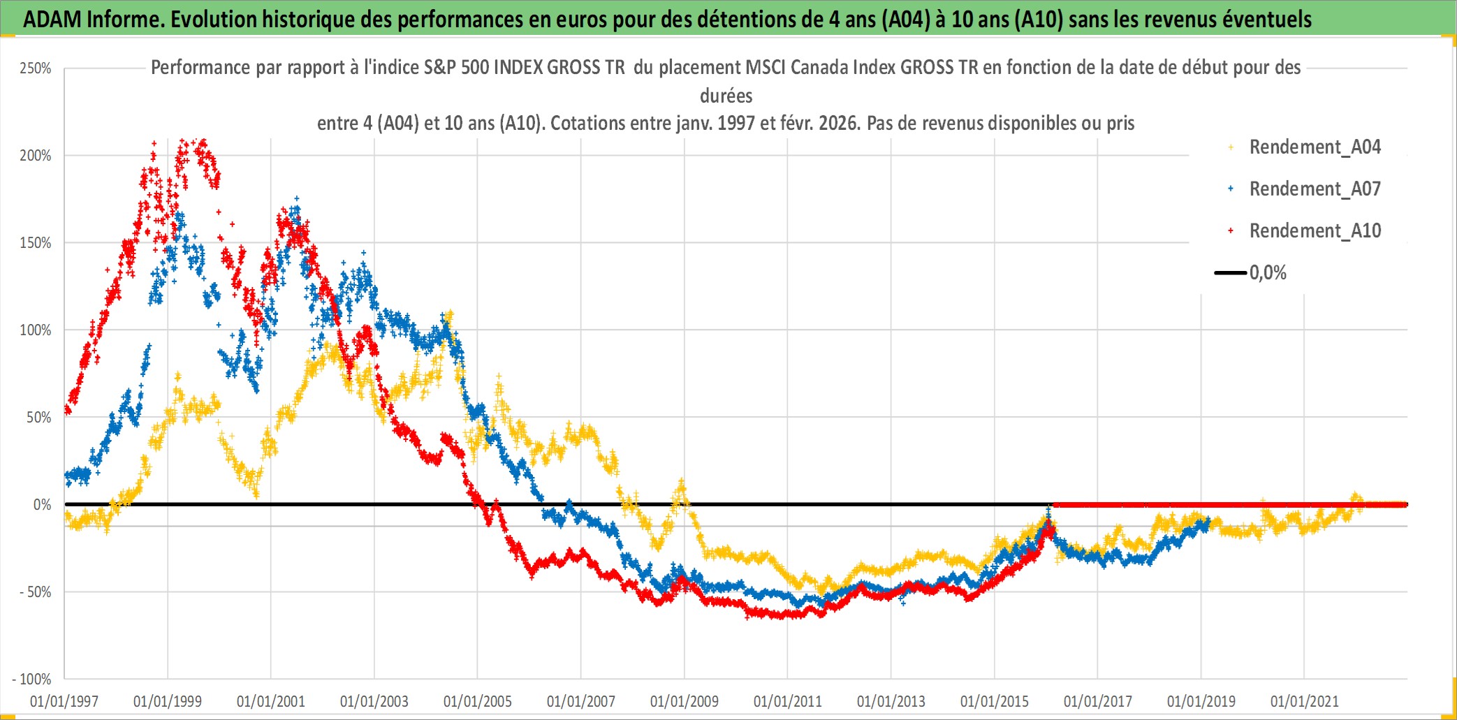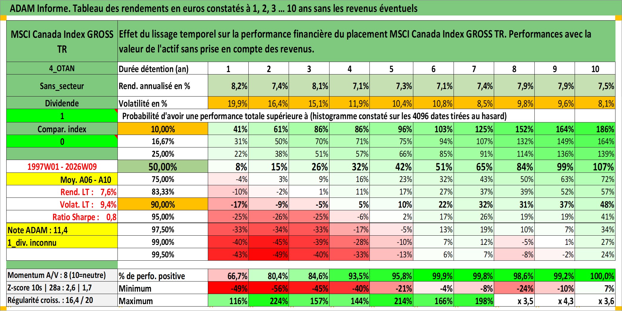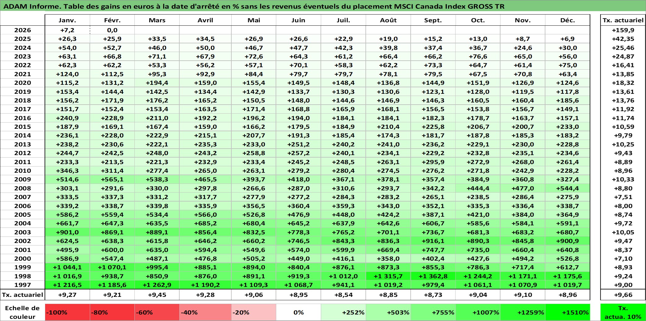 Site dédié aux investisseursPage dédiée sur site financeAnalyse des valorisations hebdomadaires de l'actif MSCI Canada Index GROSS TR. Cet actif est cote en USD. Les valorisations sont en contrevaleur EURO et couvrent les semaines 1997W01 a 2026W09. Les revenus de cet actif financier ne sont pas connus car non existants ou non disponibles sur le site Yahoo Finance. La note ESG de cet actif n'est pas connue.