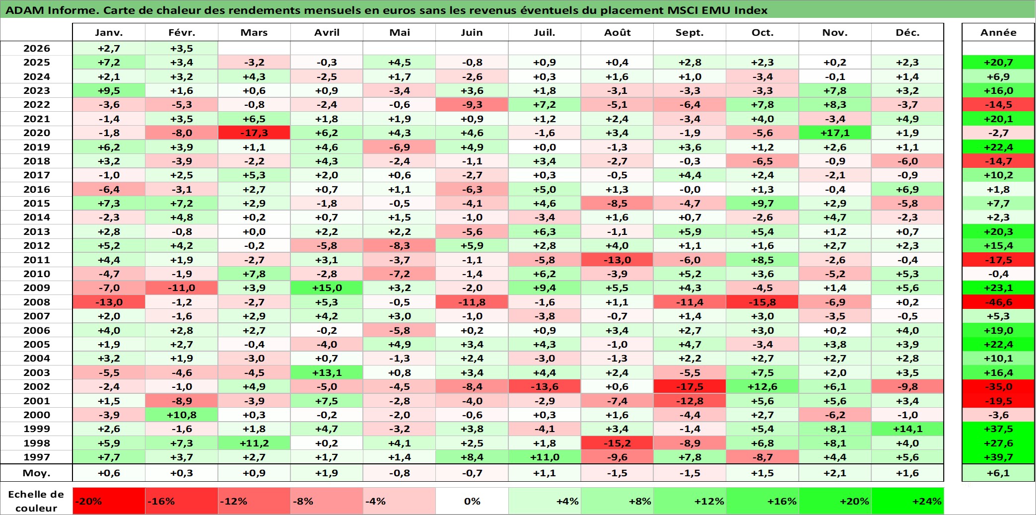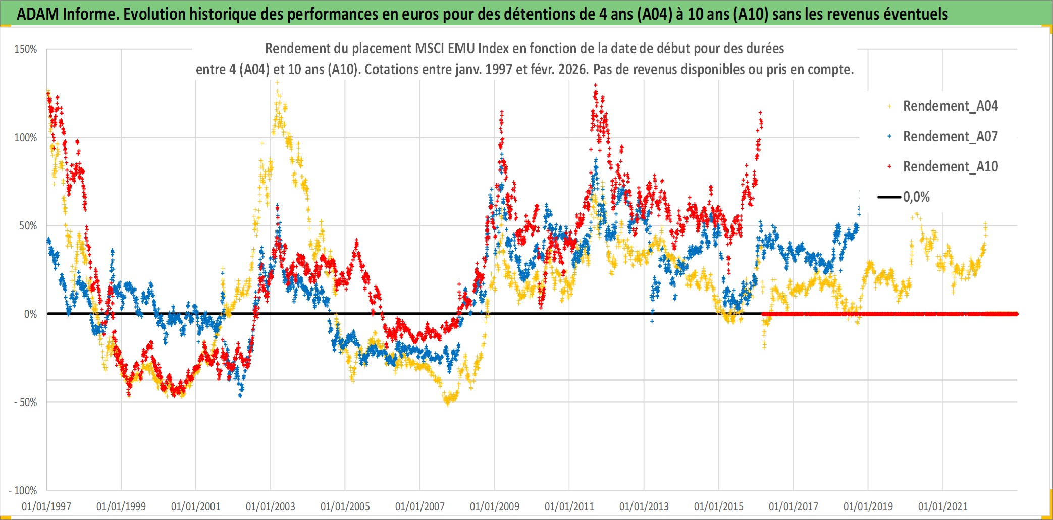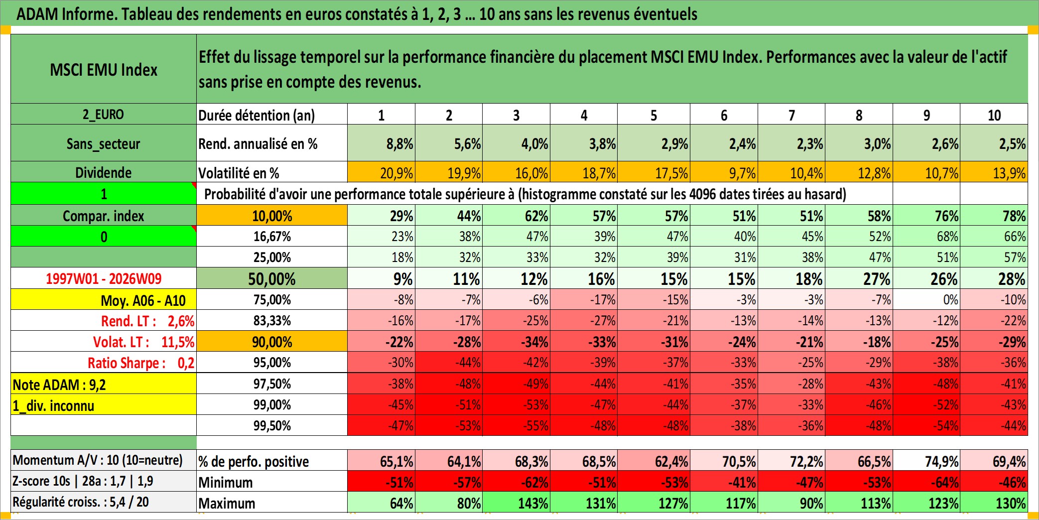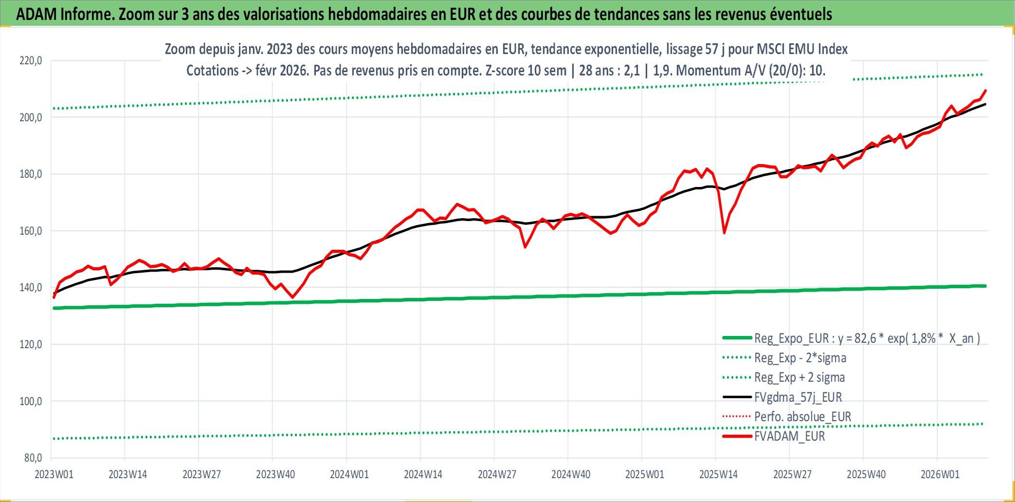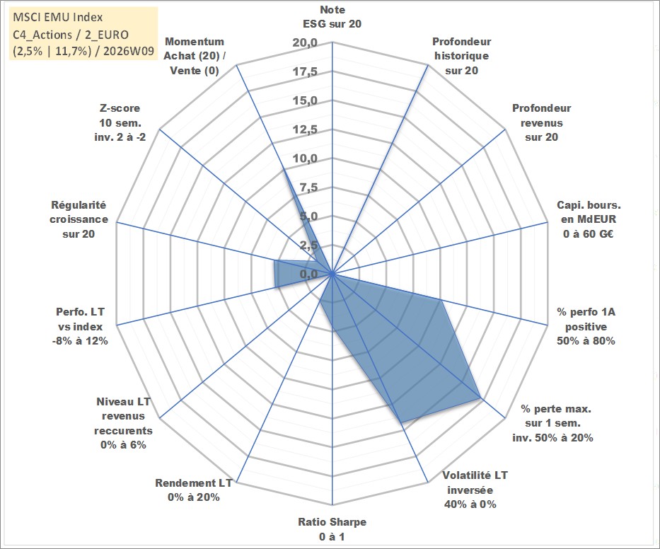 Site dédié aux investisseursPage dédiée sur site financeAnalyse des valorisations hebdomadaires de l'actif MSCI EMU Index. Cet actif est cote en EUR. Les valorisations couvrent les semaines 1997W01 a 2026W09. Les revenus de cet actif financier ne sont pas connus car non existants ou non disponibles sur le site Yahoo Finance. La note ESG de cet actif n'est pas connue.