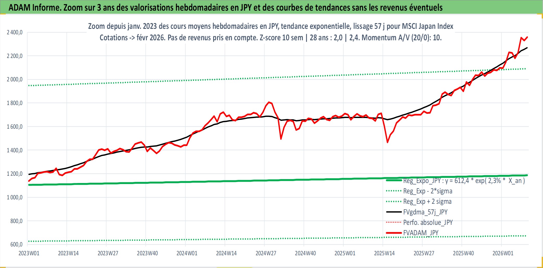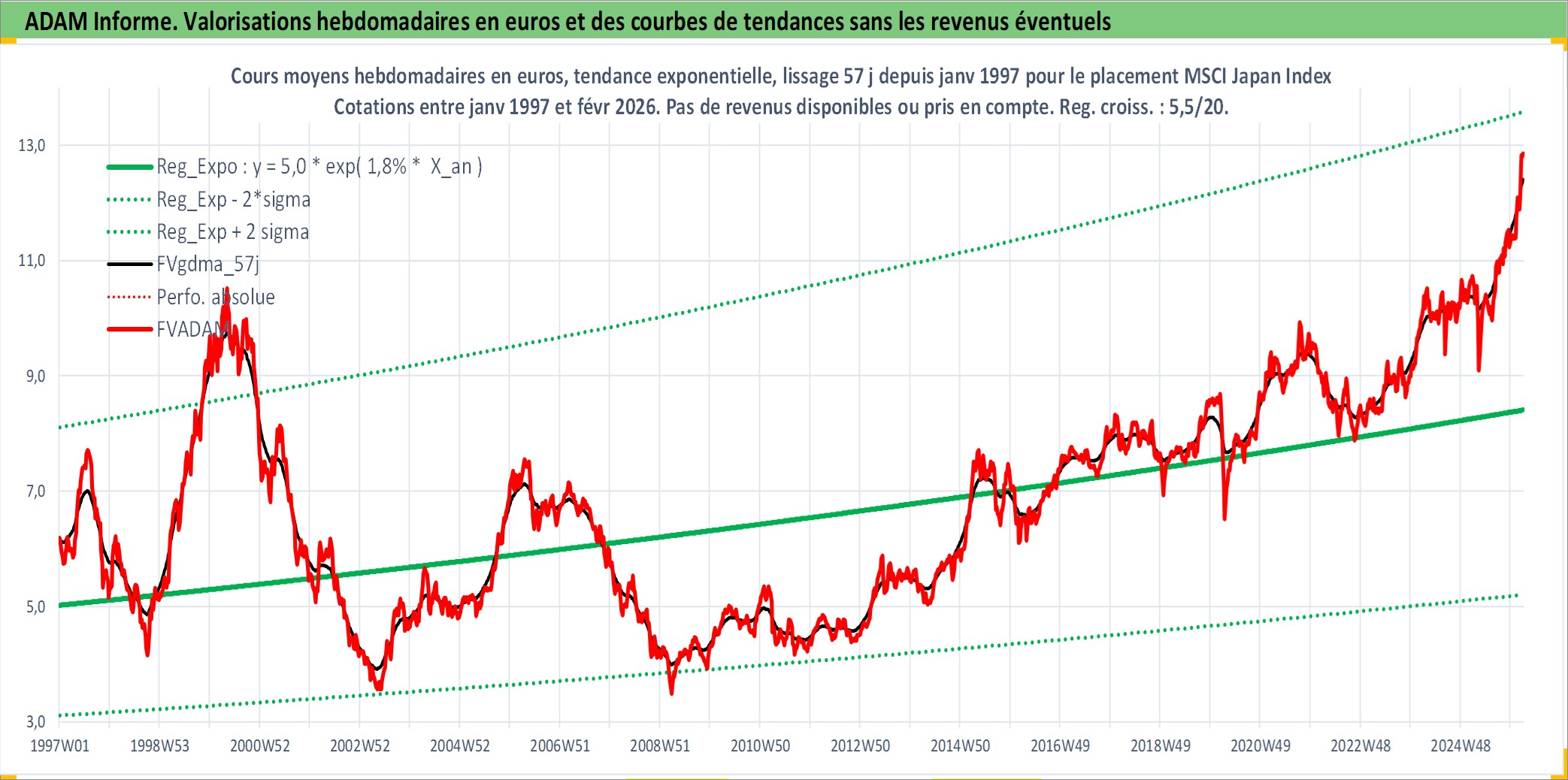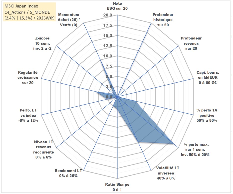 Site dédié aux investisseursPage dédiée sur site financeAnalyse des valorisations hebdomadaires de l'actif MSCI Japan Index. Cet actif est cote en JPY. Les valorisations sont en contrevaleur EURO et couvrent les semaines 1997W01 a 2026W09. Les revenus de cet actif financier ne sont pas connus car non existants ou non disponibles sur le site Yahoo Finance. La note ESG de cet actif n'est pas connue.