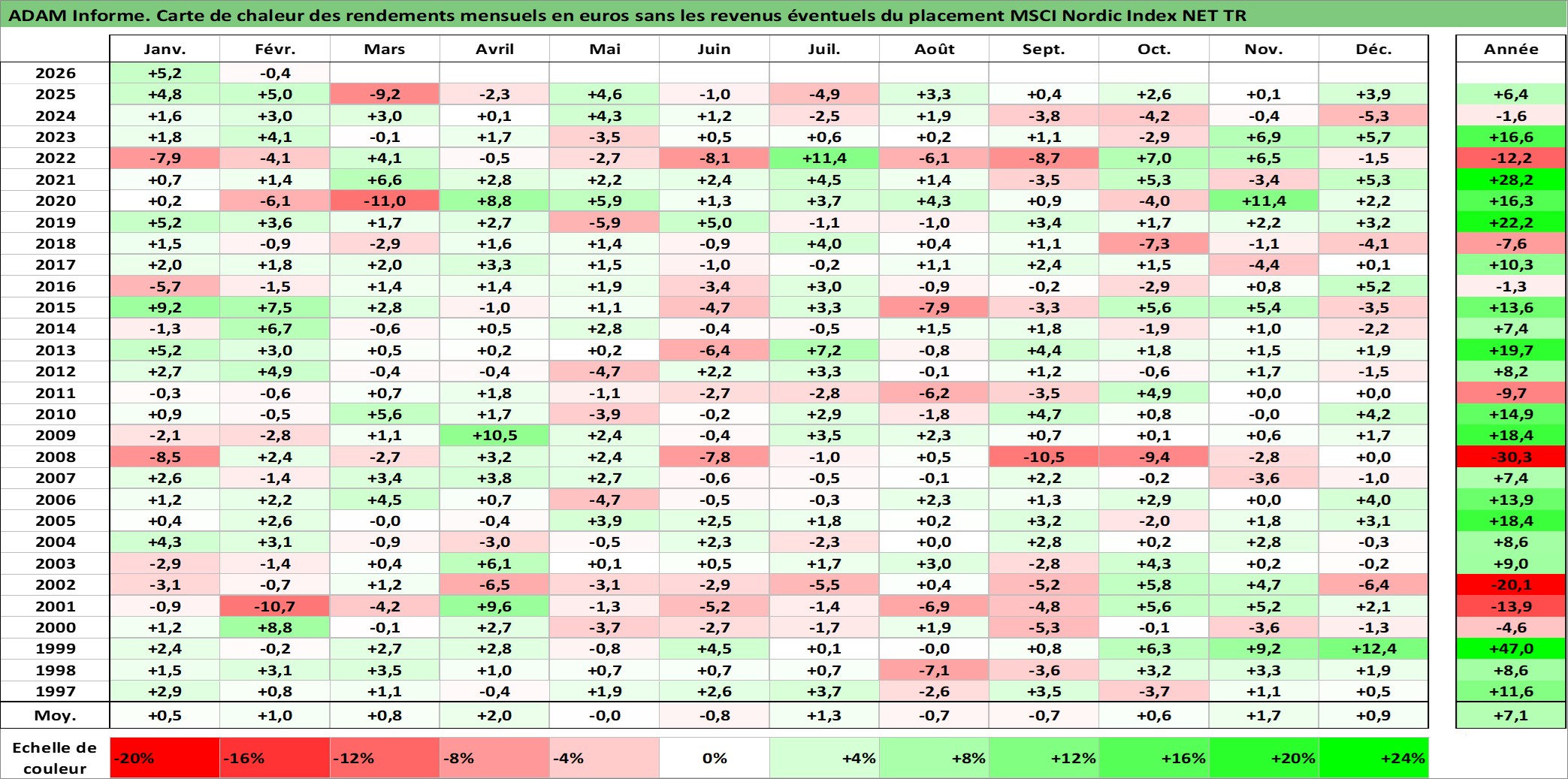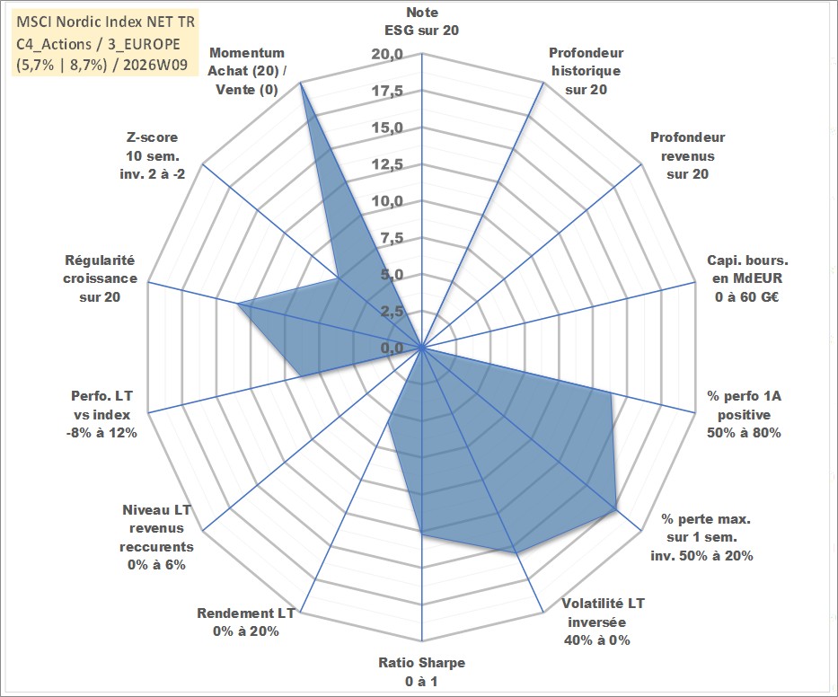 Site dédié aux investisseursPage dédiée sur site financeAnalyse des valorisations hebdomadaires de l'actif MSCI Nordic Index NET TR. Cet actif est cote en EUR. Les valorisations couvrent les semaines 1997W01 a 2026W09. Les revenus de cet actif financier ne sont pas connus car non existants ou non disponibles sur le site Yahoo Finance. La note ESG de cet actif n'est pas connue.