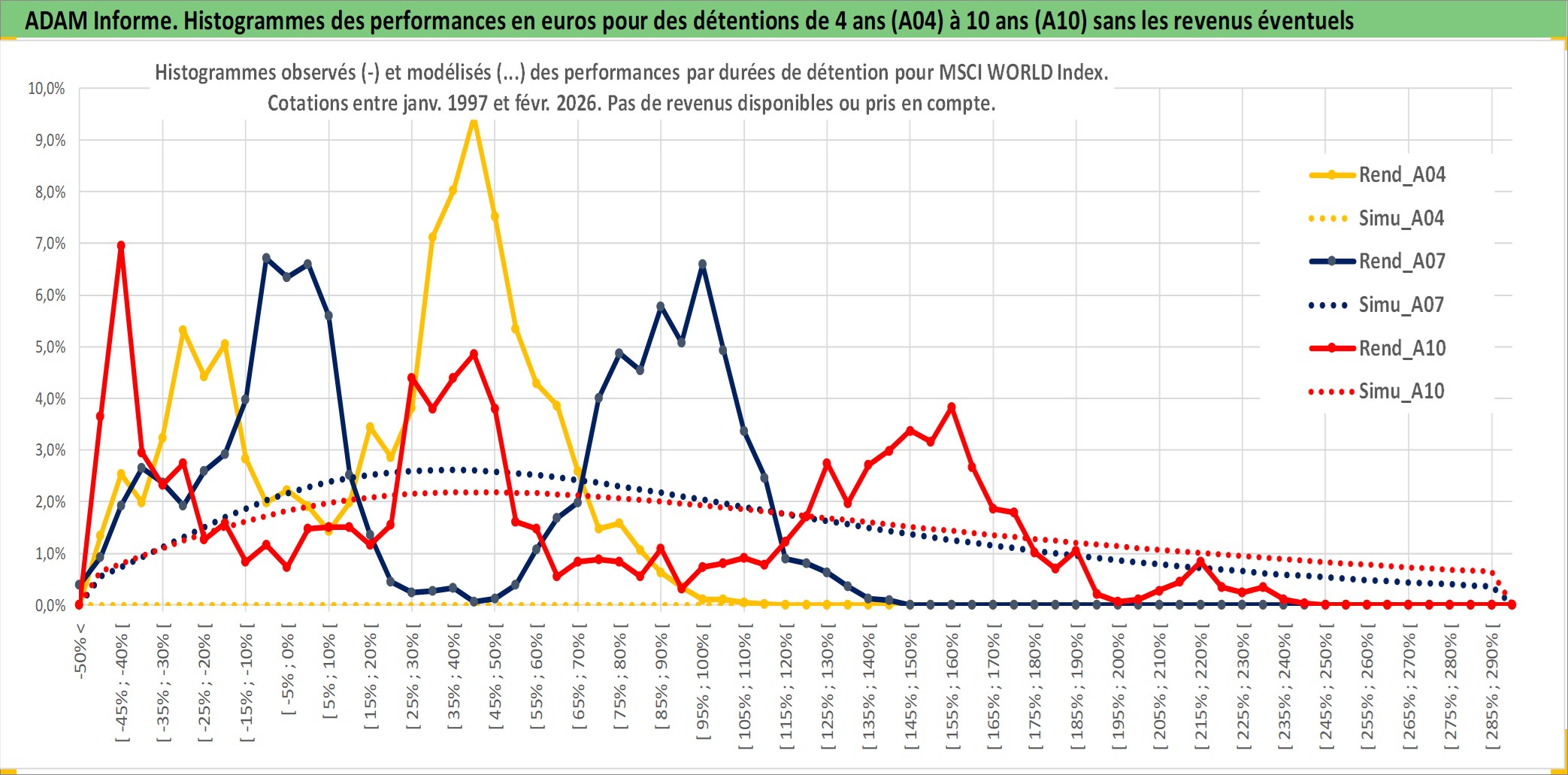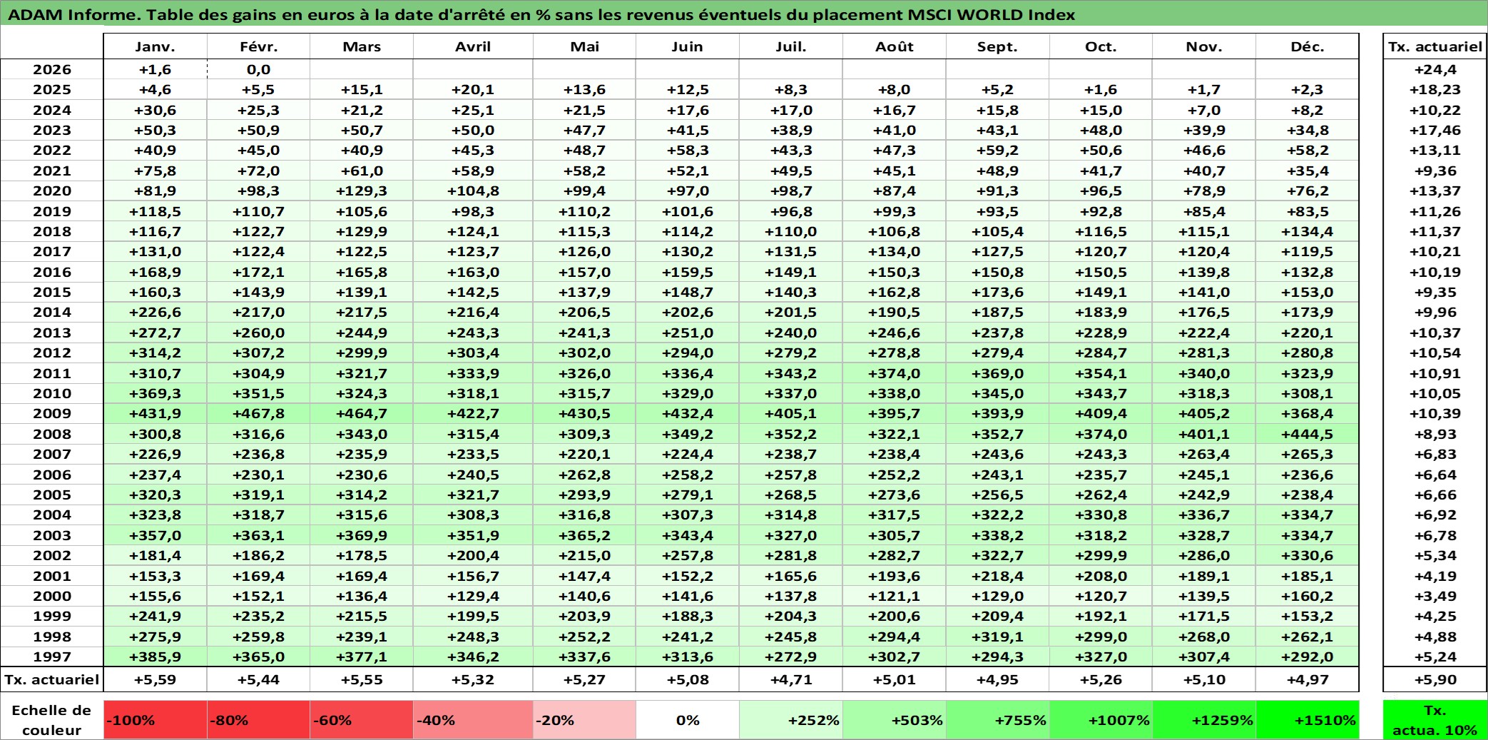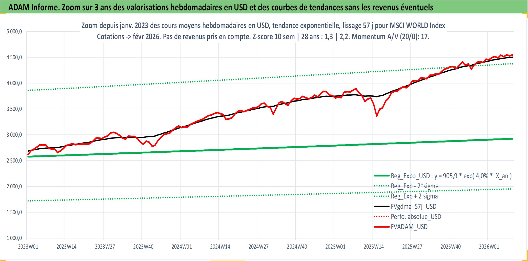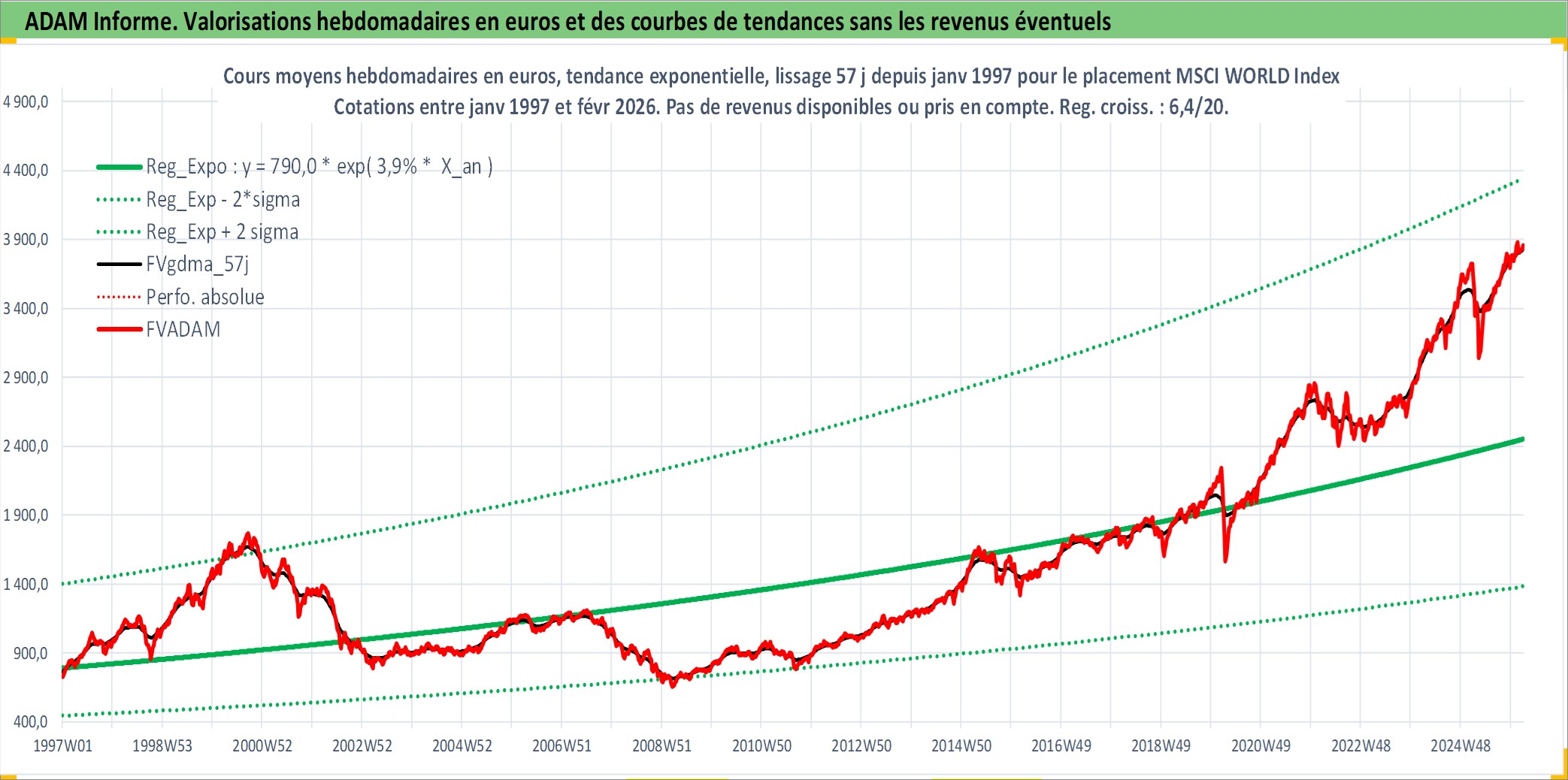 Site dédié aux investisseursPage dédiée sur site financeAnalyse des valorisations hebdomadaires de l'actif MSCI WORLD Index. Cet actif est cote en USD. Les valorisations sont en contrevaleur EURO et couvrent les semaines 1997W01 a 2026W09. Les revenus de cet actif financier ne sont pas connus car non existants ou non disponibles sur le site Yahoo Finance. La note ESG de cet actif n'est pas connue.