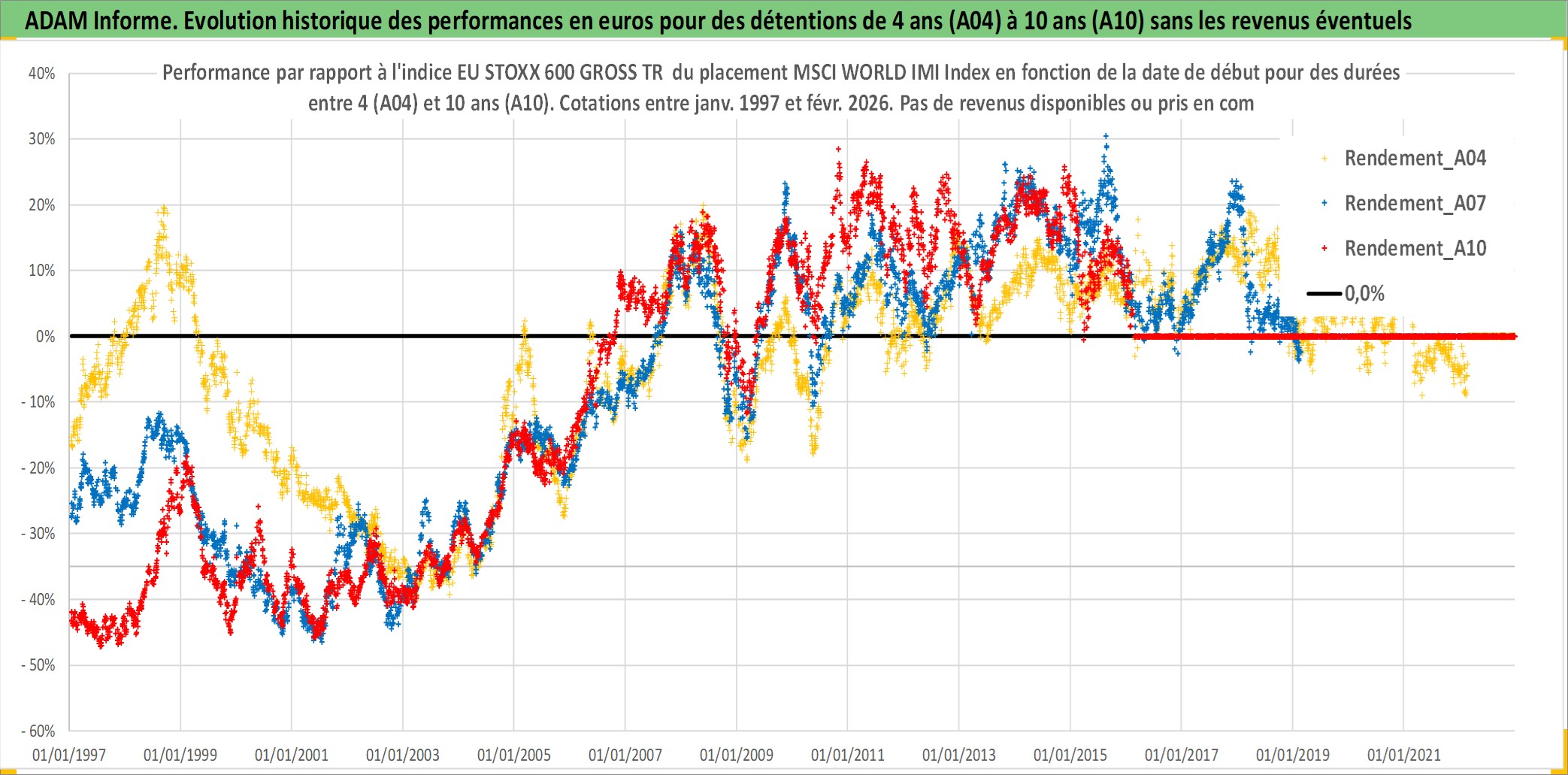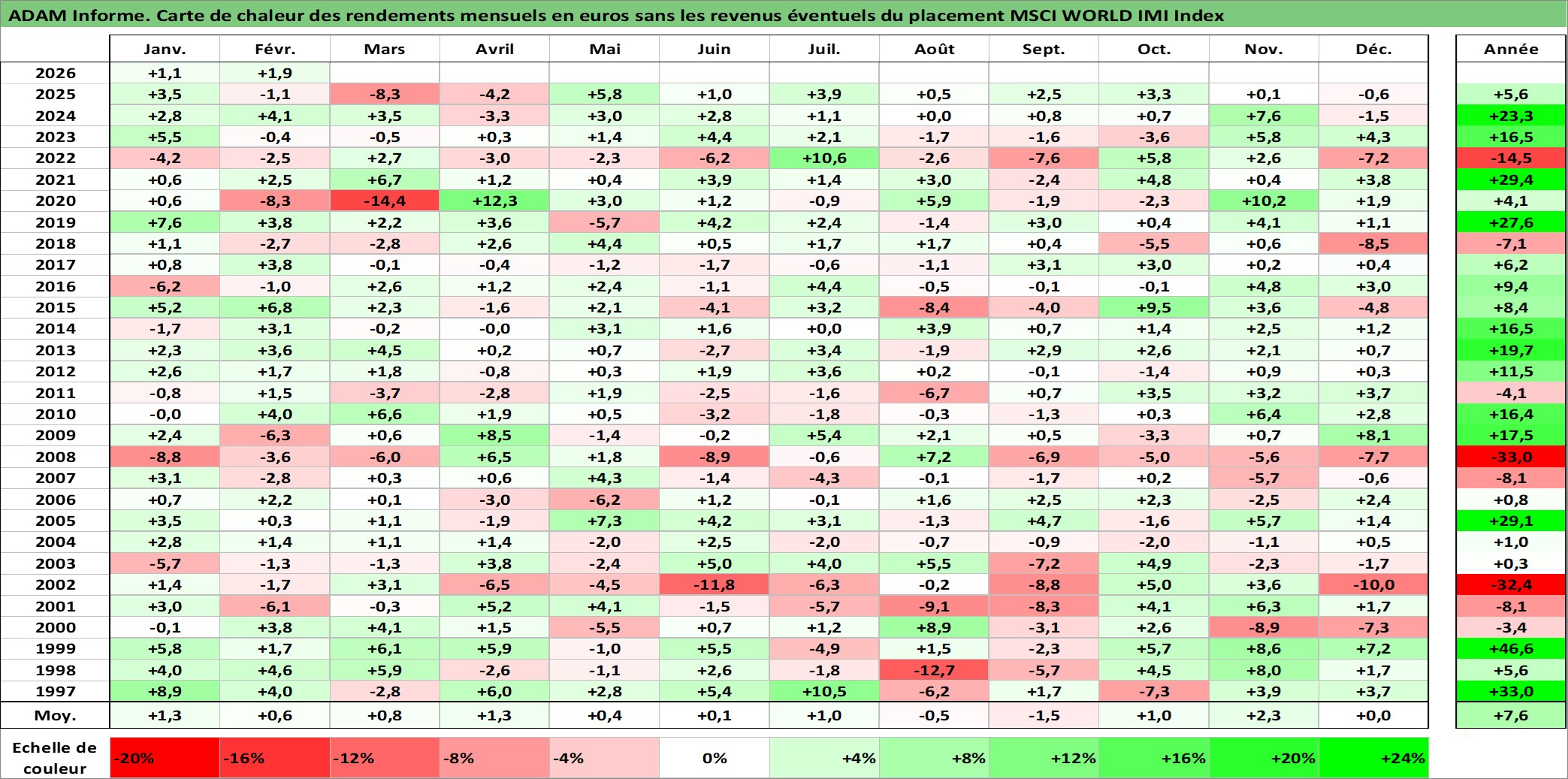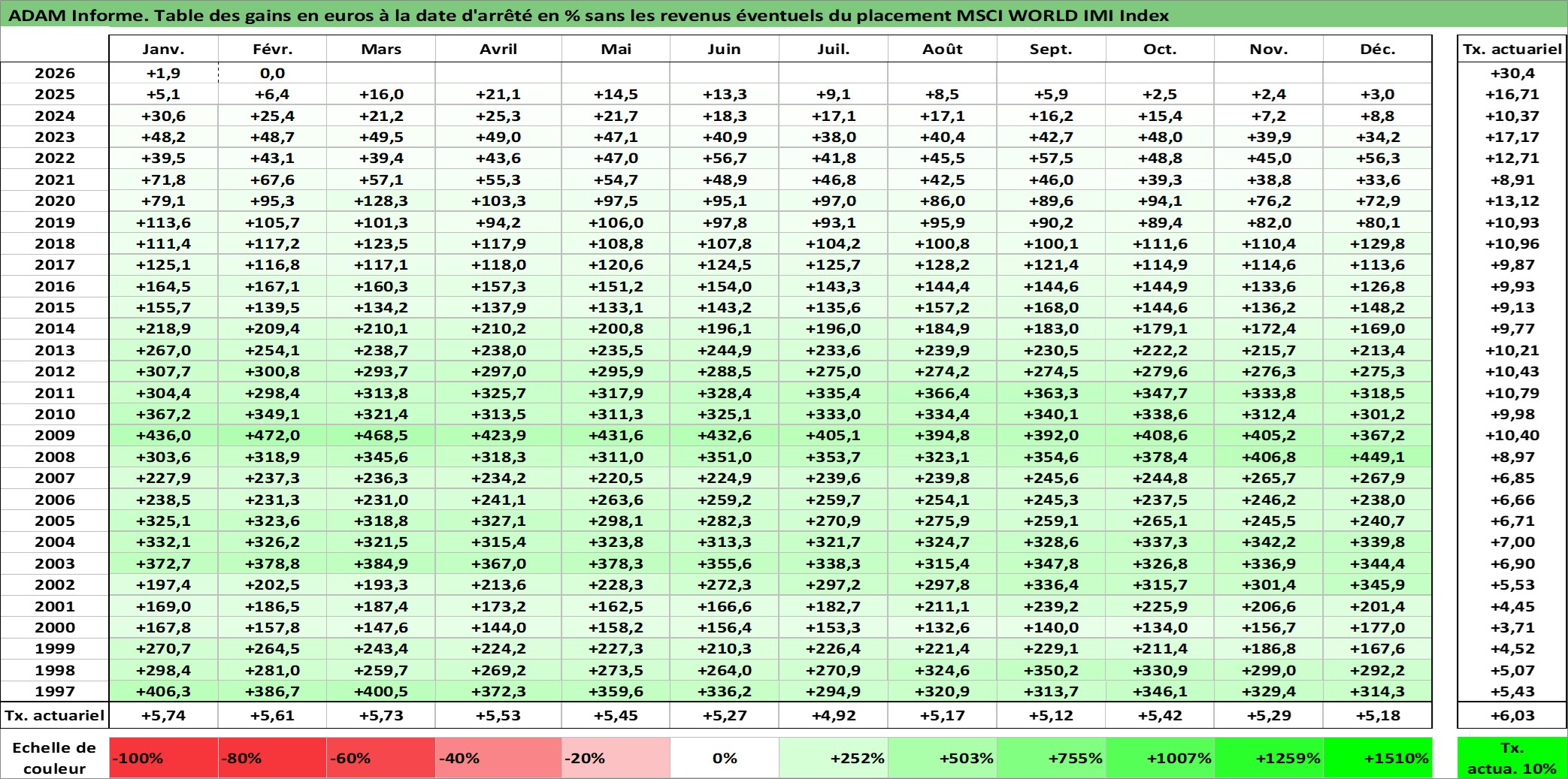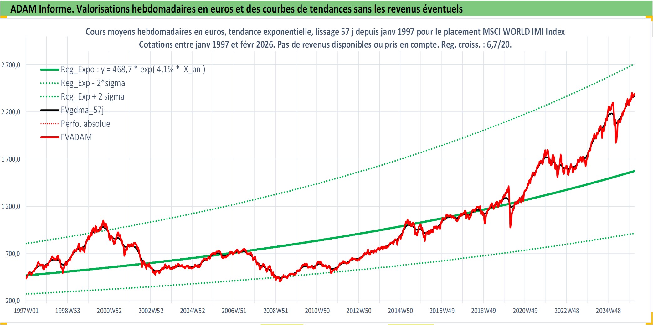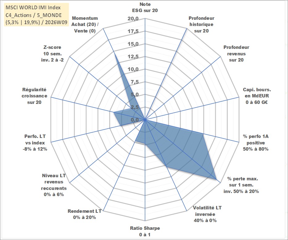 Site dédié aux investisseursPage dédiée sur site financeAnalyse des valorisations hebdomadaires de l'actif MSCI WORLD IMI Index. Cet actif est cote en USD. Les valorisations sont en contrevaleur EURO et couvrent les semaines 1997W01 a 2026W09. Les revenus de cet actif financier ne sont pas connus car non existants ou non disponibles sur le site Yahoo Finance. La note ESG de cet actif n'est pas connue.
