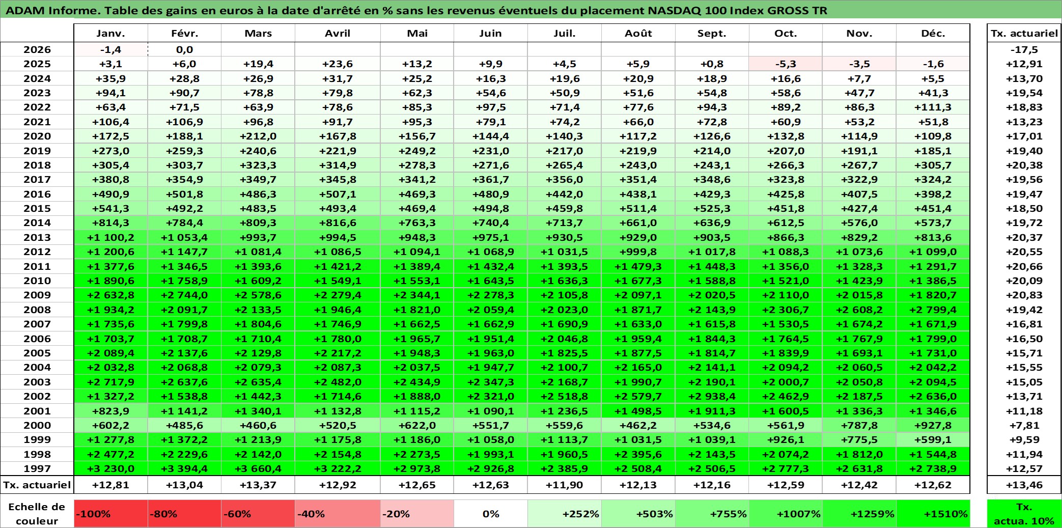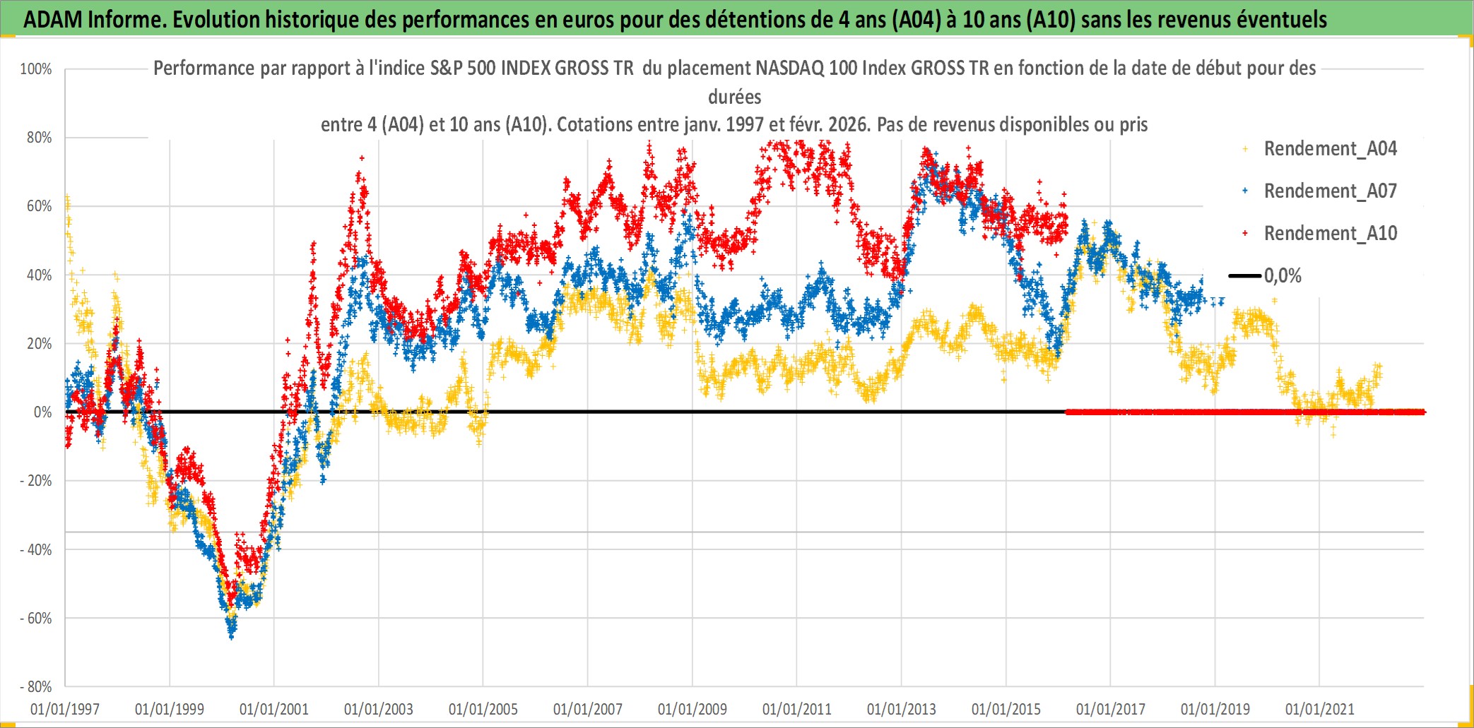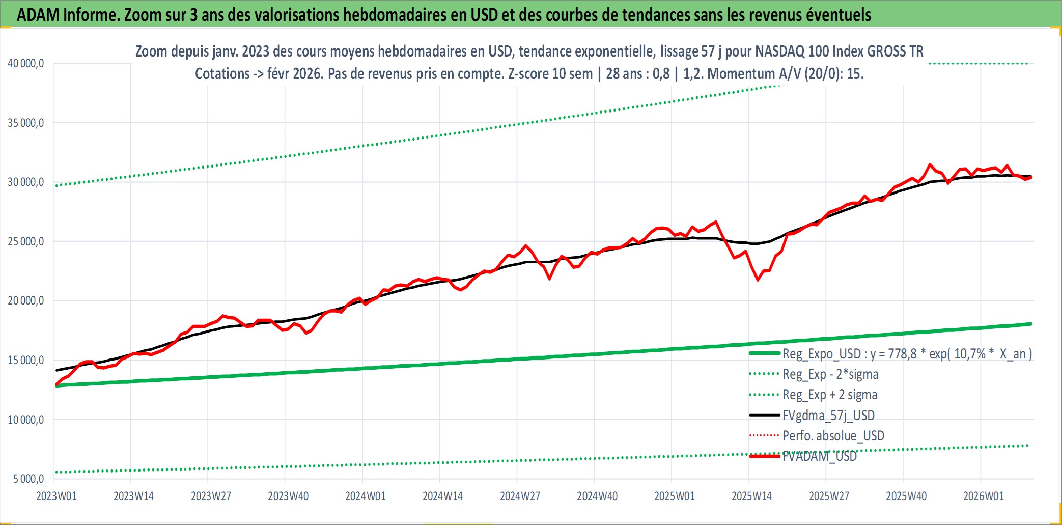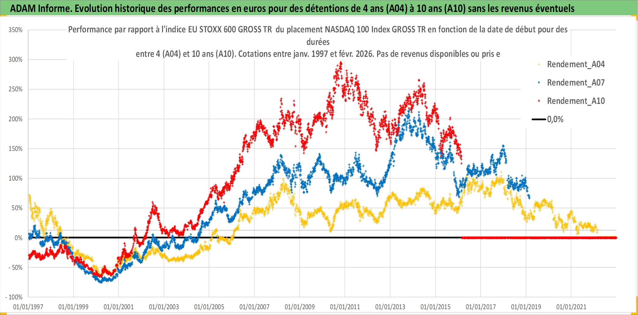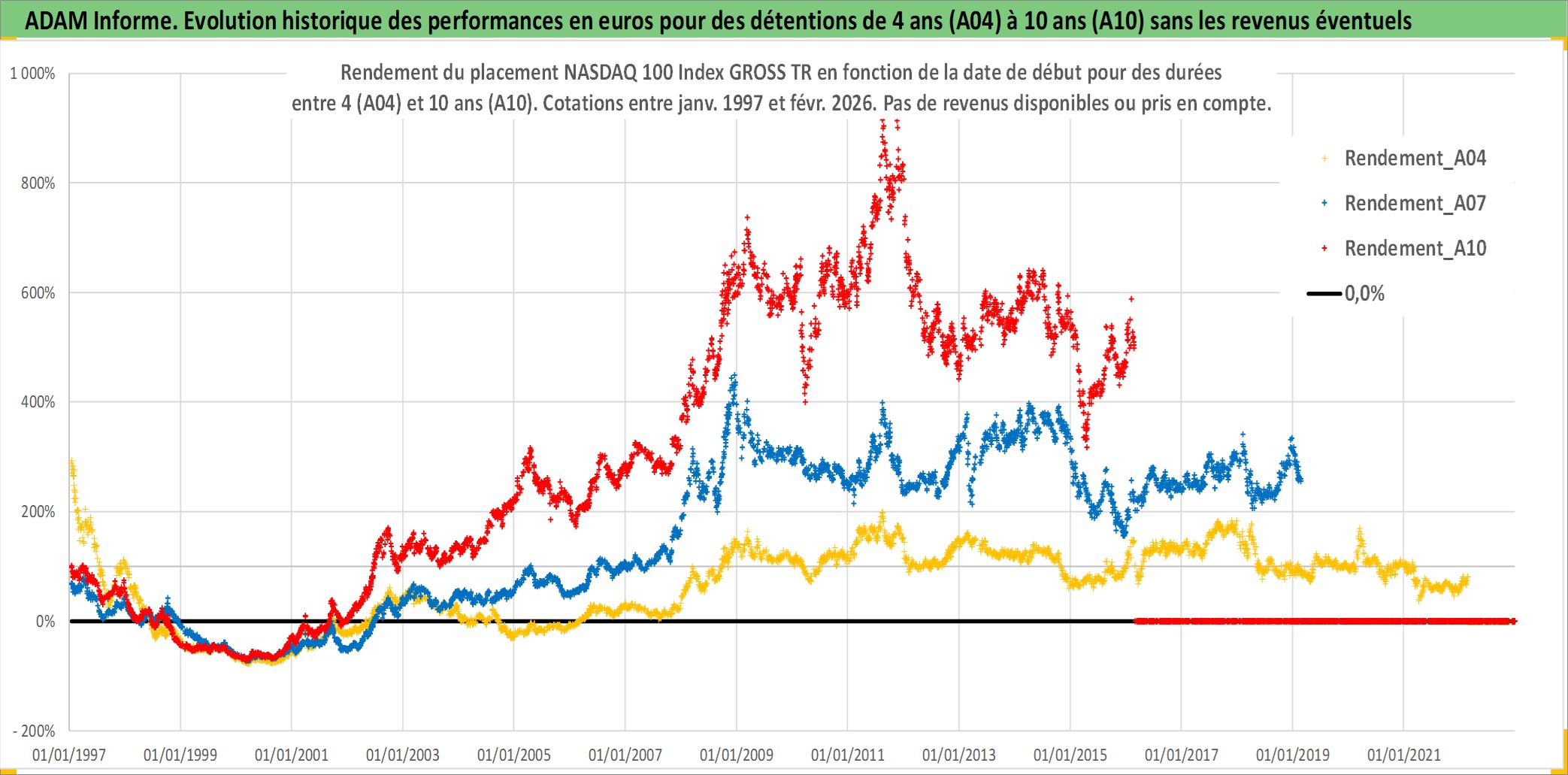 Site dédié aux investisseursPage dédiée sur site financeAnalyse des valorisations hebdomadaires de l'actif NASDAQ 100 Index GROSS TR. Cet actif est cote en USD. Les valorisations sont en contrevaleur EURO et couvrent les semaines 1997W01 a 2026W09. Les revenus de cet actif financier ne sont pas connus car non existants ou non disponibles sur le site Yahoo Finance. La note ESG de cet actif n'est pas connue.