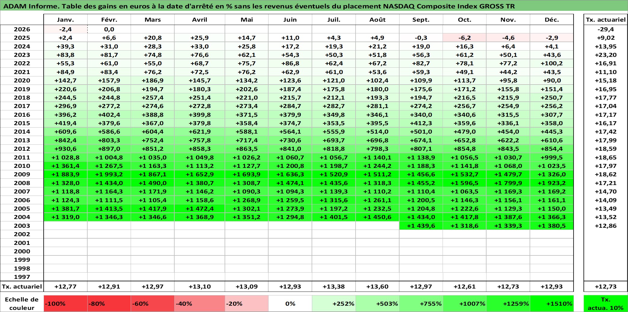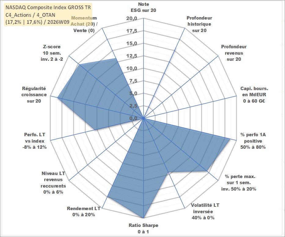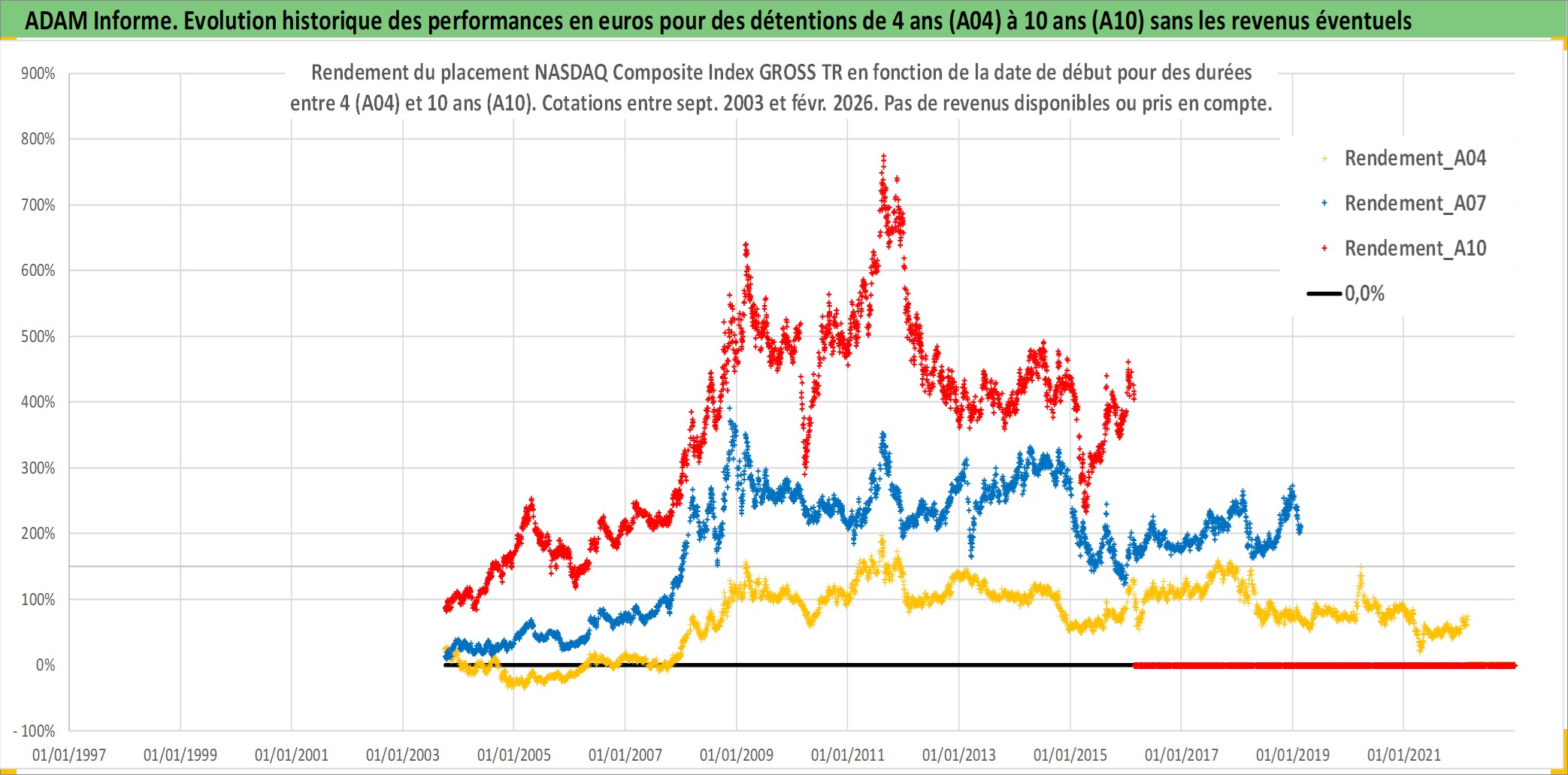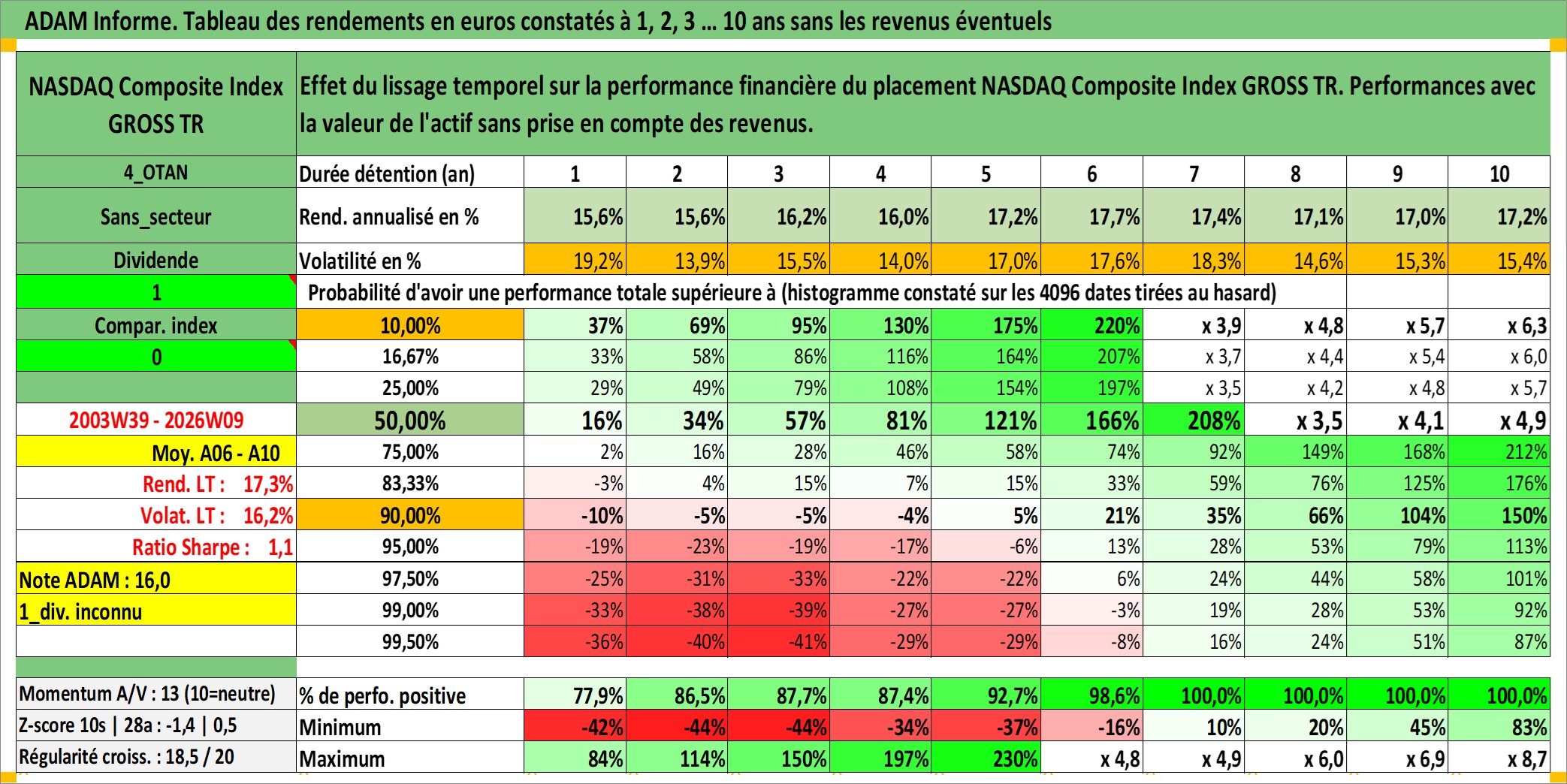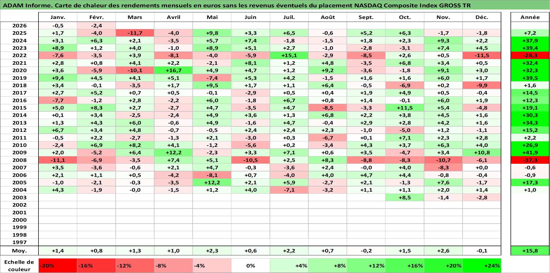 Site dédié aux investisseursPage dédiée sur site financeAnalyse des valorisations hebdomadaires de l'actif NASDAQ Composite Index GROSS TR. Cet actif est cote en USD. Les valorisations sont en contrevaleur EURO et couvrent les semaines 2003W39 a 2026W09. Les revenus de cet actif financier ne sont pas connus car non existants ou non disponibles sur le site Yahoo Finance. La note ESG de cet actif n'est pas connue.