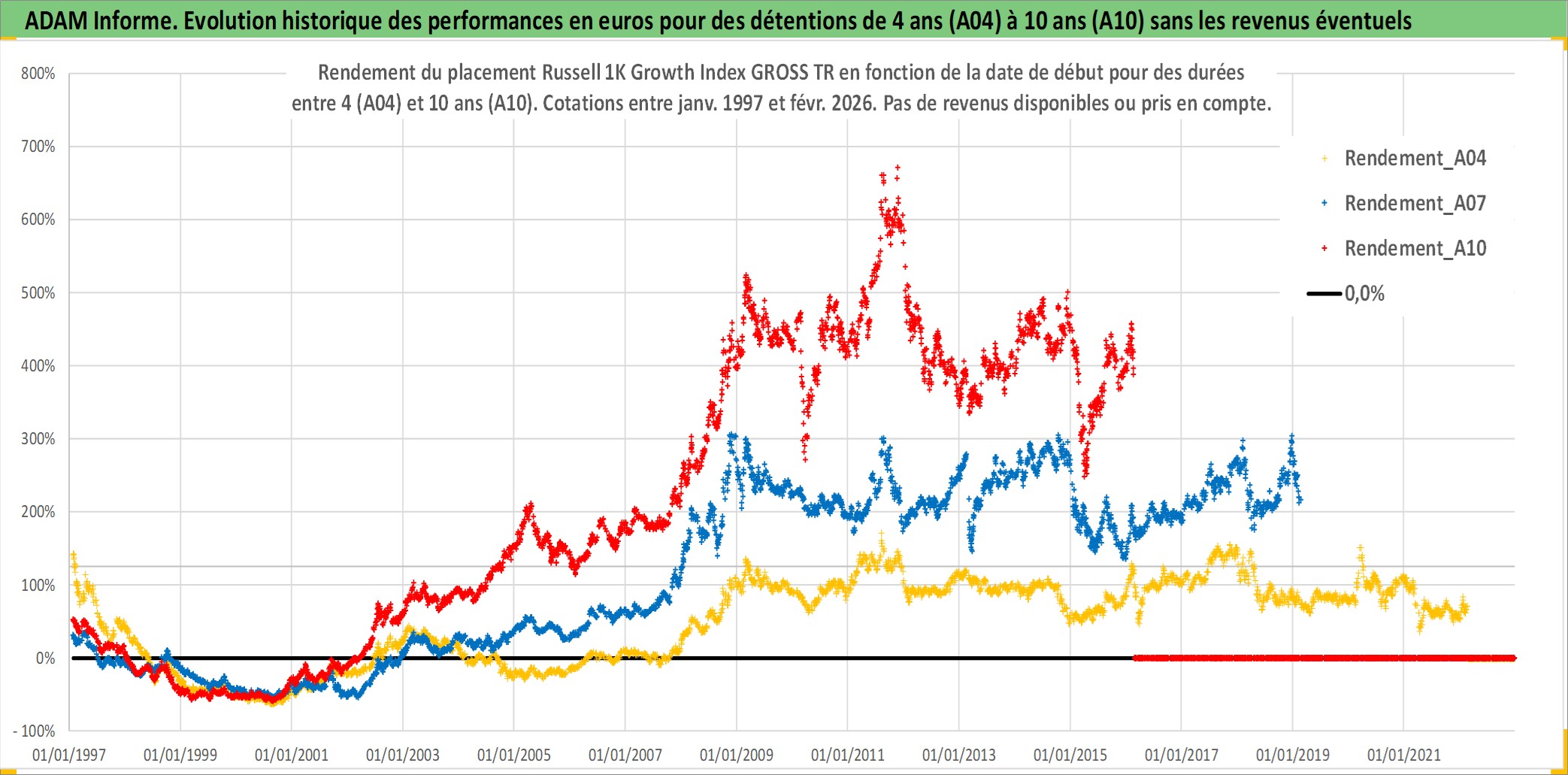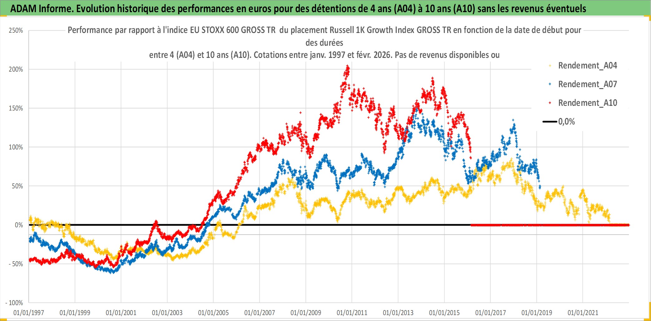 Site dédié aux investisseursPage dédiée sur site financeAnalyse des valorisations hebdomadaires de l'actif Russell 1K Growth Index GROSS TR. Cet actif est cote en USD. Les valorisations sont en contrevaleur EURO et couvrent les semaines 1997W01 a 2026W09. Les revenus de cet actif financier ne sont pas connus car non existants ou non disponibles sur le site Yahoo Finance. La note ESG de cet actif n'est pas connue.