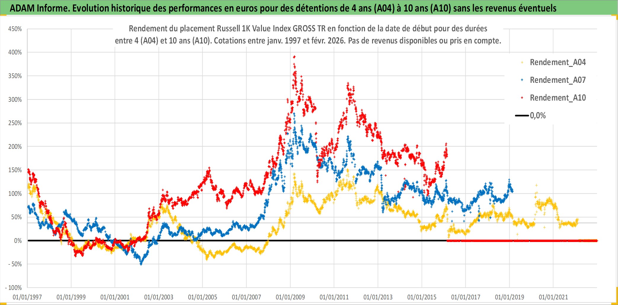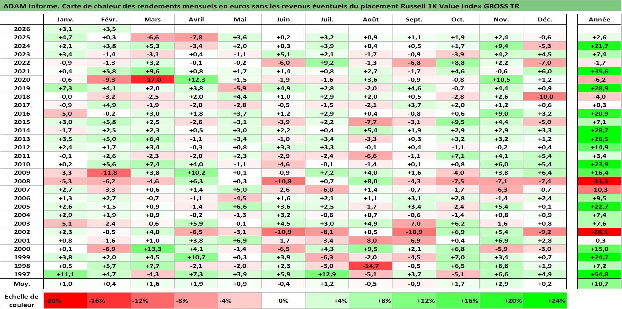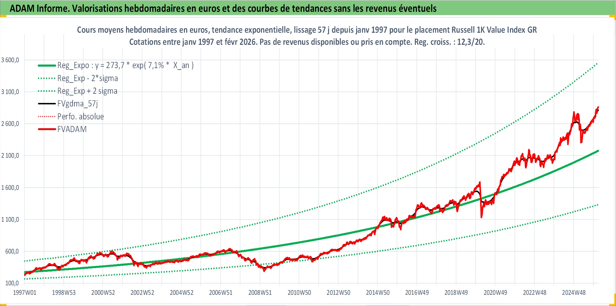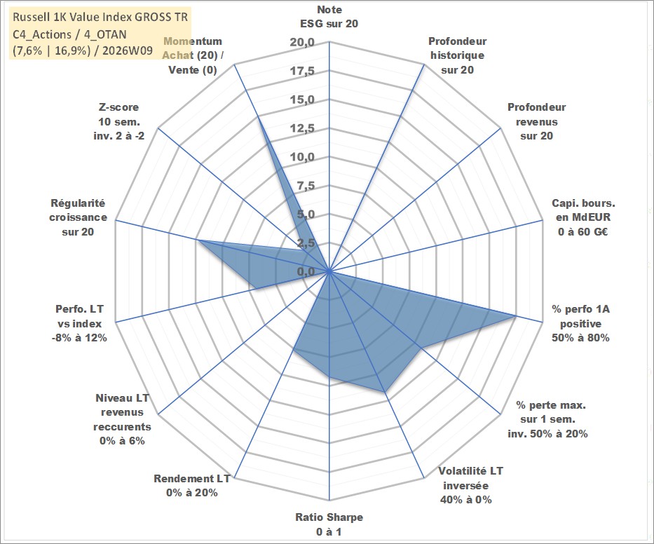 Site dédié aux investisseursPage dédiée sur site financeAnalyse des valorisations hebdomadaires de l'actif Russell 1K Value Index GROSS TR. Cet actif est cote en USD. Les valorisations sont en contrevaleur EURO et couvrent les semaines 1997W01 a 2026W09. Les revenus de cet actif financier ne sont pas connus car non existants ou non disponibles sur le site Yahoo Finance. La note ESG de cet actif n'est pas connue.