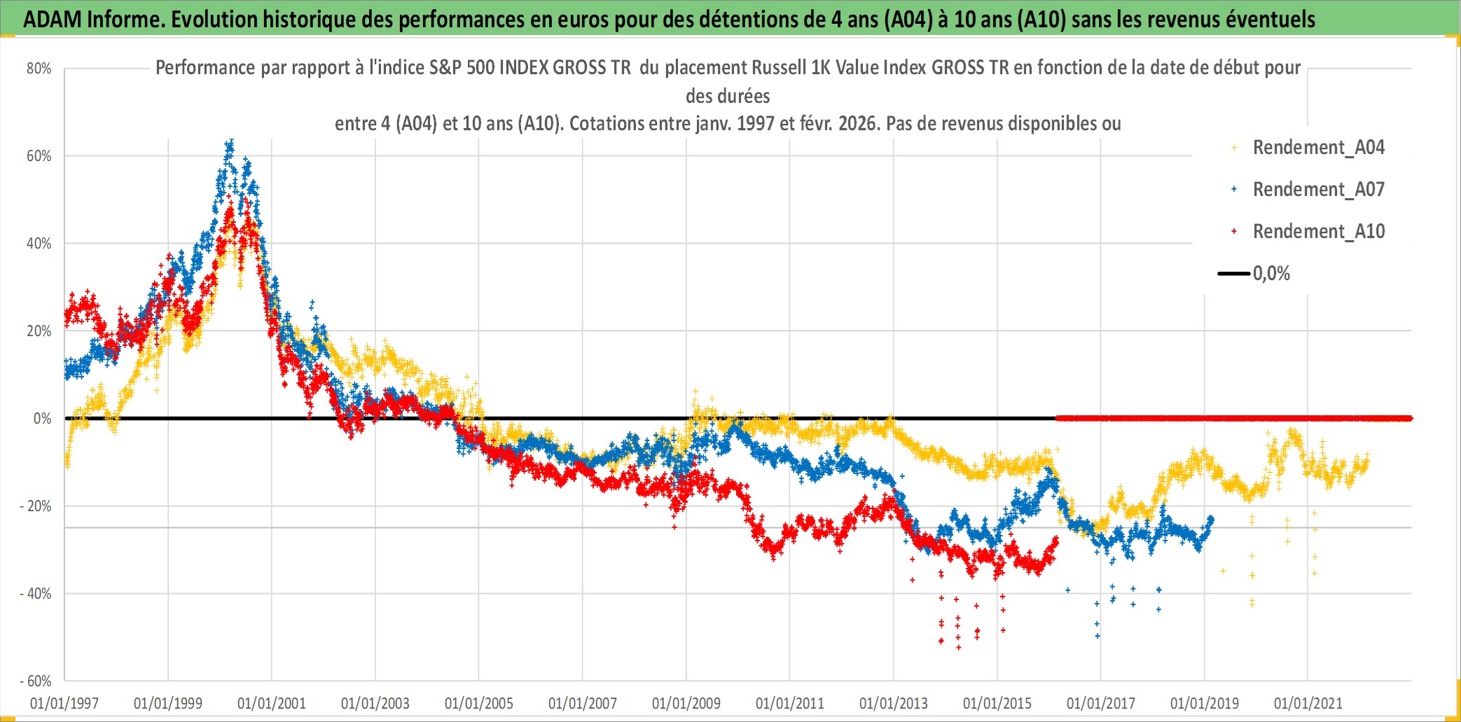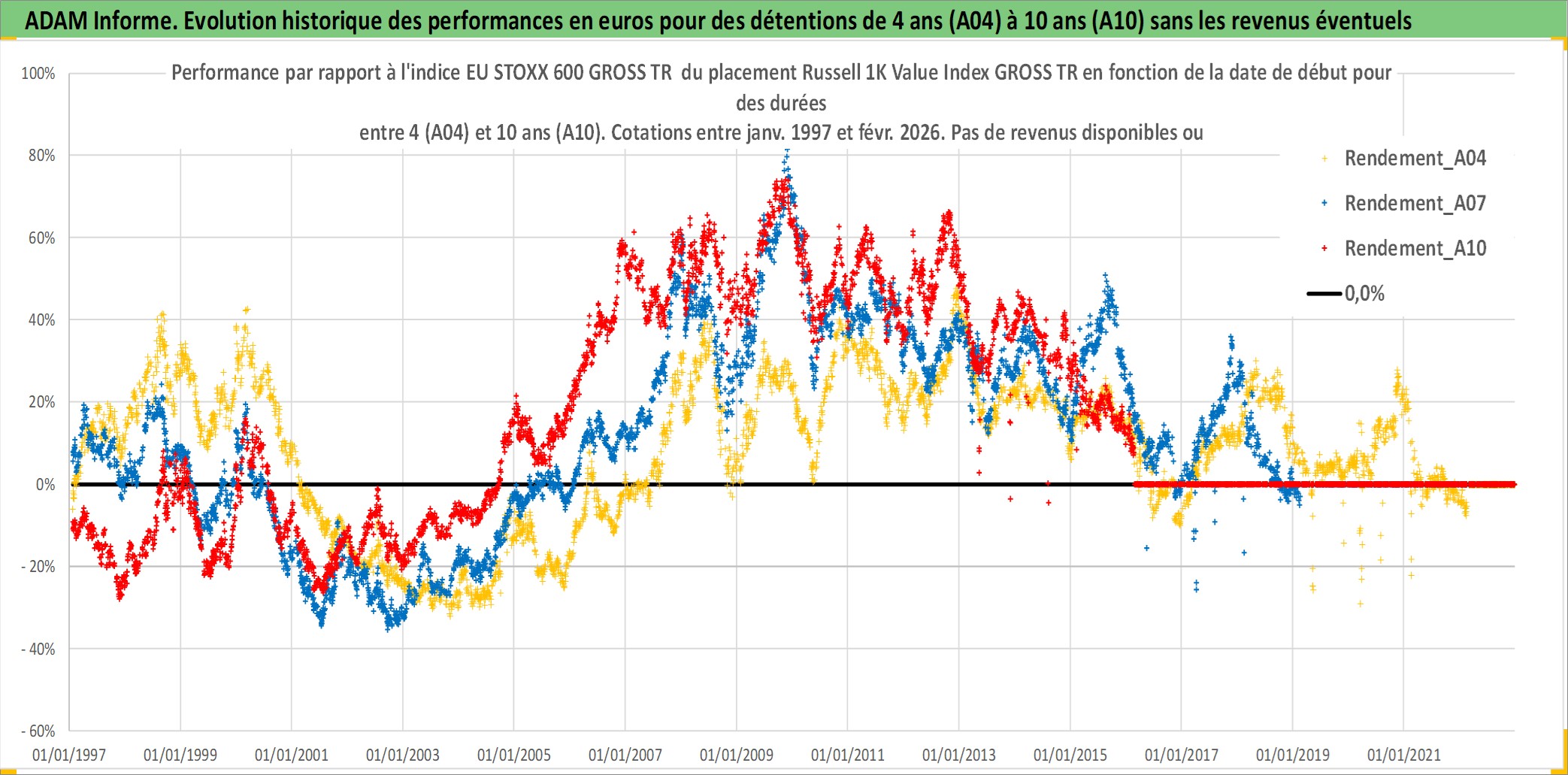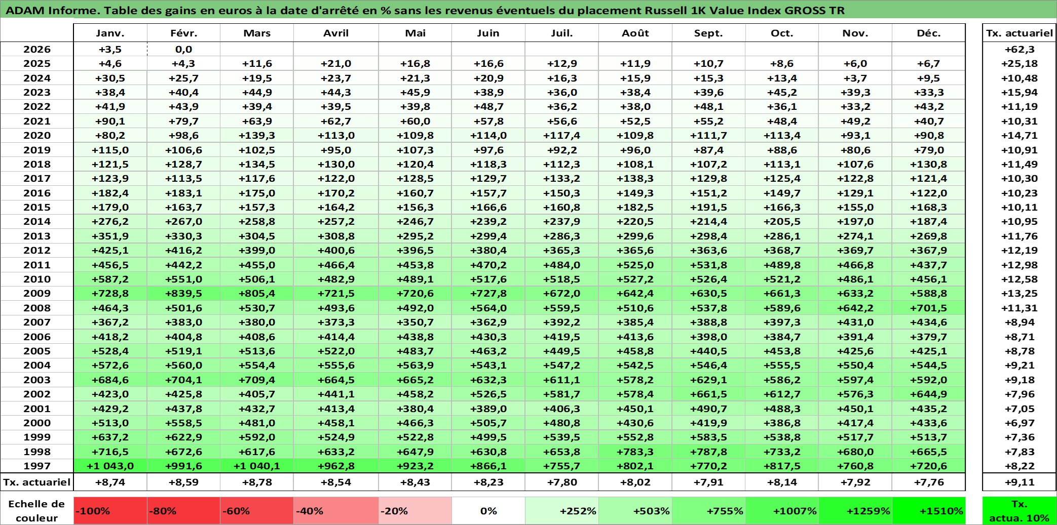 Site dédié aux investisseursPage dédiée sur site financeAnalyse des valorisations hebdomadaires de l'actif Russell 1K Value Index GROSS TR. Cet actif est cote en USD. Les valorisations sont en contrevaleur EURO et couvrent les semaines 1997W01 a 2026W09. Les revenus de cet actif financier ne sont pas connus car non existants ou non disponibles sur le site Yahoo Finance. La note ESG de cet actif n'est pas connue.