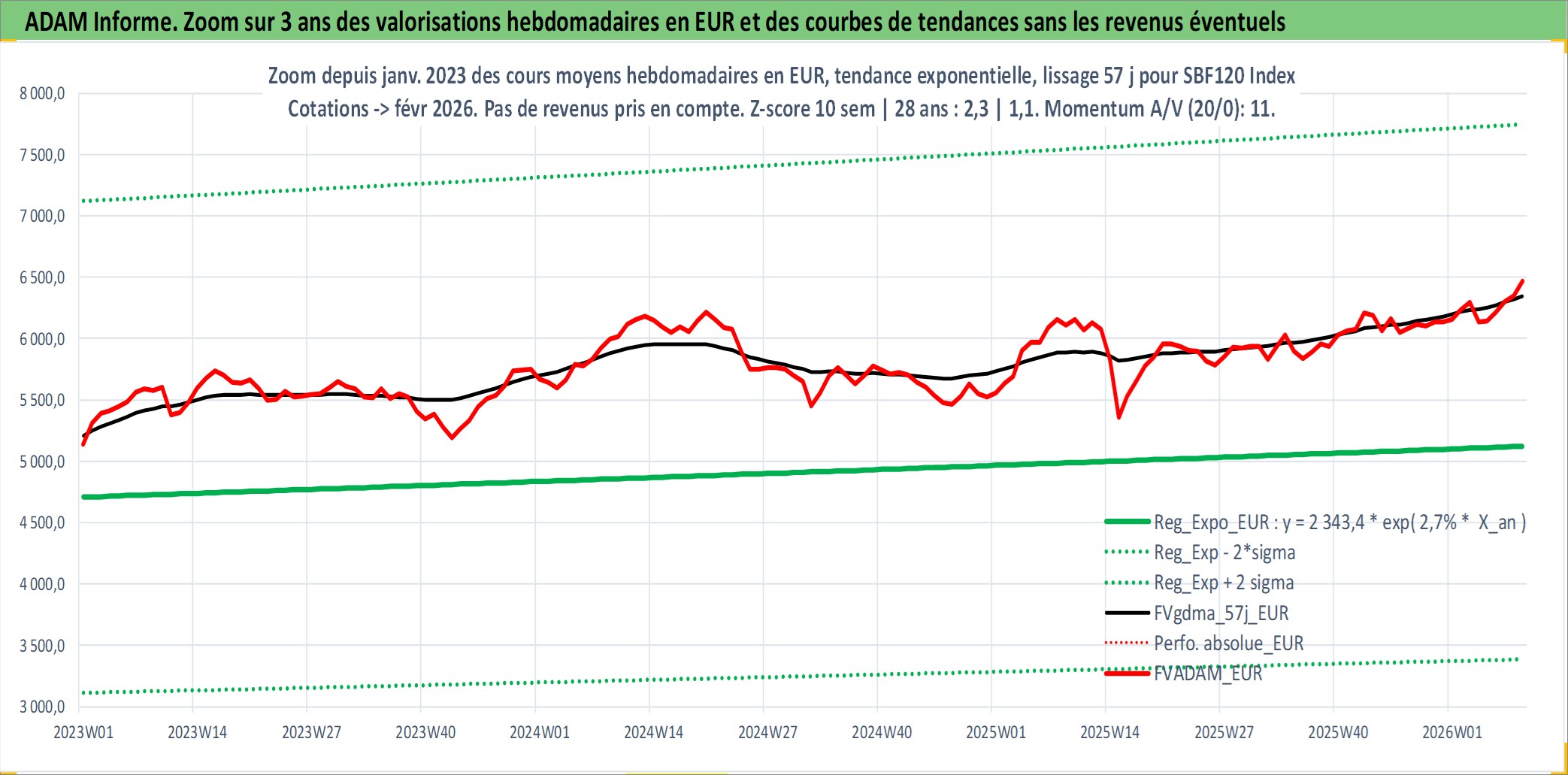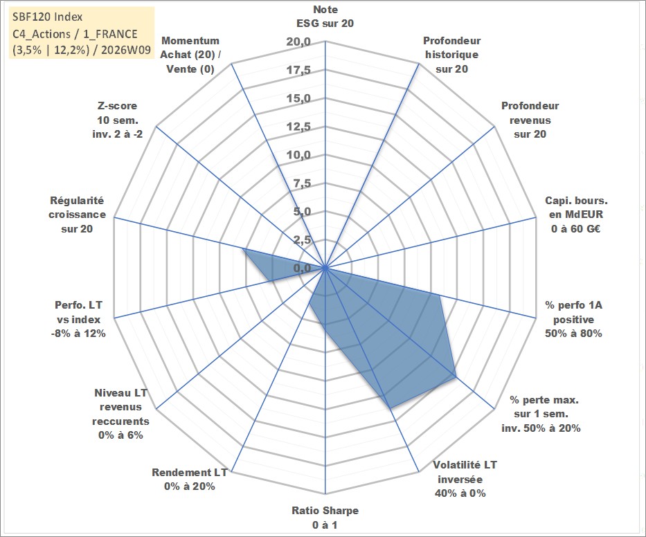 Site dédié aux investisseursPage dédiée sur site financeAnalyse des valorisations hebdomadaires de l'actif SBF120 Index. Cet actif est cote en EUR. Les valorisations couvrent les semaines 1997W01 a 2026W09. Les revenus de cet actif financier ne sont pas connus car non existants ou non disponibles sur le site Yahoo Finance. La note ESG de cet actif n'est pas connue.