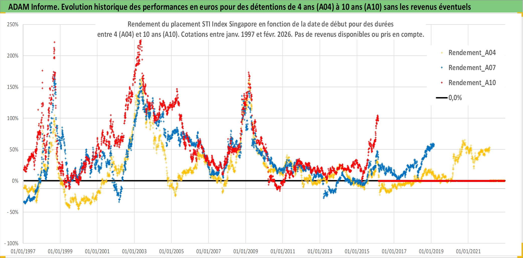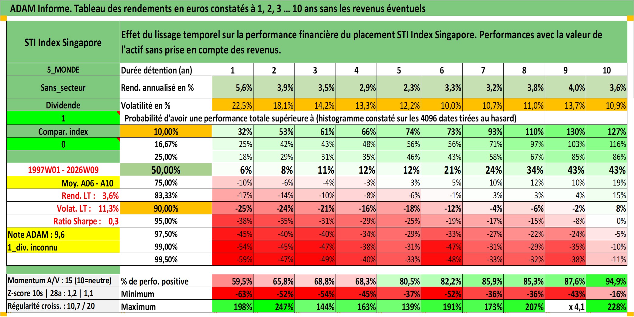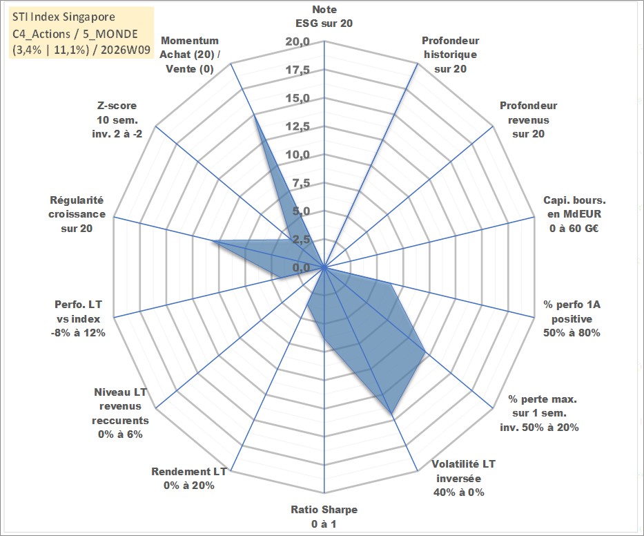 Site dédié aux investisseursPage dédiée sur site financeAnalyse des valorisations hebdomadaires de l'actif STI Index Singapore. Cet actif est cote en SGD. Les valorisations sont en contrevaleur EURO et couvrent les semaines 1997W01 a 2026W09. Les revenus de cet actif financier ne sont pas connus car non existants ou non disponibles sur le site Yahoo Finance. La note ESG de cet actif n'est pas connue.