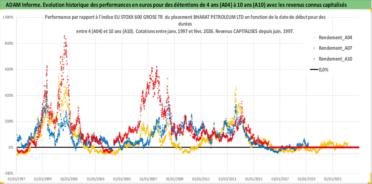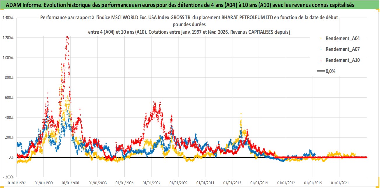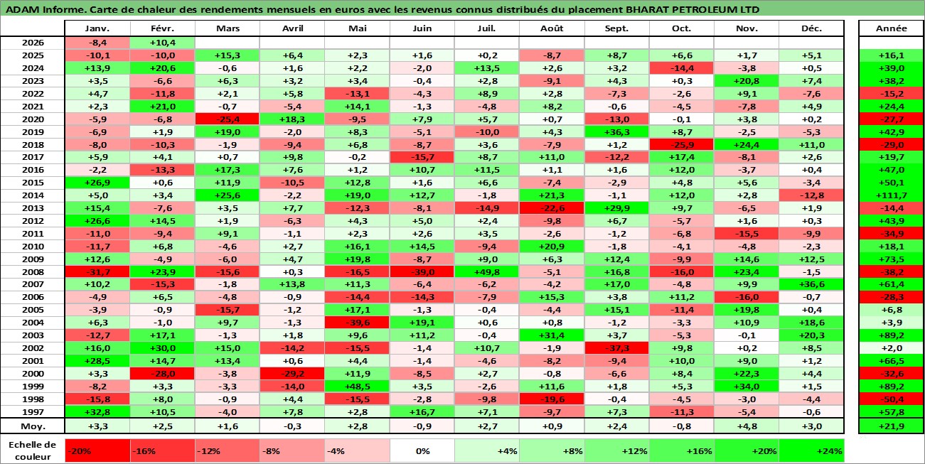Site dédié aux investisseursPage dédiée sur site financeAnalyse des valorisations hebdomadaires de l'action BHARAT PETROLEUM LTD. Cet actif est cote en INR. Les valorisations sont en contrevaleur EURO et couvrent les semaines 1997W01 a 2026W09. Les revenus de cet actif financier sont pris en compte depuis la semaine 1997W26. La note globale ESG de cet actif est estimee a 3.0 (apres rebasage entre 0 et 20).