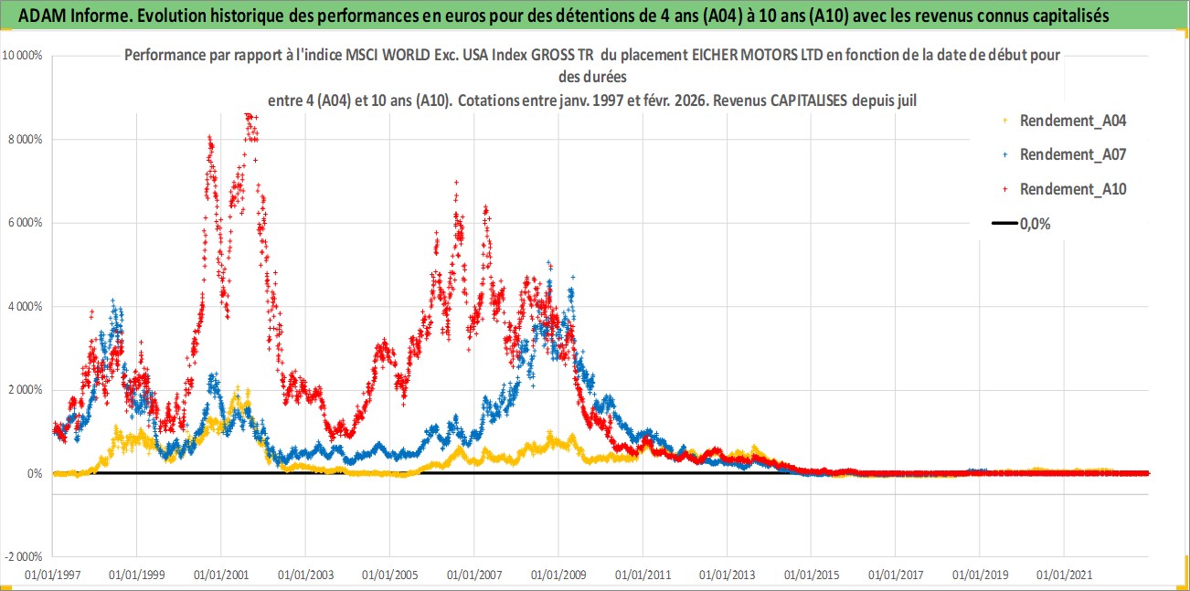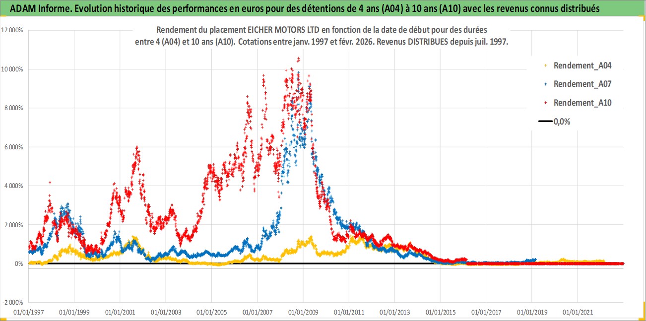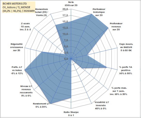 Site dédié aux investisseursPage dédiée sur site financeAnalyse des valorisations hebdomadaires de l'action EICHER MOTORS LTD. Cet actif est cote en INR. Les valorisations sont en contrevaleur EURO et couvrent les semaines 1997W01 a 2026W09. Les revenus de cet actif financier sont pris en compte depuis la semaine 1997W30. La note globale ESG de cet actif est estimee a 15.0 (apres rebasage entre 0 et 20).