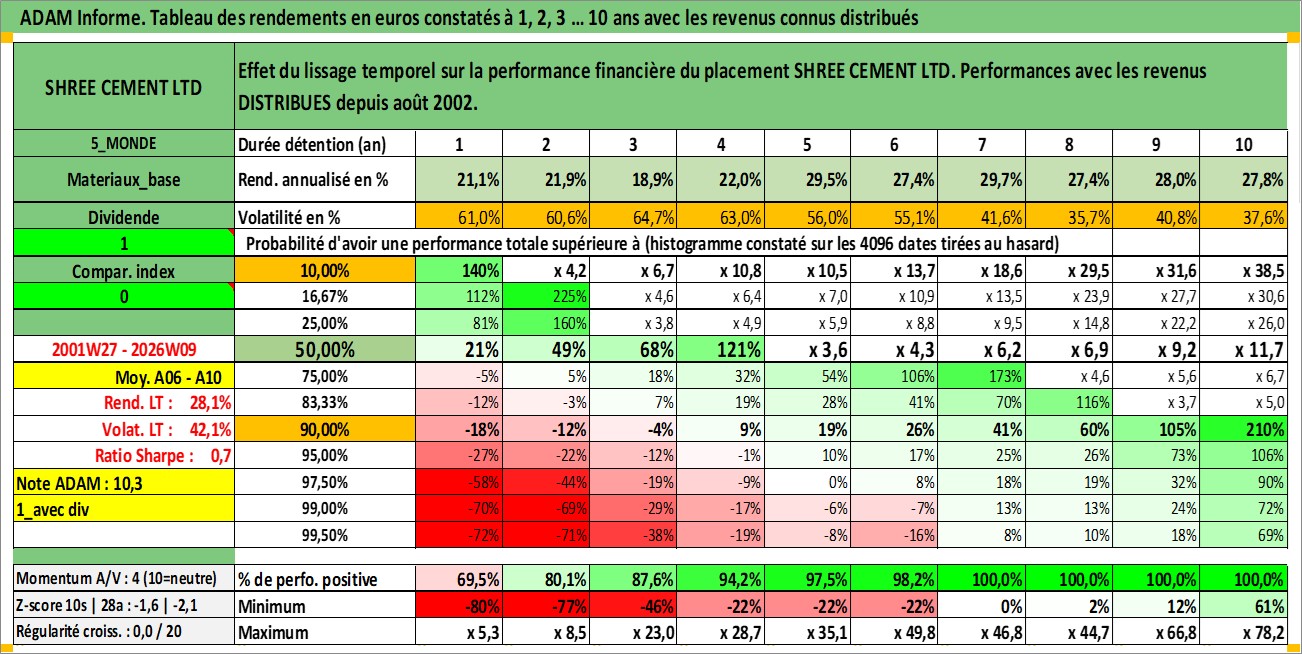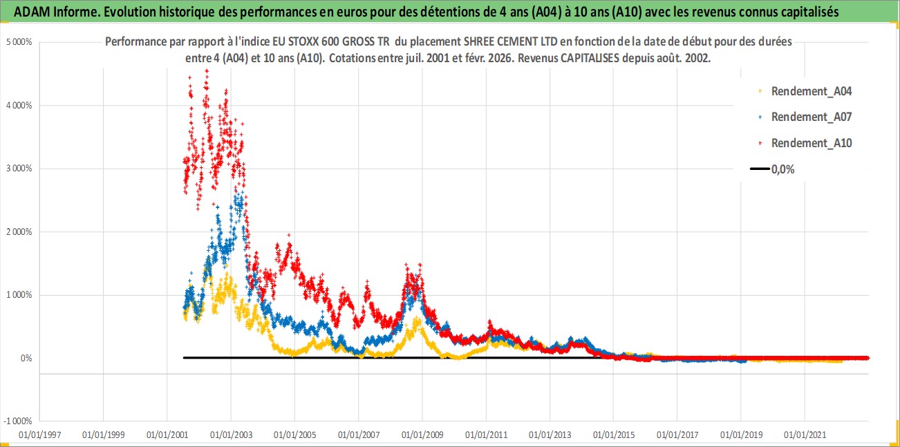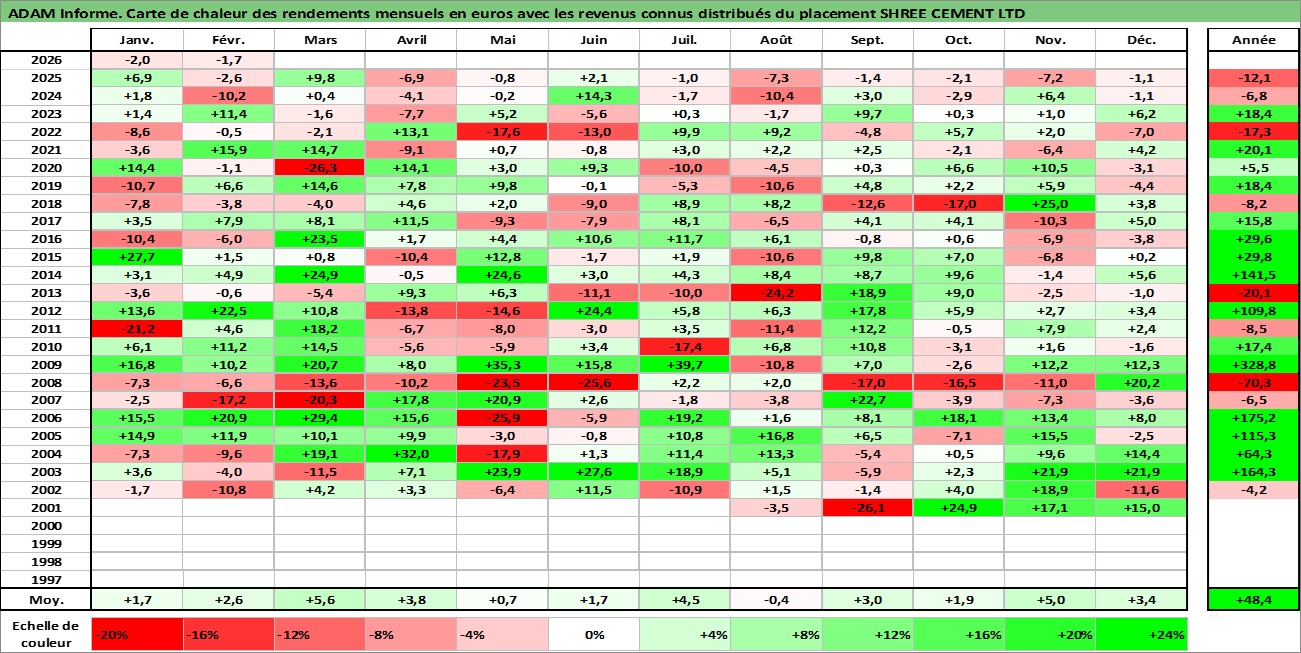Site dédié aux investisseursPage dédiée sur site financeAnalyse des valorisations hebdomadaires de l'action SHREE CEMENT LTD. Cet actif est cote en INR. Les valorisations sont en contrevaleur EURO et couvrent les semaines 2001W27 a 2026W09. Les revenus de cet actif financier sont pris en compte depuis la semaine 2002W33. La note globale ESG de cet actif est estimee a 6.0 (apres rebasage entre 0 et 20).