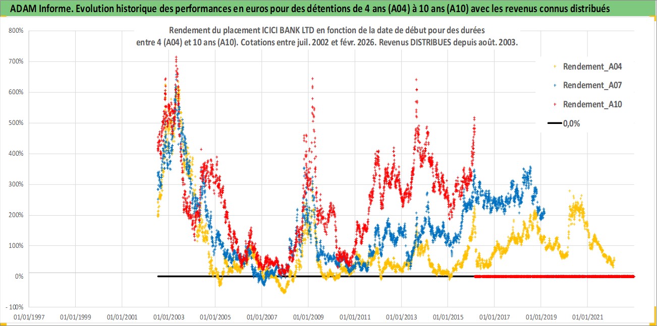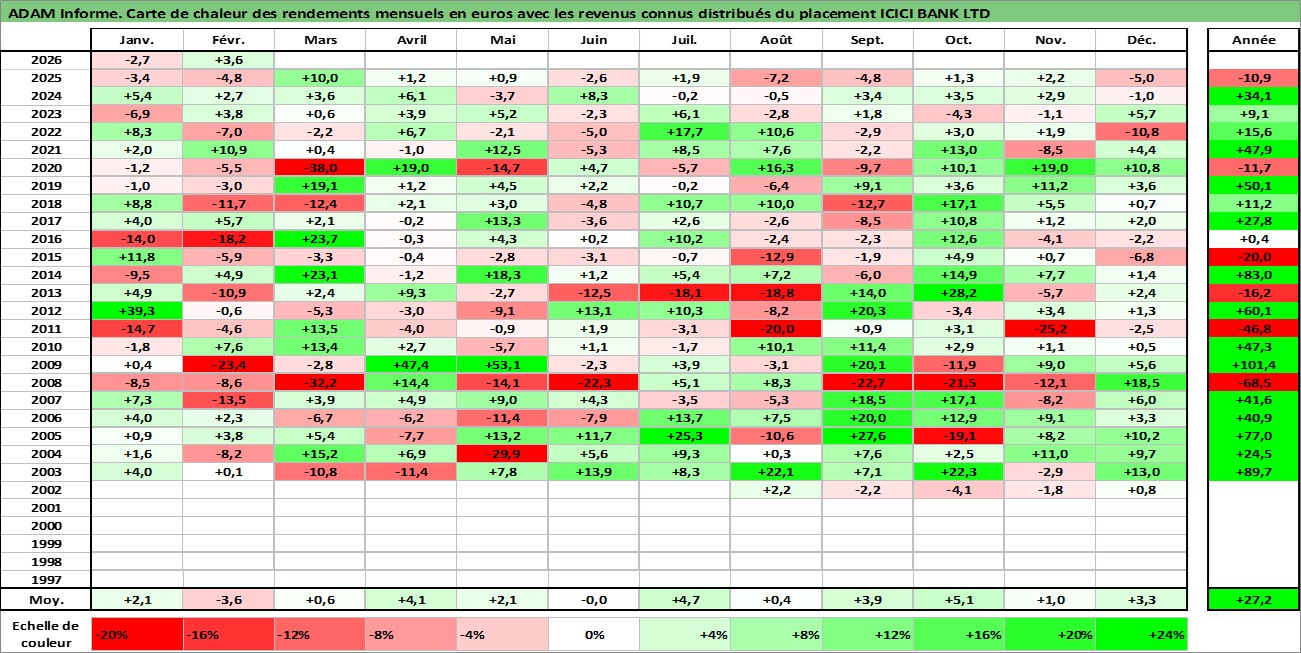 Site dédié aux investisseursPage dédiée sur site financeAnalyse des valorisations hebdomadaires de l'action ICICI BANK LTD. Cet actif est cote en INR. Les valorisations sont en contrevaleur EURO et couvrent les semaines 2002W27 a 2026W09. Les revenus de cet actif financier sont pris en compte depuis la semaine 2003W32. La note globale ESG de cet actif est estimee a 7.0 (apres rebasage entre 0 et 20).