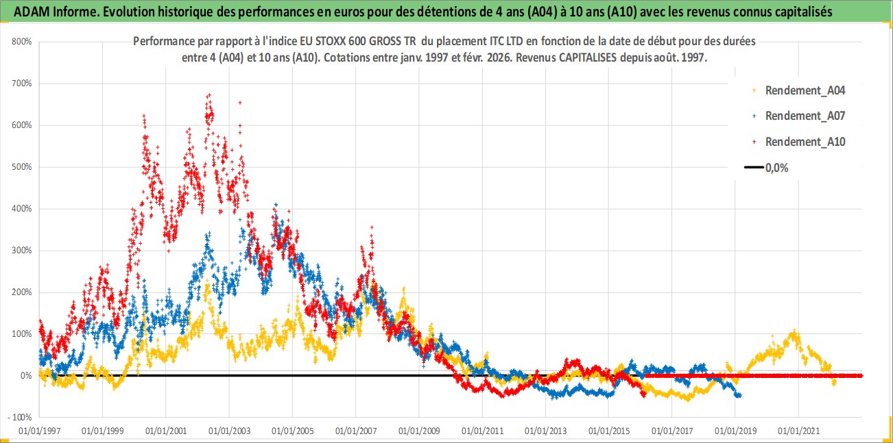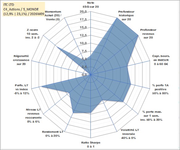 Site dédié aux investisseursPage dédiée sur site financeAnalyse des valorisations hebdomadaires de l'action ITC LTD. Cet actif est cote en INR. Les valorisations sont en contrevaleur EURO et couvrent les semaines 1997W01 a 2026W09. Les revenus de cet actif financier sont pris en compte depuis la semaine 1997W32. La note globale ESG de cet actif est estimee a 6.0 (apres rebasage entre 0 et 20).