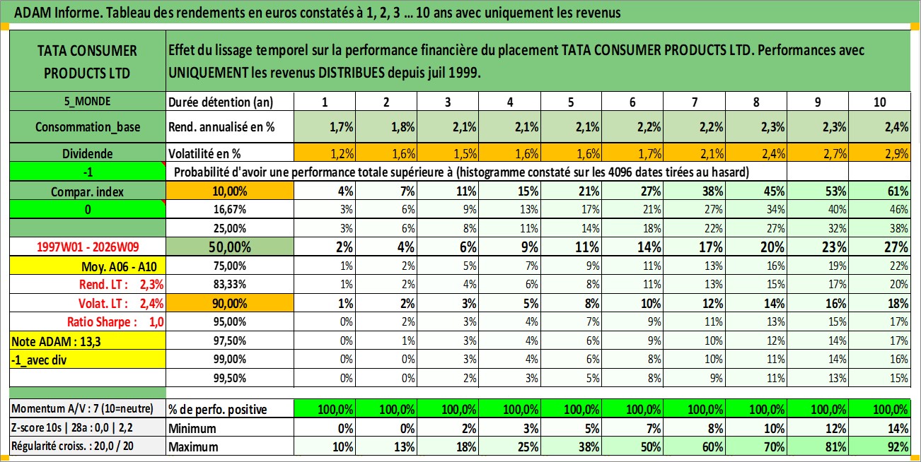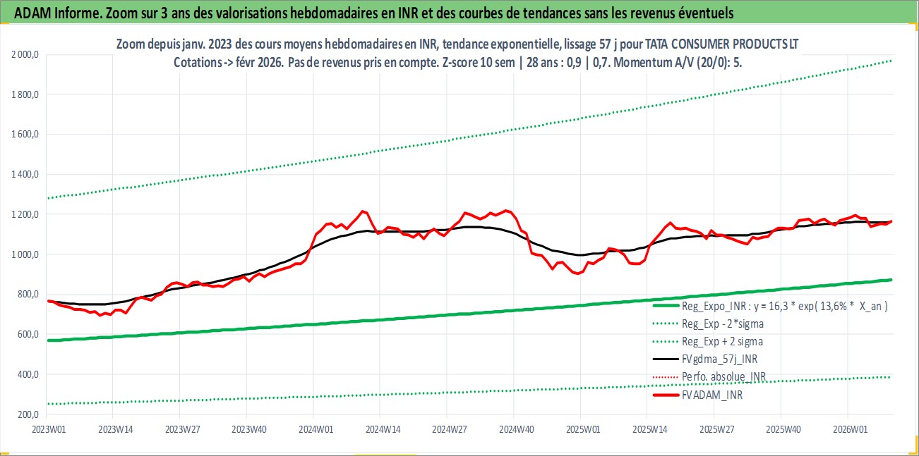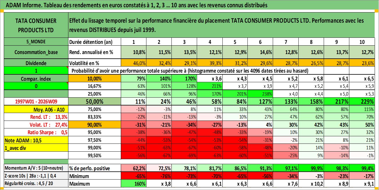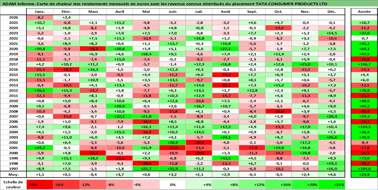 Site dédié aux investisseursPage dédiée sur site financeAnalyse des valorisations hebdomadaires de l'action TATA CONSUMER PRODUCTS LTD. Cet actif est cote en INR. Les valorisations sont en contrevaleur EURO et couvrent les semaines 1997W01 a 2026W09. Les revenus de cet actif financier sont pris en compte depuis la semaine 1999W29. La note ESG de cet actif n'est pas connue.