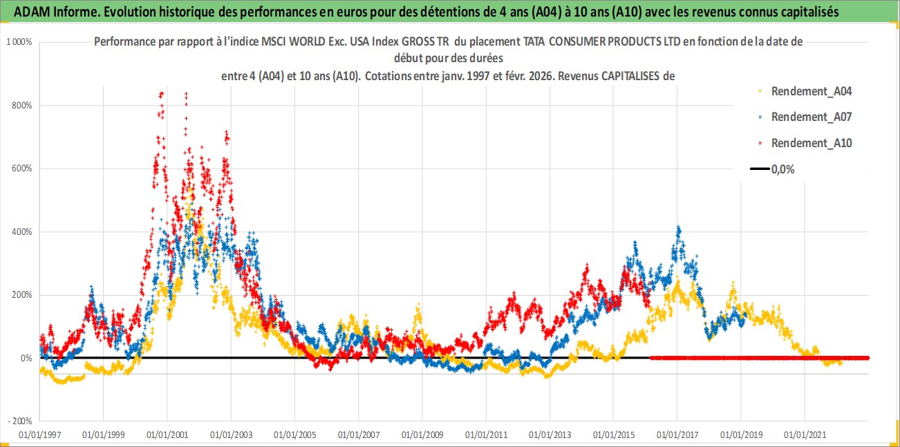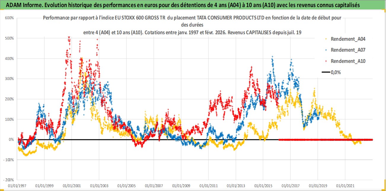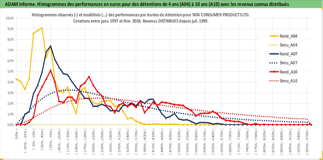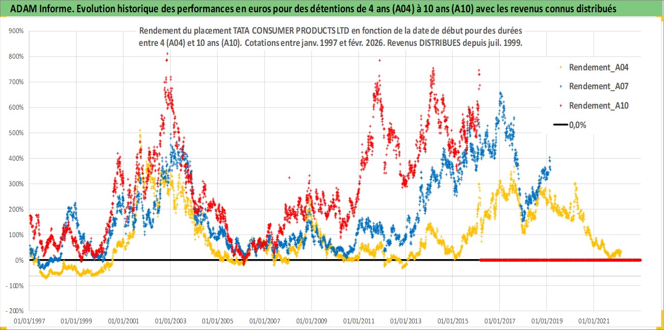 Site dédié aux investisseursPage dédiée sur site financeAnalyse des valorisations hebdomadaires de l'action TATA CONSUMER PRODUCTS LTD. Cet actif est cote en INR. Les valorisations sont en contrevaleur EURO et couvrent les semaines 1997W01 a 2026W09. Les revenus de cet actif financier sont pris en compte depuis la semaine 1999W29. La note ESG de cet actif n'est pas connue.