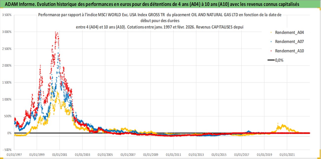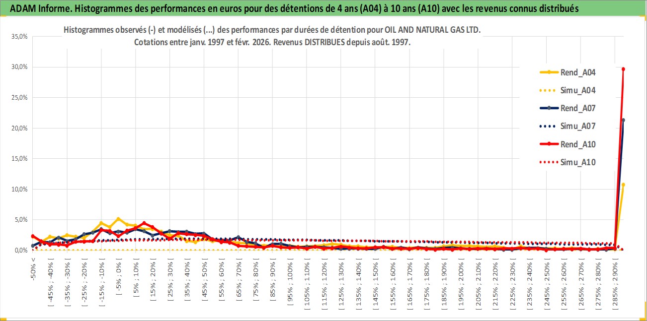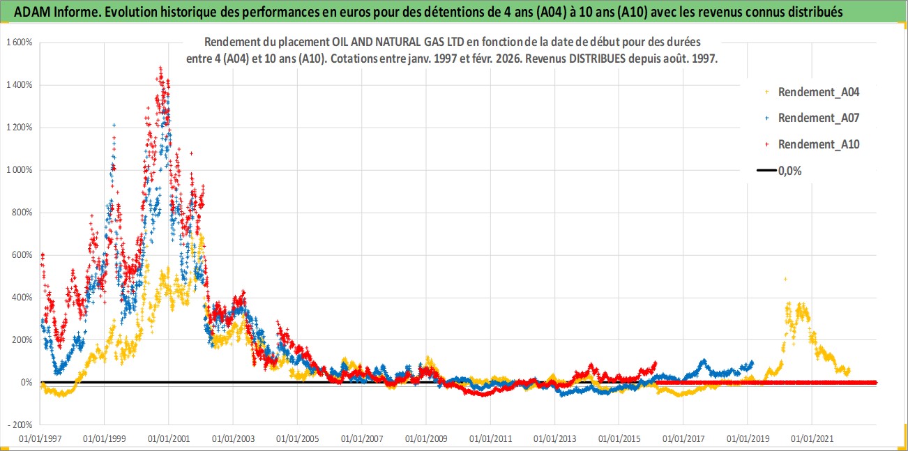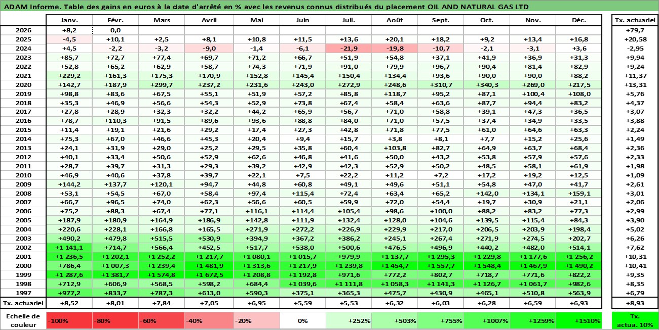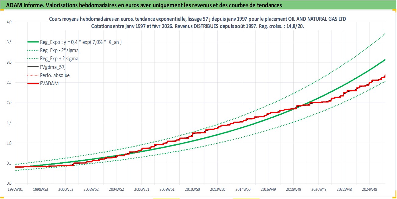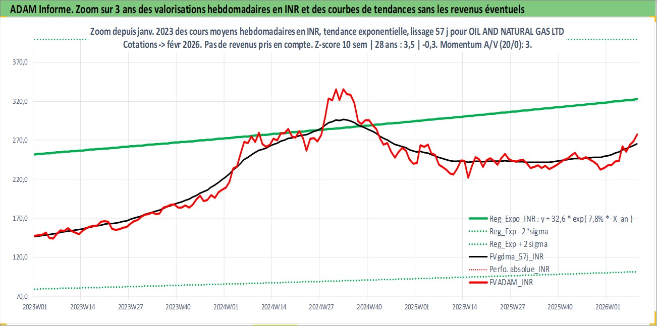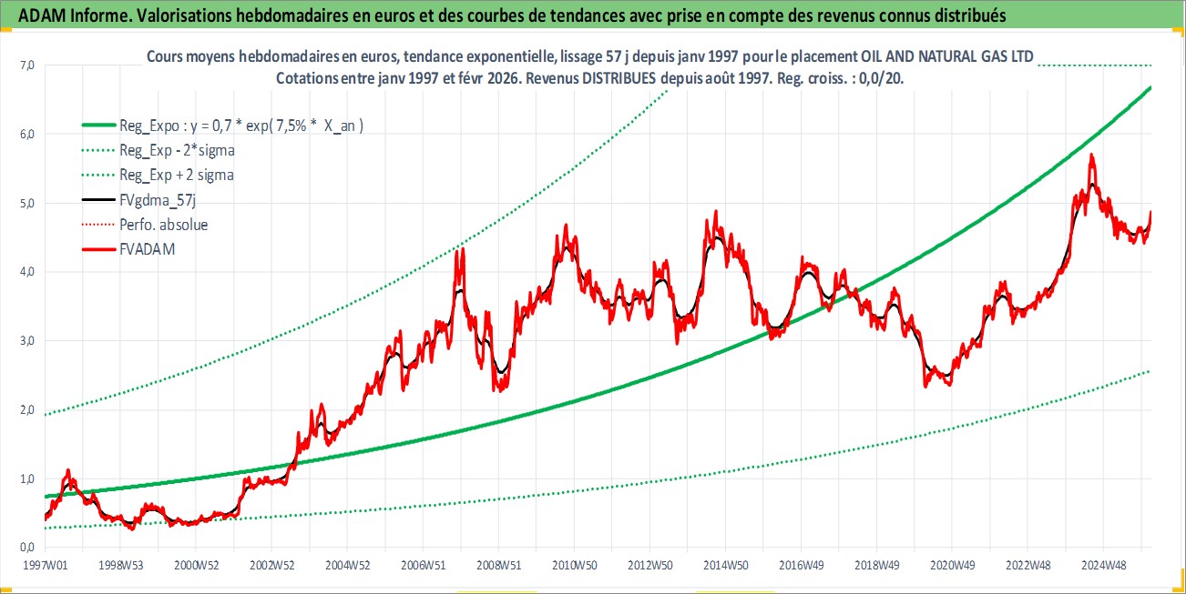 Site dédié aux investisseursPage dédiée sur site financeAnalyse des valorisations hebdomadaires de l'action OIL AND NATURAL GAS LTD. Cet actif est cote en INR. Les valorisations sont en contrevaleur EURO et couvrent les semaines 1997W01 a 2026W09. Les revenus de cet actif financier sont pris en compte depuis la semaine 1997W35. La note ESG de cet actif n'est pas connue.