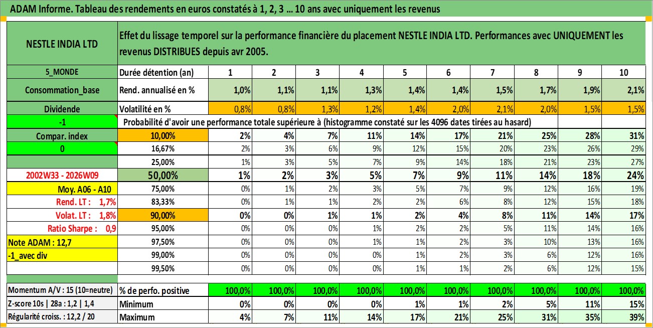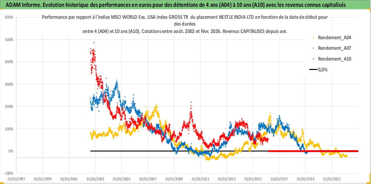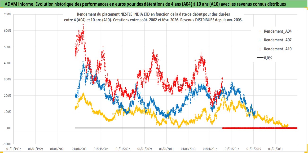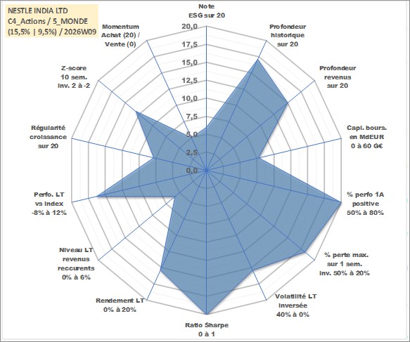 Site dédié aux investisseursPage dédiée sur site financeAnalyse des valorisations hebdomadaires de l'action NESTLE INDIA LTD. Cet actif est cote en INR. Les valorisations sont en contrevaleur EURO et couvrent les semaines 2002W33 a 2026W09. Les revenus de cet actif financier sont pris en compte depuis la semaine 2005W16. La note globale ESG de cet actif est estimee a 6.0 (apres rebasage entre 0 et 20).