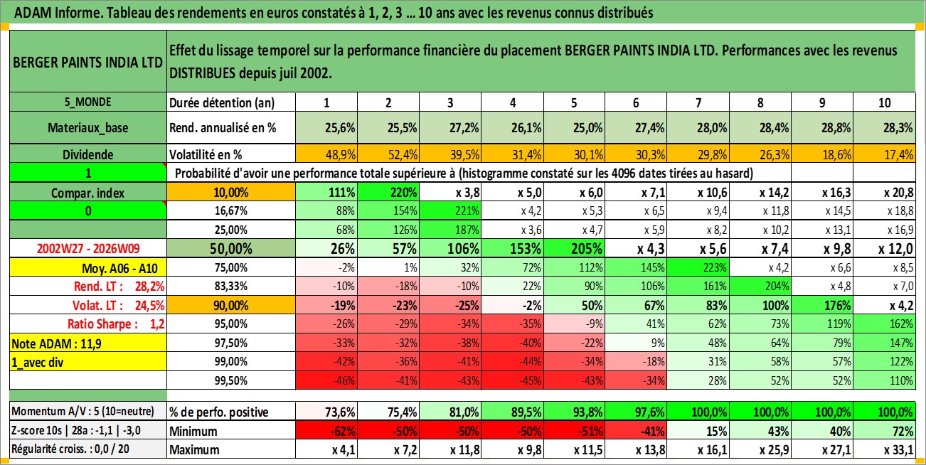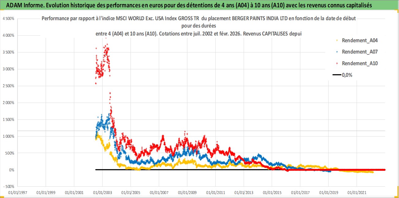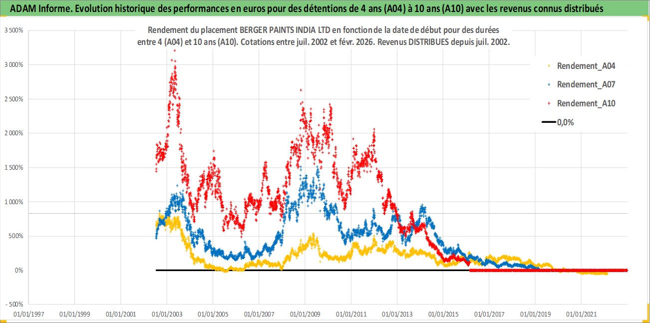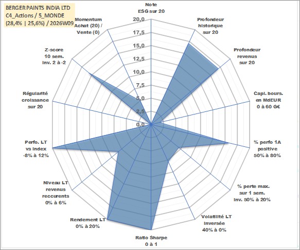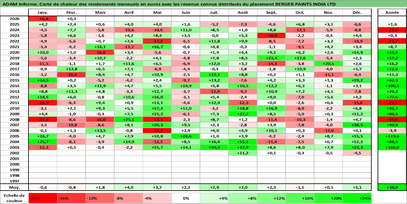 Site dédié aux investisseursPage dédiée sur site financeAnalyse des valorisations hebdomadaires de l'action BERGER PAINTS INDIA LTD. Cet actif est cote en INR. Les valorisations sont en contrevaleur EURO et couvrent les semaines 2002W27 a 2026W09. Les revenus de cet actif financier sont pris en compte depuis la semaine 2002W28. La note ESG de cet actif n'est pas connue.