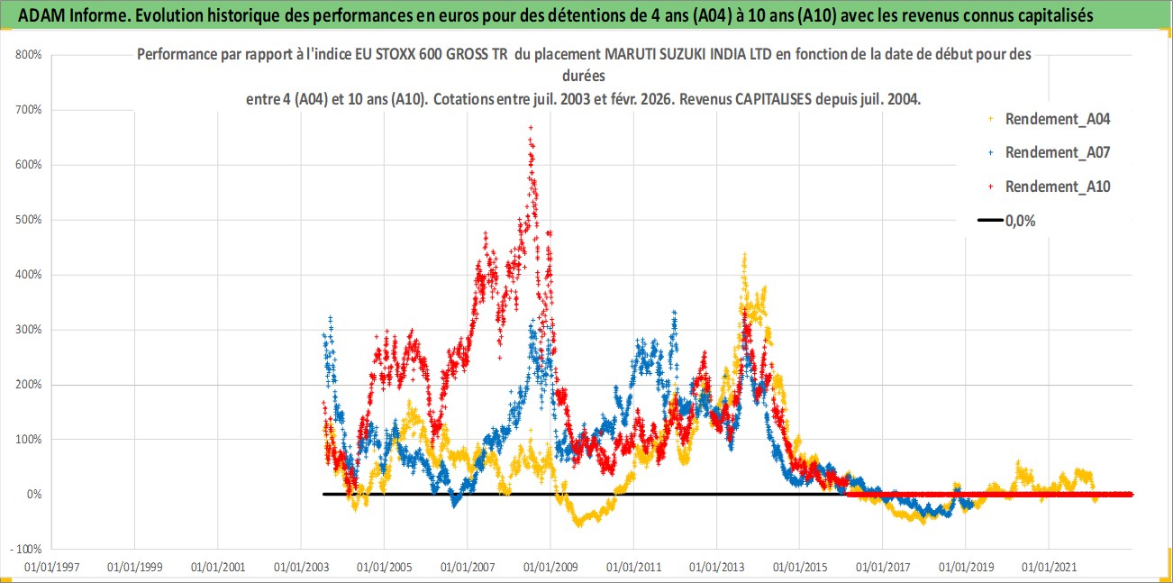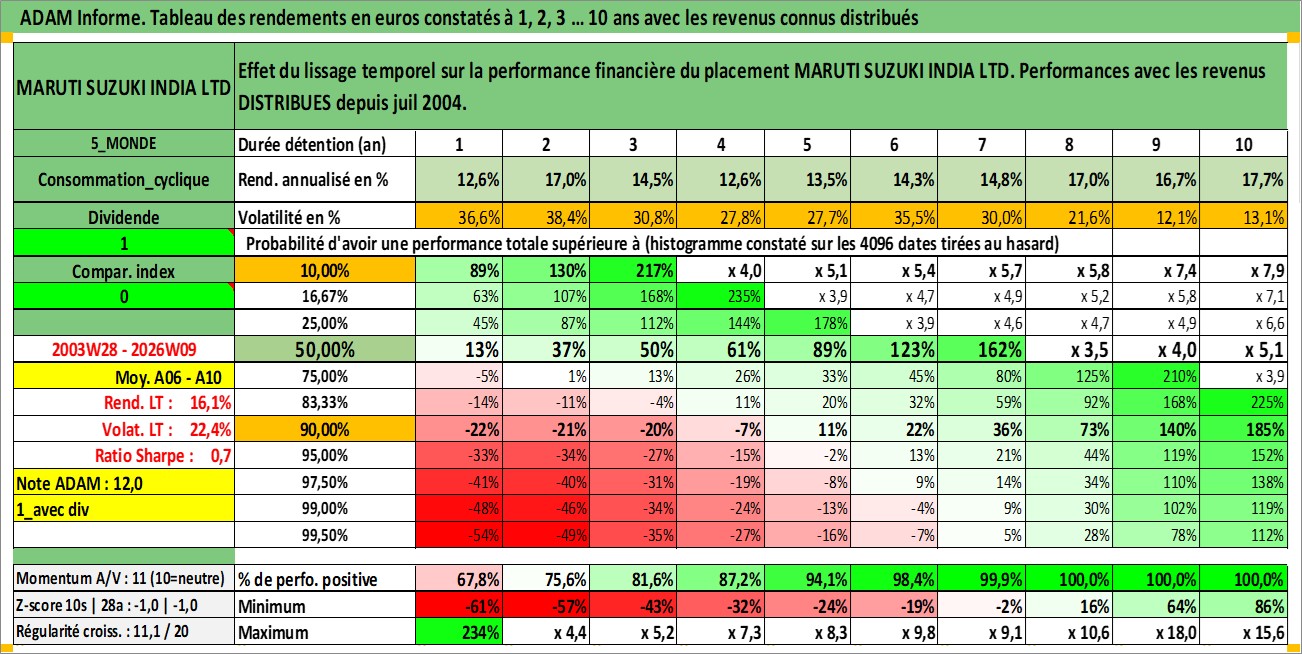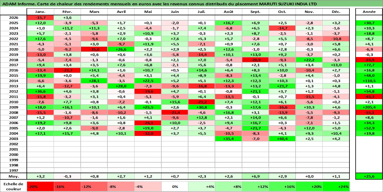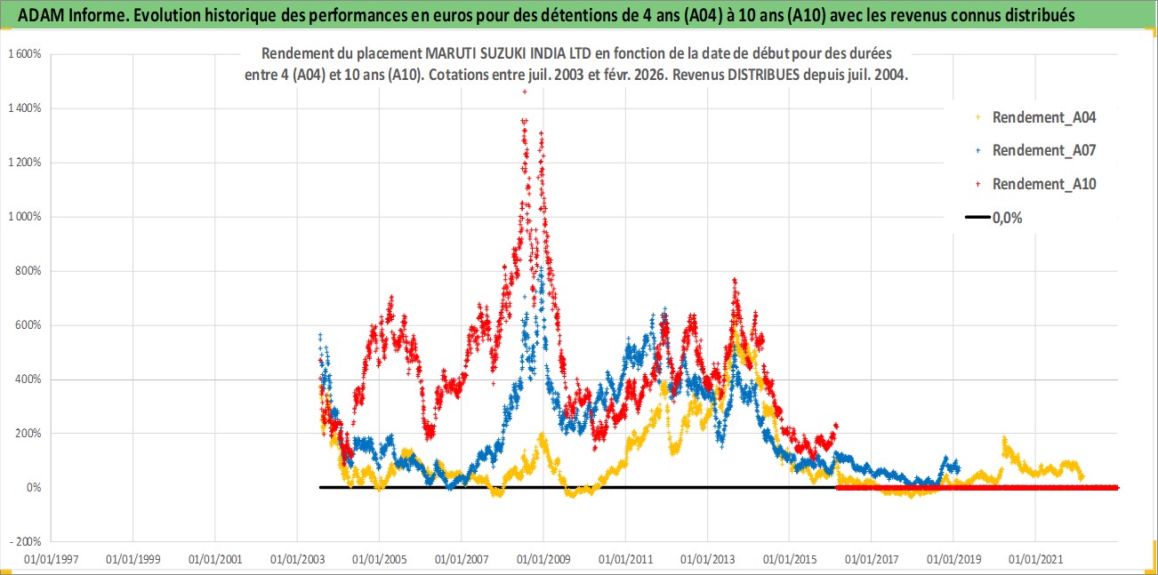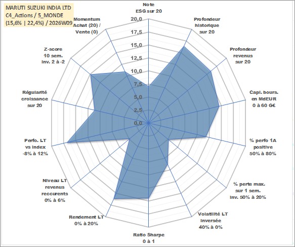 Site dédié aux investisseursPage dédiée sur site financeAnalyse des valorisations hebdomadaires de l'action MARUTI SUZUKI INDIA LTD. Cet actif est cote en INR. Les valorisations sont en contrevaleur EURO et couvrent les semaines 2003W28 a 2026W09. Les revenus de cet actif financier sont pris en compte depuis la semaine 2004W28. La note globale ESG de cet actif est estimee a 7.0 (apres rebasage entre 0 et 20).