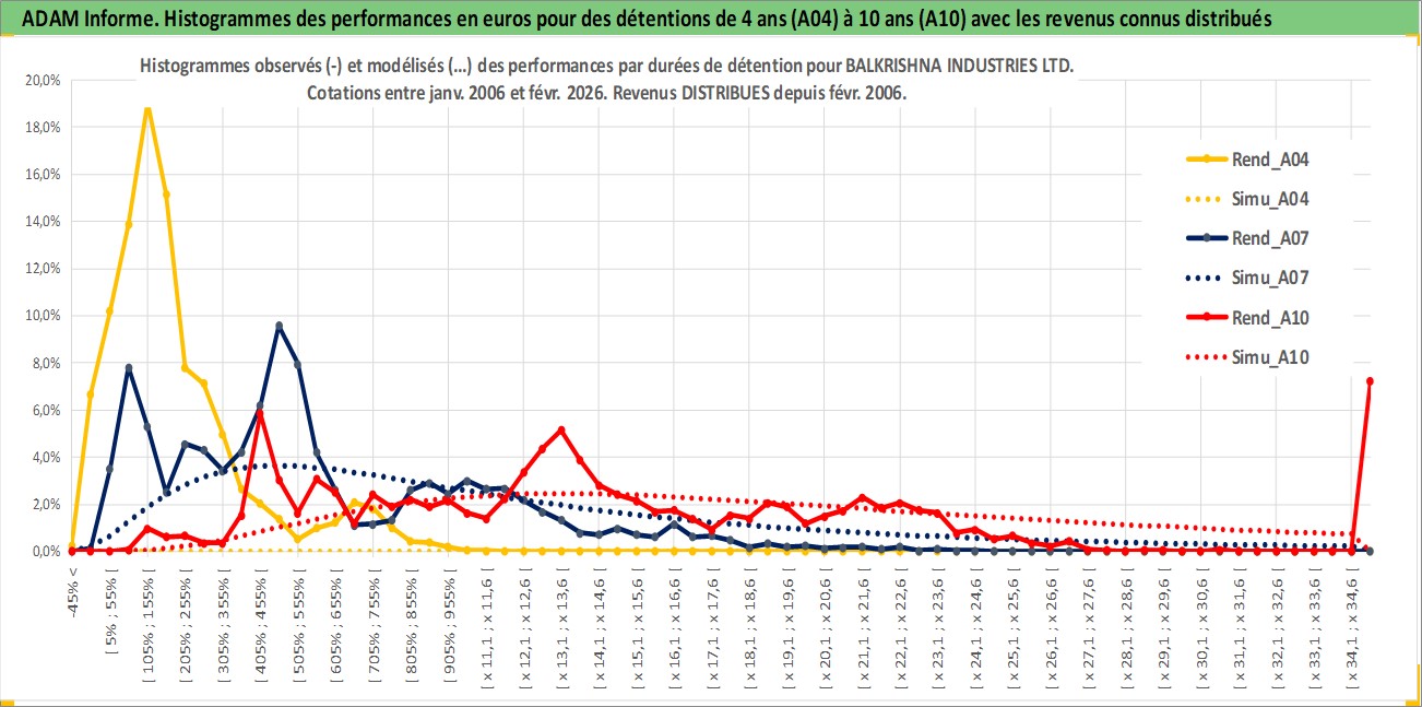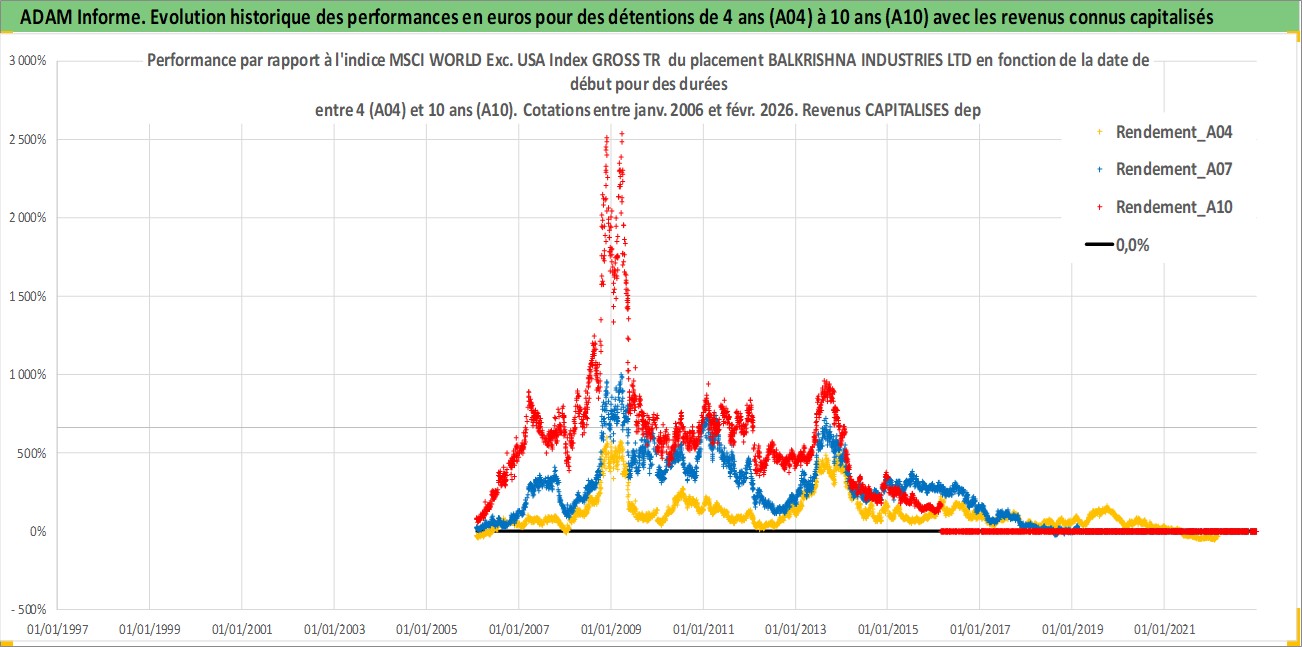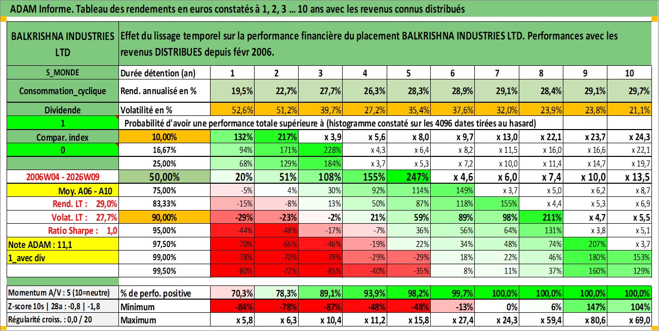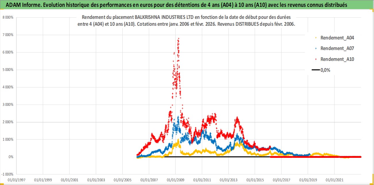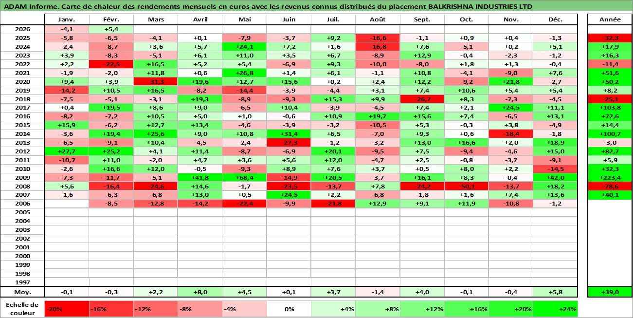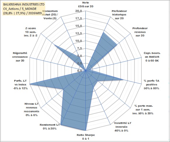 Site dédié aux investisseursPage dédiée sur site financeAnalyse des valorisations hebdomadaires de l'action BALKRISHNA INDUSTRIES LTD. Cet actif est cote en INR. Les valorisations sont en contrevaleur EURO et couvrent les semaines 2006W04 a 2026W09. Les revenus de cet actif financier sont pris en compte depuis la semaine 2006W06. La note ESG de cet actif n'est pas connue.