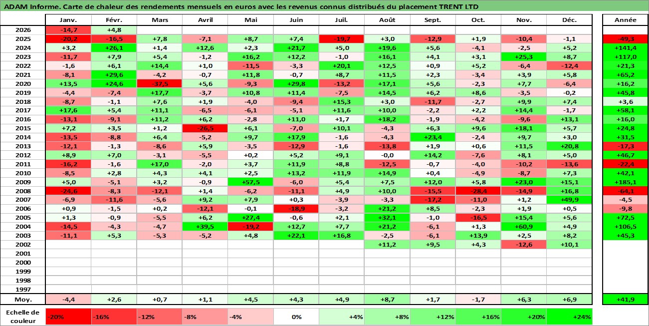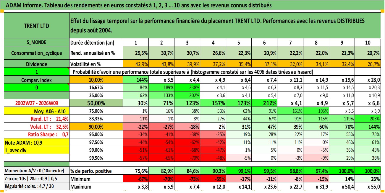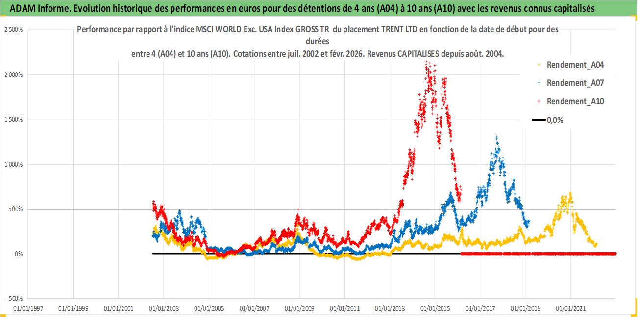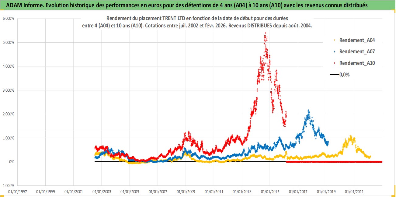 Site dédié aux investisseursPage dédiée sur site financeAnalyse des valorisations hebdomadaires de l'action TRENT LTD. Cet actif est cote en INR. Les valorisations sont en contrevaleur EURO et couvrent les semaines 2002W27 a 2026W09. Les revenus de cet actif financier sont pris en compte depuis la semaine 2004W32. La note ESG de cet actif n'est pas connue.