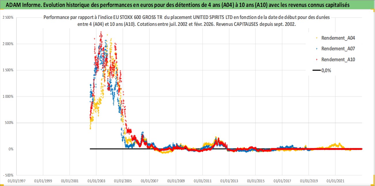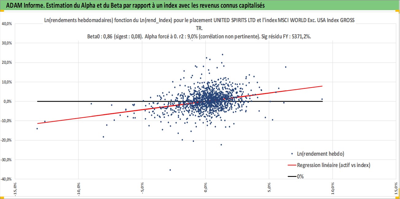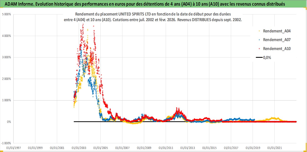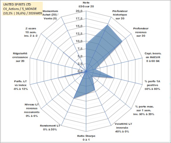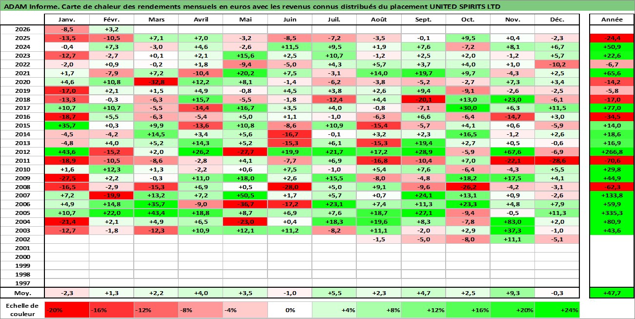 Site dédié aux investisseursPage dédiée sur site financeAnalyse des valorisations hebdomadaires de l'action UNITED SPIRITS LTD. Cet actif est cote en INR. Les valorisations sont en contrevaleur EURO et couvrent les semaines 2002W27 a 2026W09. Les revenus de cet actif financier sont pris en compte depuis la semaine 2002W37. La note globale ESG de cet actif est estimee a 9.0 (apres rebasage entre 0 et 20).