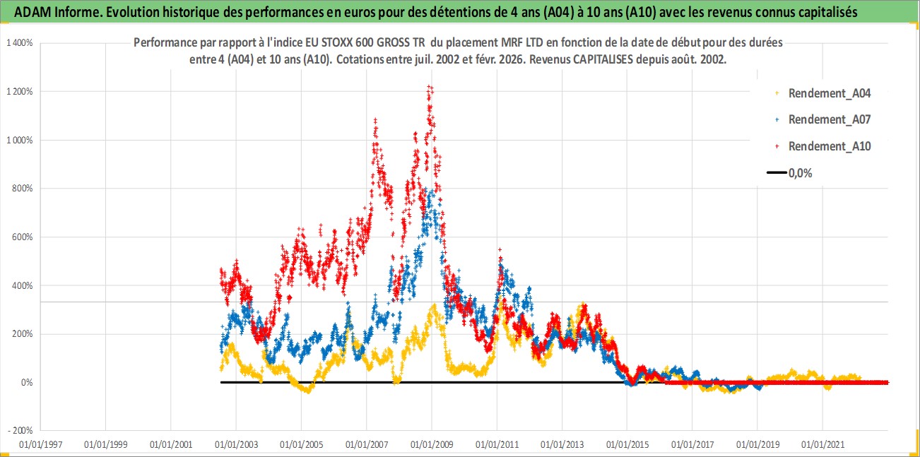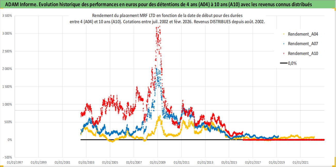 Site dédié aux investisseursPage dédiée sur site financeAnalyse des valorisations hebdomadaires de l'action MRF LTD. Cet actif est cote en INR. Les valorisations sont en contrevaleur EURO et couvrent les semaines 2002W27 a 2026W09. Les revenus de cet actif financier sont pris en compte depuis la semaine 2002W32. La note ESG de cet actif n'est pas connue.