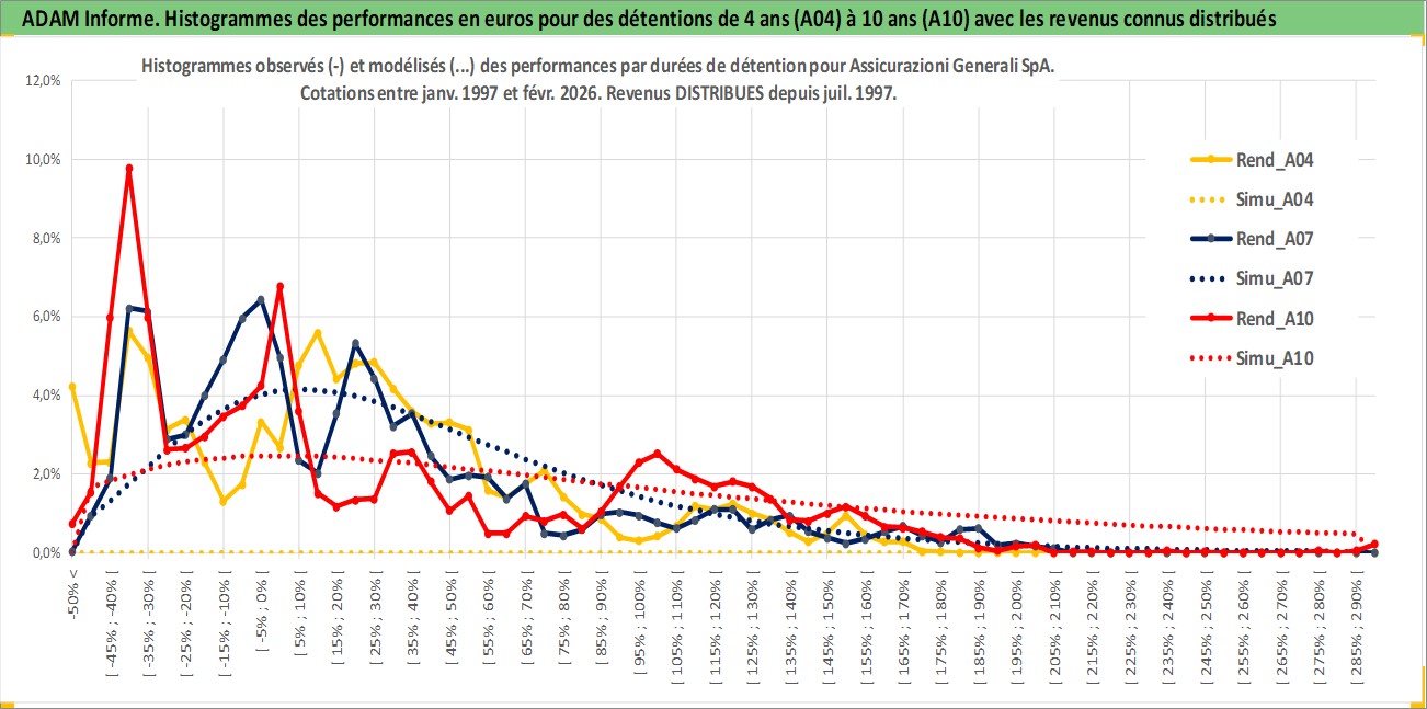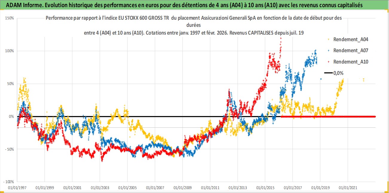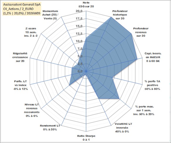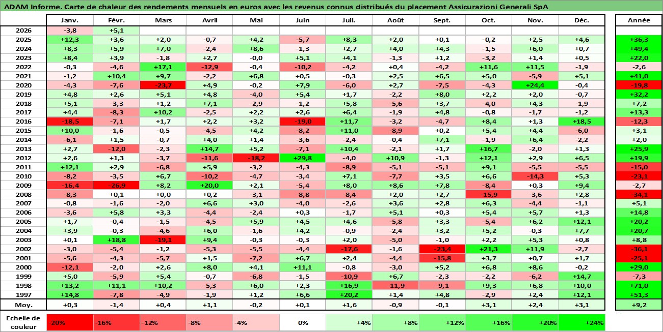 Site dédié aux investisseursPage dédiée sur site financeAnalyse des valorisations hebdomadaires de l'action Assicurazioni Generali SpA. Cet actif est cote en EUR. Les valorisations couvrent les semaines 1997W01 a 2026W09. Les revenus de cet actif financier sont pris en compte depuis la semaine 1997W30. La note globale ESG de cet actif est estimee a 11.0 (apres rebasage entre 0 et 20).