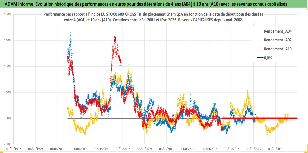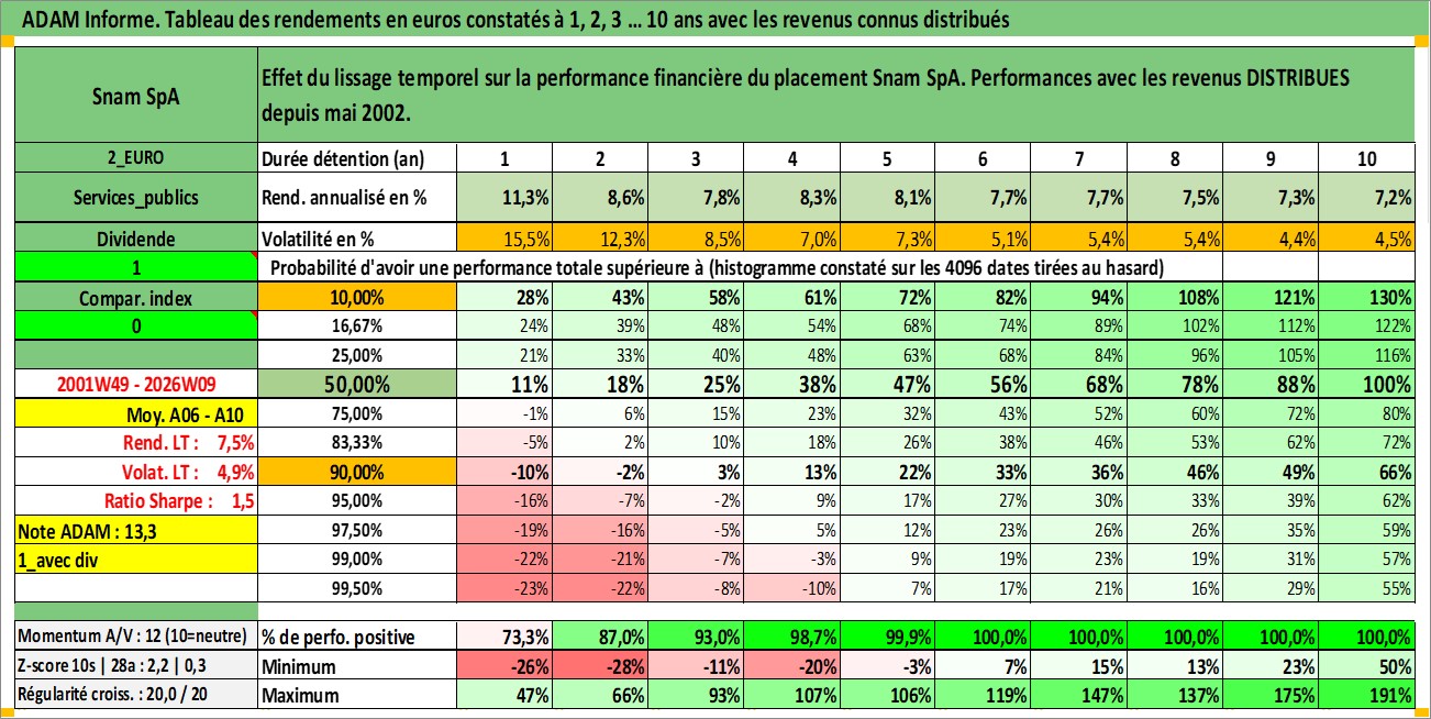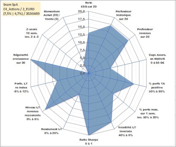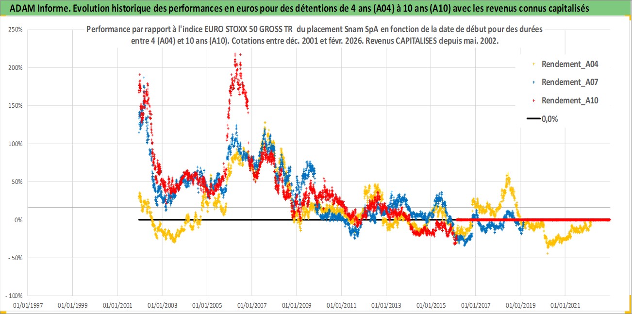 Site dédié aux investisseursPage dédiée sur site financeAnalyse des valorisations hebdomadaires de l'action Snam SpA. Cet actif est cote en EUR. Les valorisations couvrent les semaines 2001W49 a 2026W09. Les revenus de cet actif financier sont pris en compte depuis la semaine 2002W21. La note globale ESG de cet actif est estimee a 13.0 (apres rebasage entre 0 et 20).