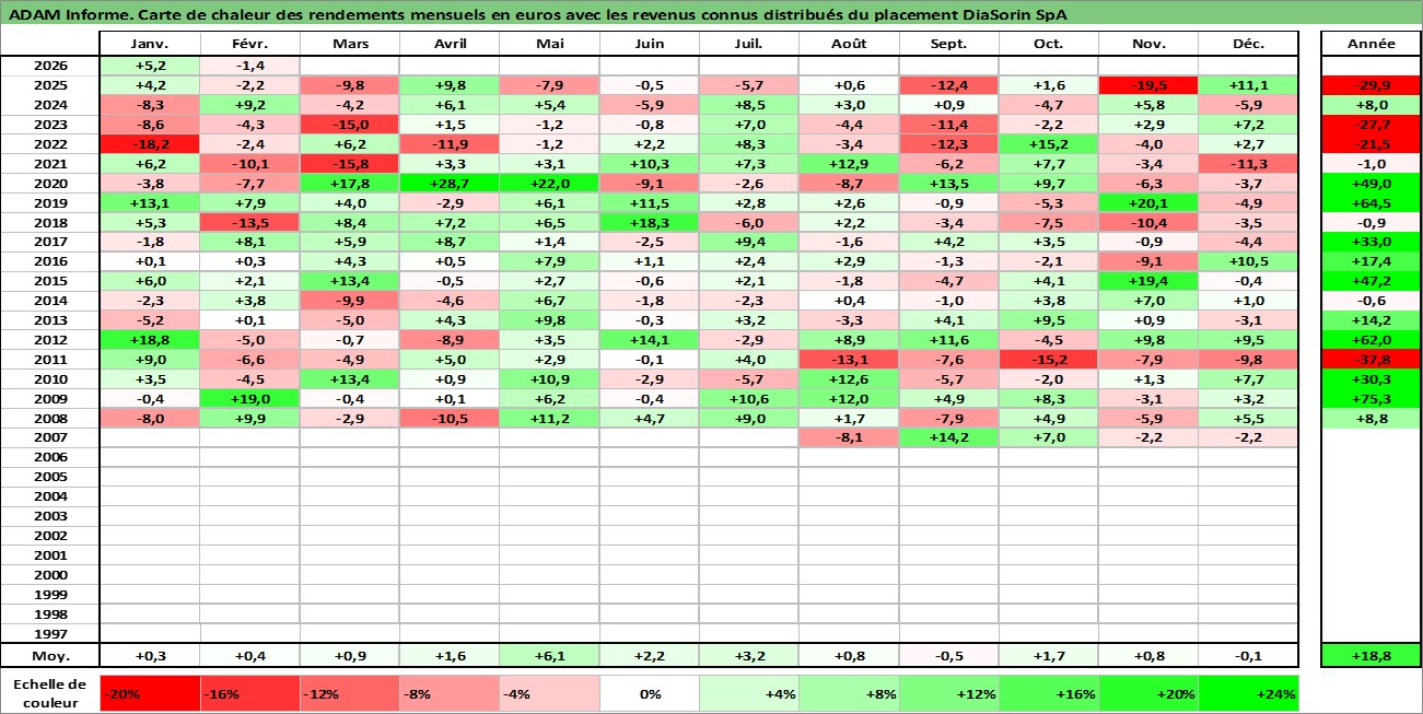 Site dédié aux investisseursPage dédiée sur site financeAnalyse des valorisations hebdomadaires de l'action DiaSorin SpA. Cet actif est cote en EUR. Les valorisations couvrent les semaines 2007W29 a 2026W09. Les revenus de cet actif financier sont pris en compte depuis la semaine 2008W29. La note ESG de cet actif n'est pas connue.