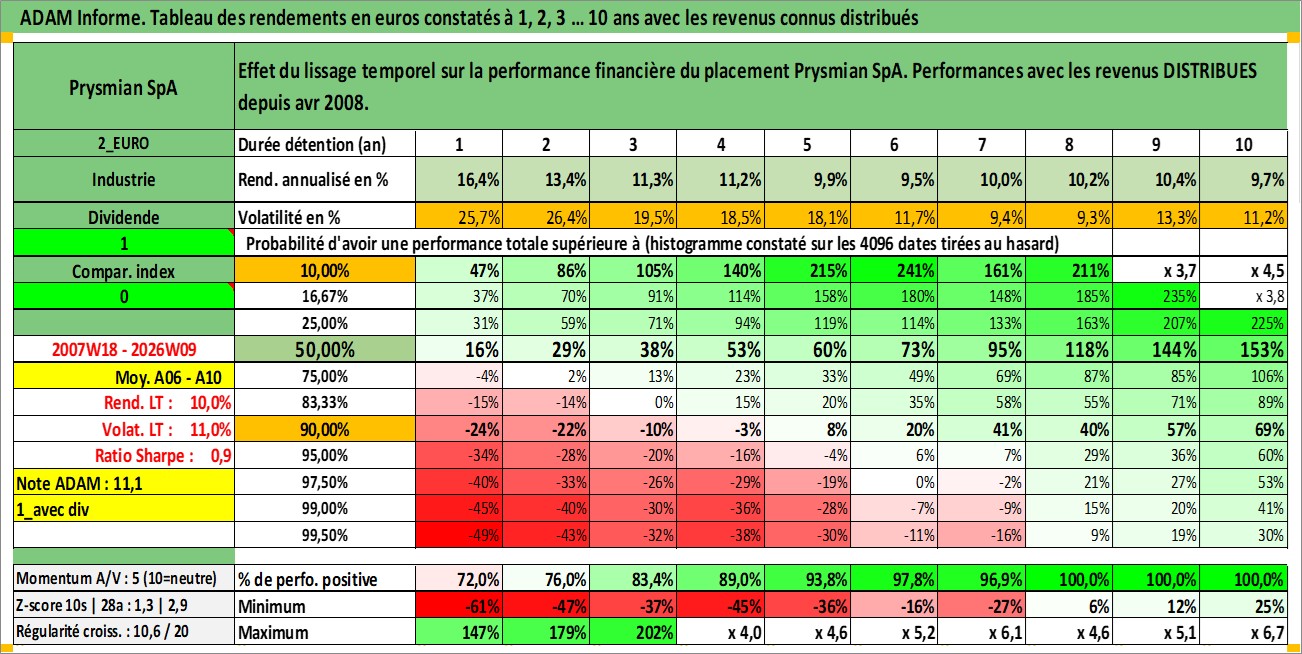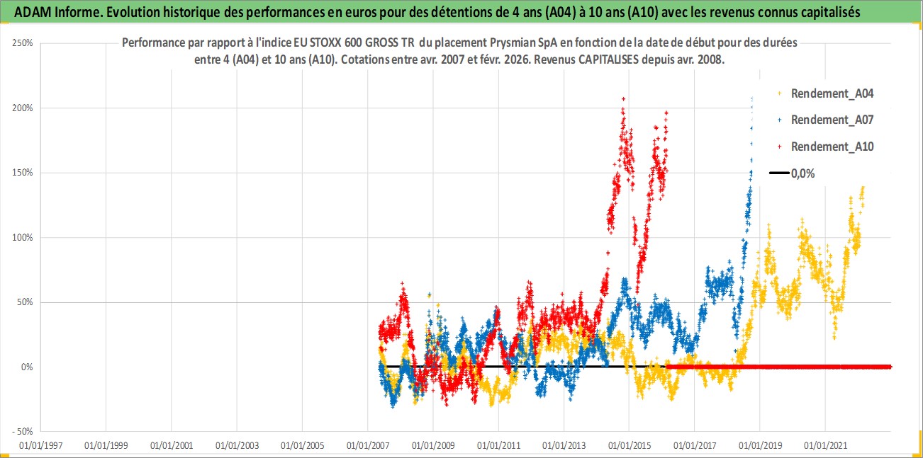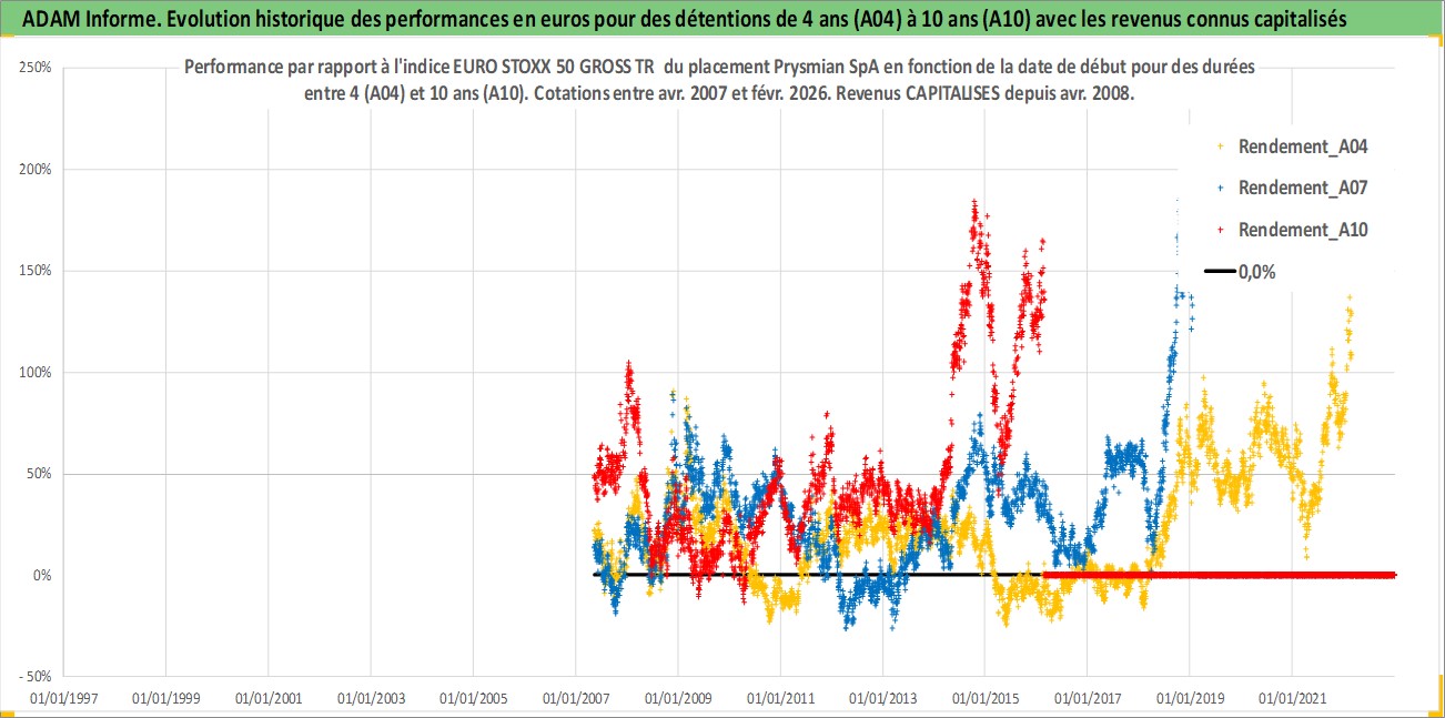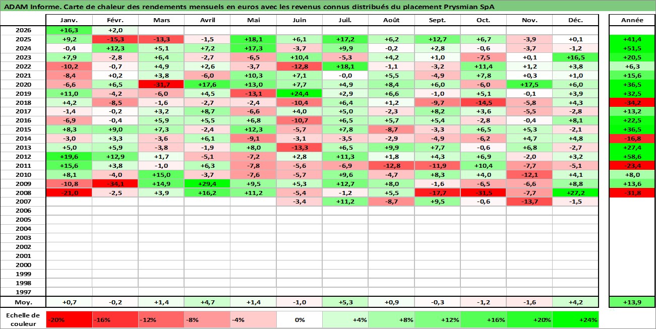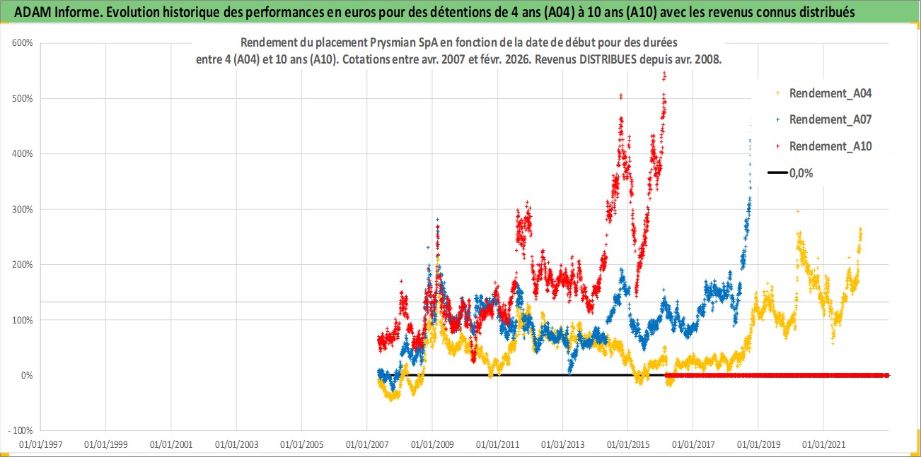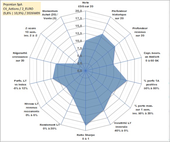 Site dédié aux investisseursPage dédiée sur site financeAnalyse des valorisations hebdomadaires de l'action Prysmian SpA. Cet actif est cote en EUR. Les valorisations couvrent les semaines 2007W18 a 2026W09. Les revenus de cet actif financier sont pris en compte depuis la semaine 2008W17. La note globale ESG de cet actif est estimee a 10.0 (apres rebasage entre 0 et 20).