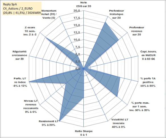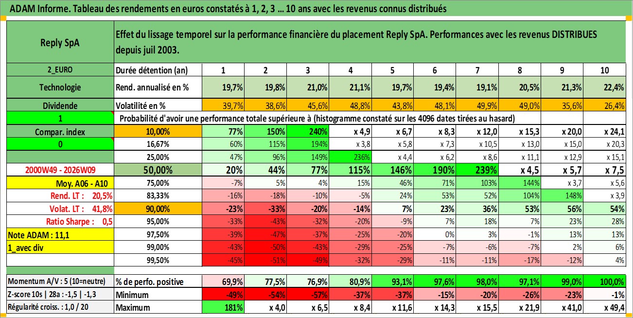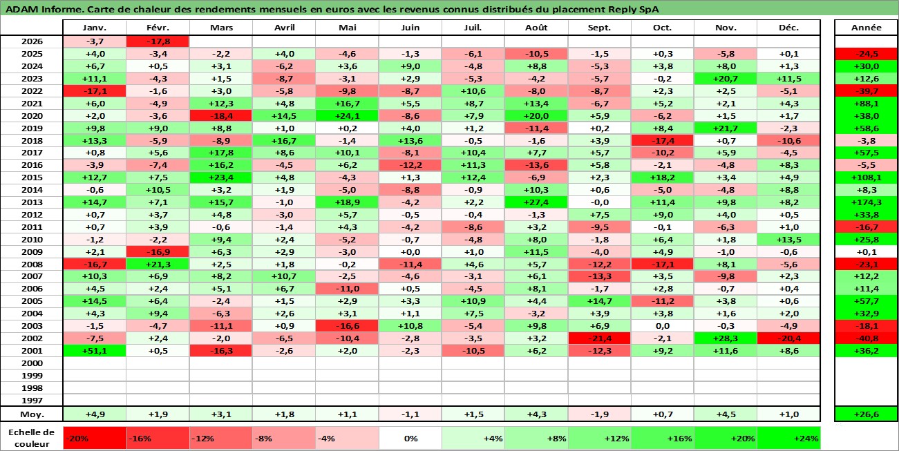 Site dédié aux investisseursPage dédiée sur site financeAnalyse des valorisations hebdomadaires de l'action Reply SpA. Cet actif est cote en EUR. Les valorisations couvrent les semaines 2000W49 a 2026W09. Les revenus de cet actif financier sont pris en compte depuis la semaine 2003W28. La note ESG de cet actif n'est pas connue.